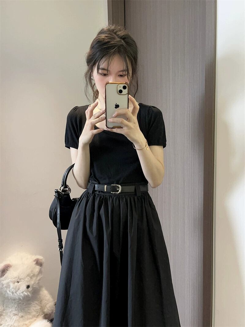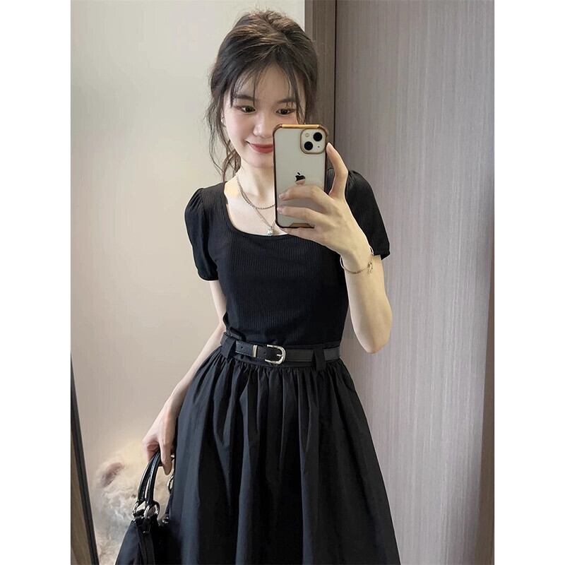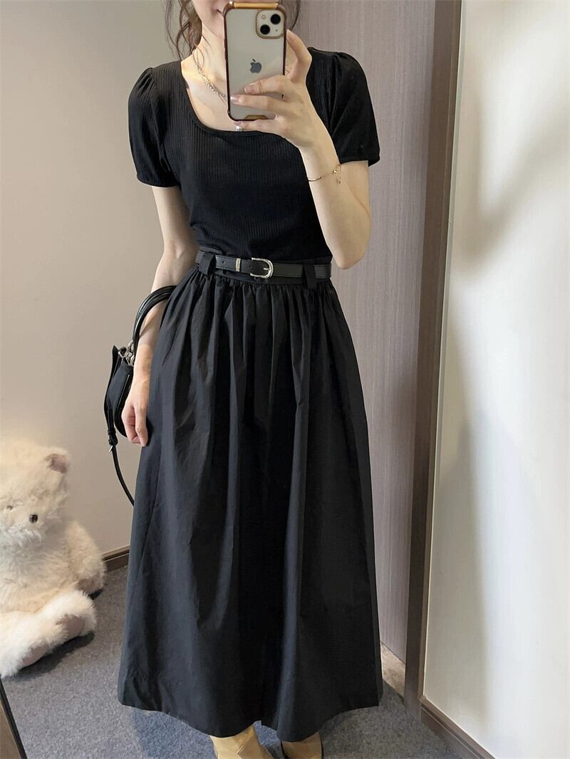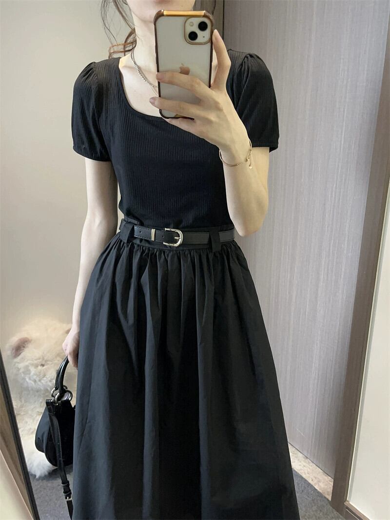 スクエアカラーステッチフェイクツーピースドレス夏の新しいレトロな気質一言黒のミドル丈スカート婦人服 ブラック サマー 夏物 スクウェア missk4876216699