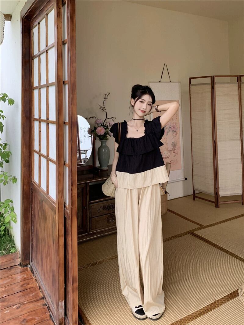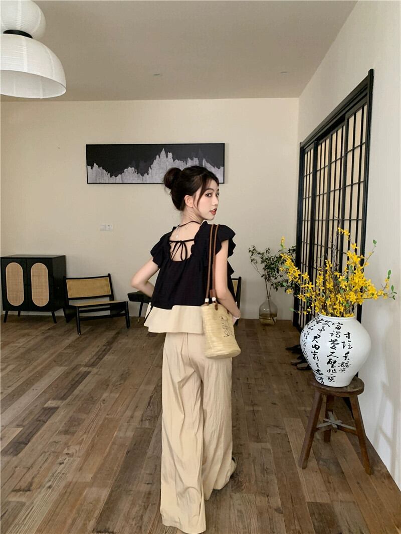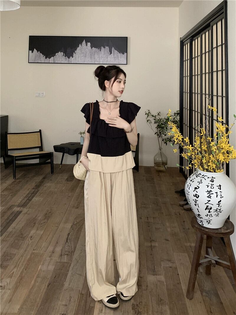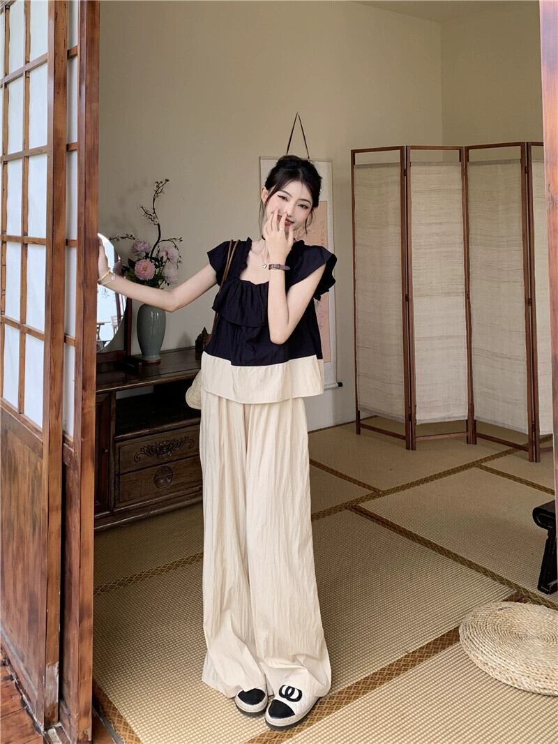 コントラストカラースプライシングスクエアカラー半袖シャツ夏2023新しい気質デザインセンスハイウエストカジュアルパンツスーツ女性 ハイウェスト サマー 夏物 スクウェア missk78307669456