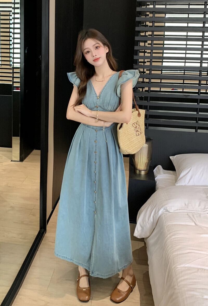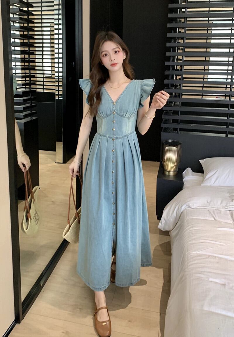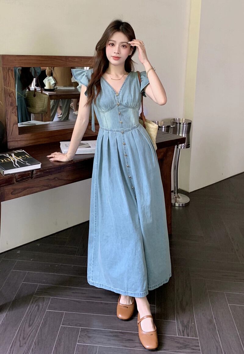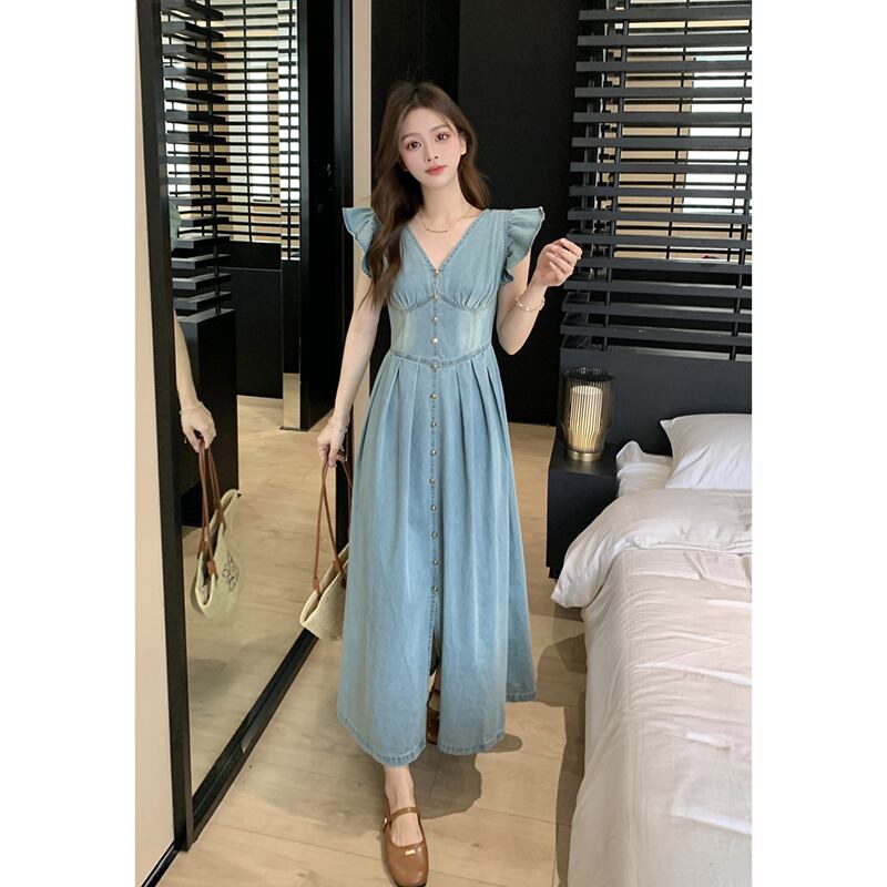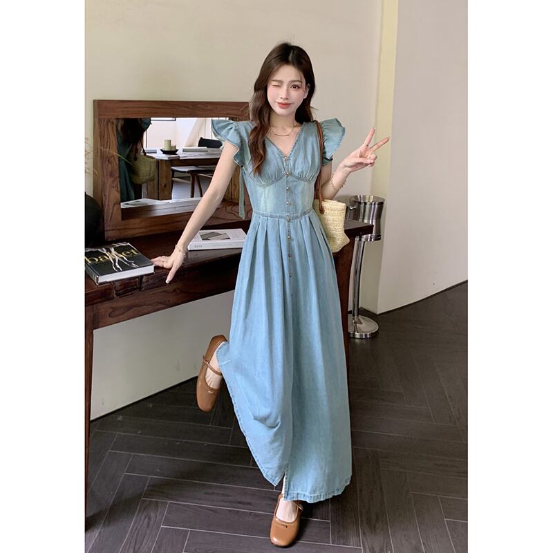 Vネックフライングスリーブデニムドレスレディース夏新レトロフレンチファッションウエスト痩身デザインセンスロングスカート サマー 夏物 missk10492047364