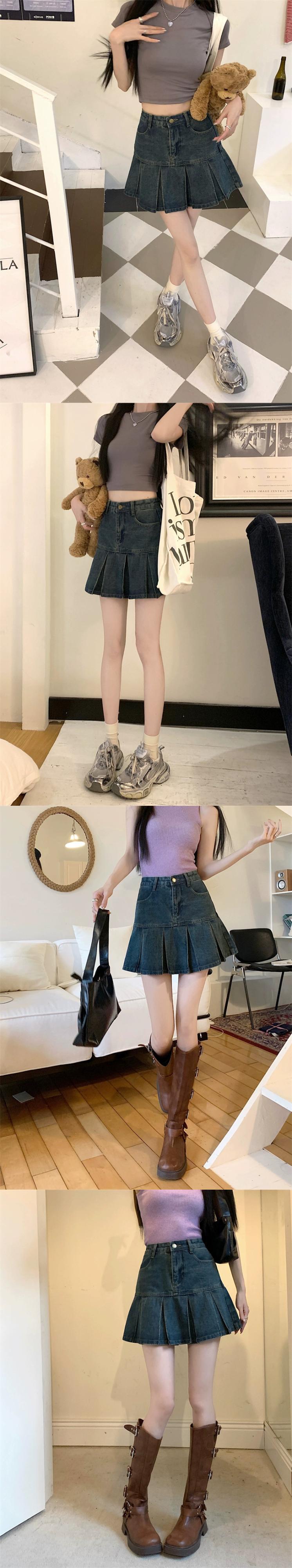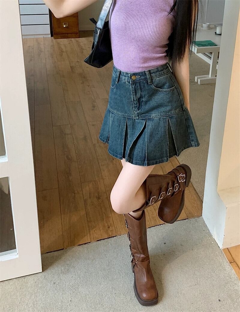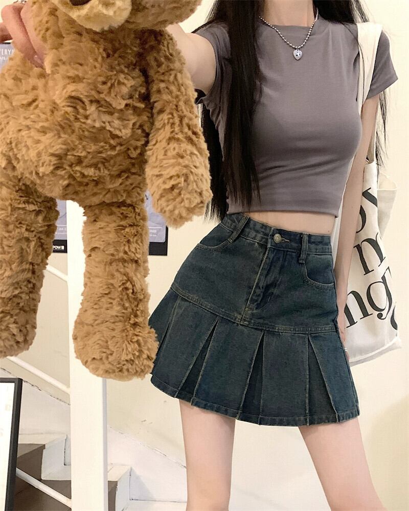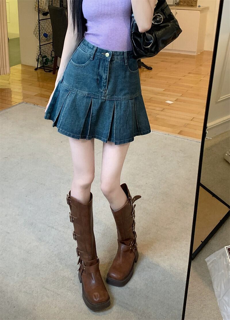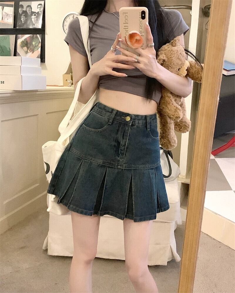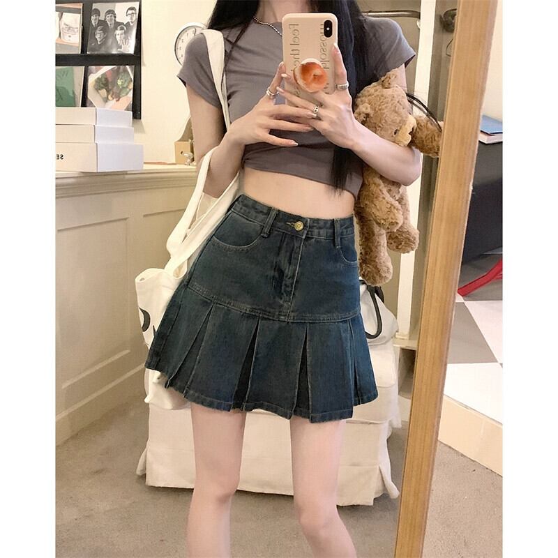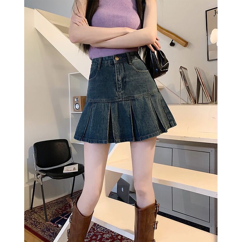 ウエストプリーツデニムスカートレディース夏新レトロ痩身ウォッシュデザインセンスaラインバッグヒップショートスカート サマー 夏物 missk11557656414