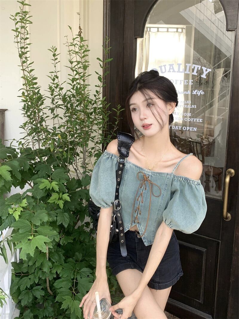 夏レトロ 2023 新しいデザインセンスストラップショートセクションスリムフィットスリム一言ショルダーパフスリーブデニムシャツ女性 サマー 夏物 missk75115147124