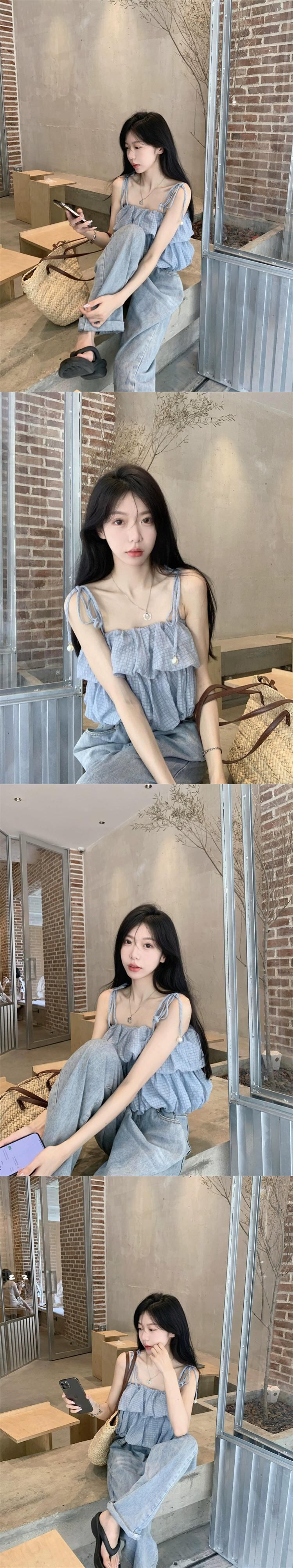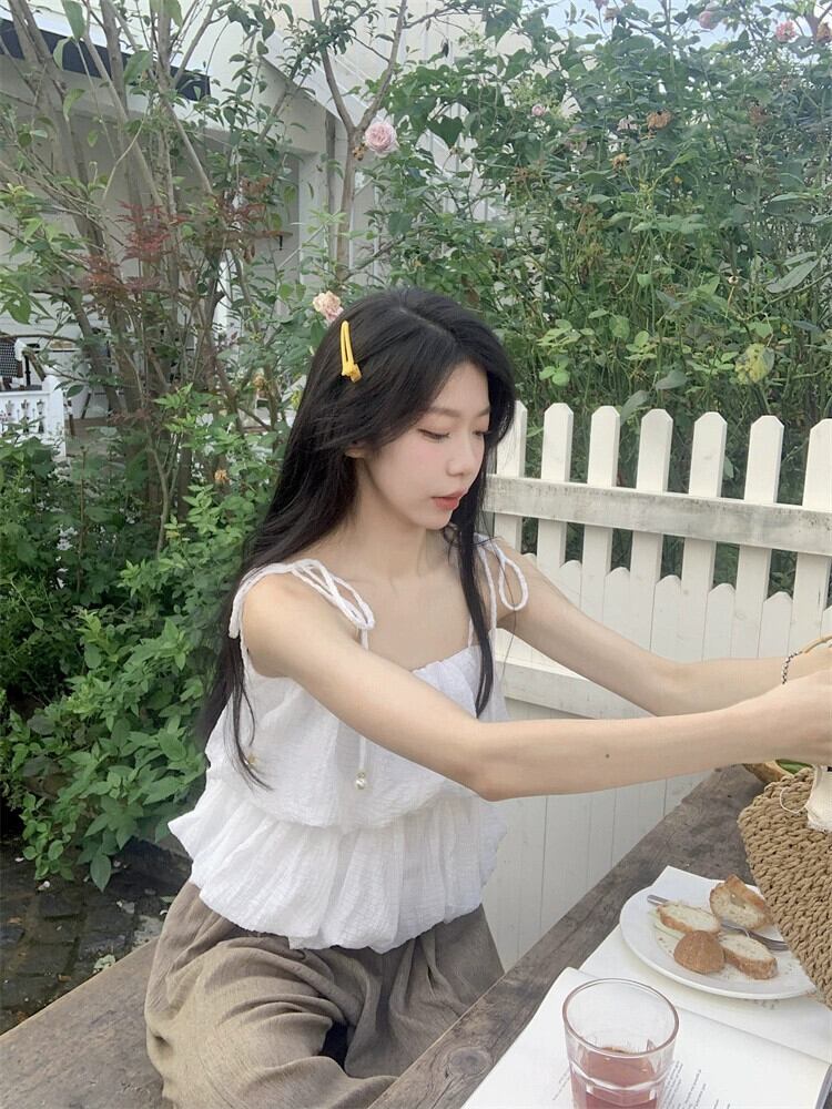 甘い風フリルノースリーブシャツ女性の夏の新しいフレンチデザインセンスニッチストラップスプライシングサスペンダートップ 大人ガーリー スウィート キュート カジュアル サマー 夏物 missk21958395028