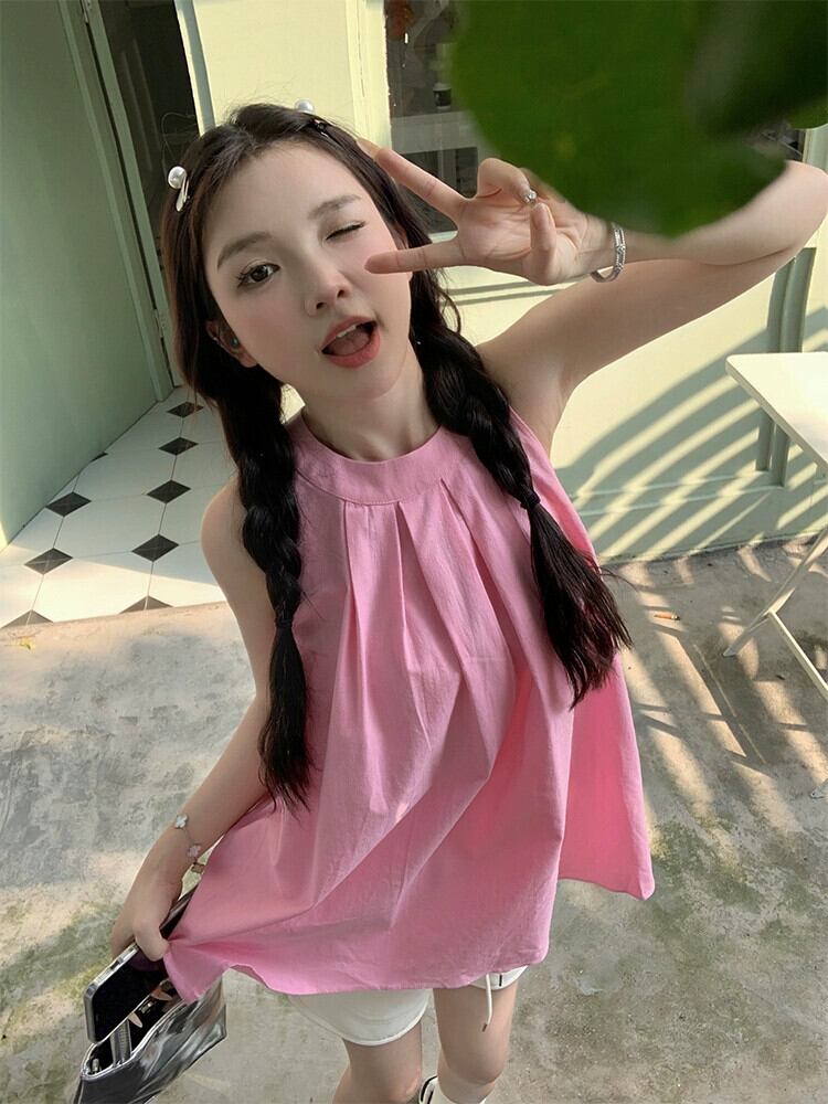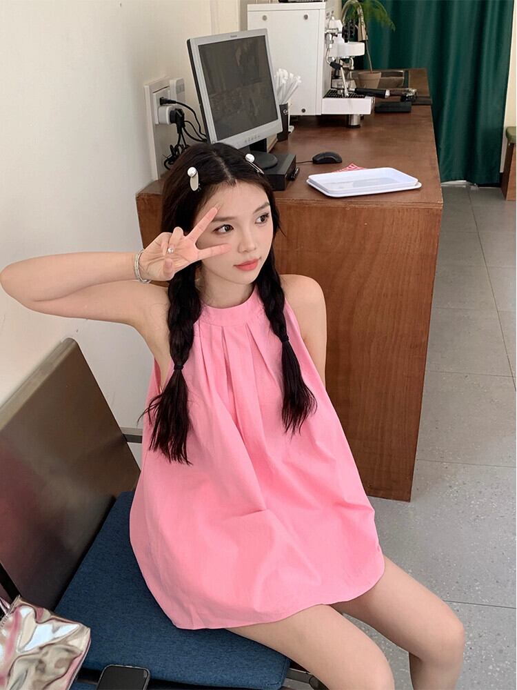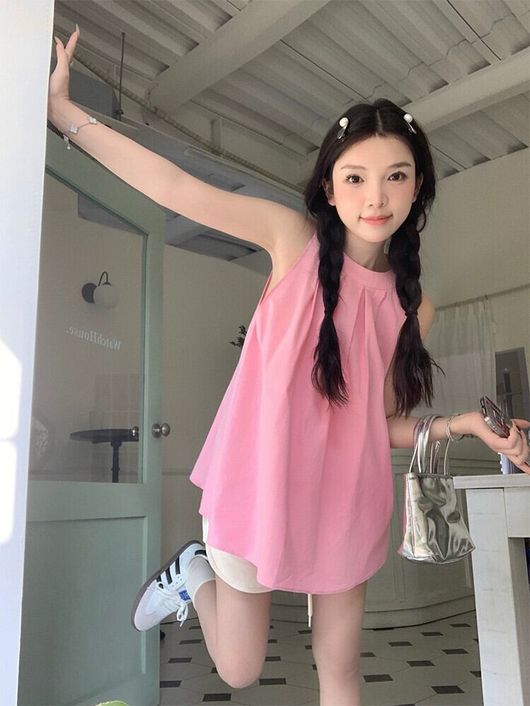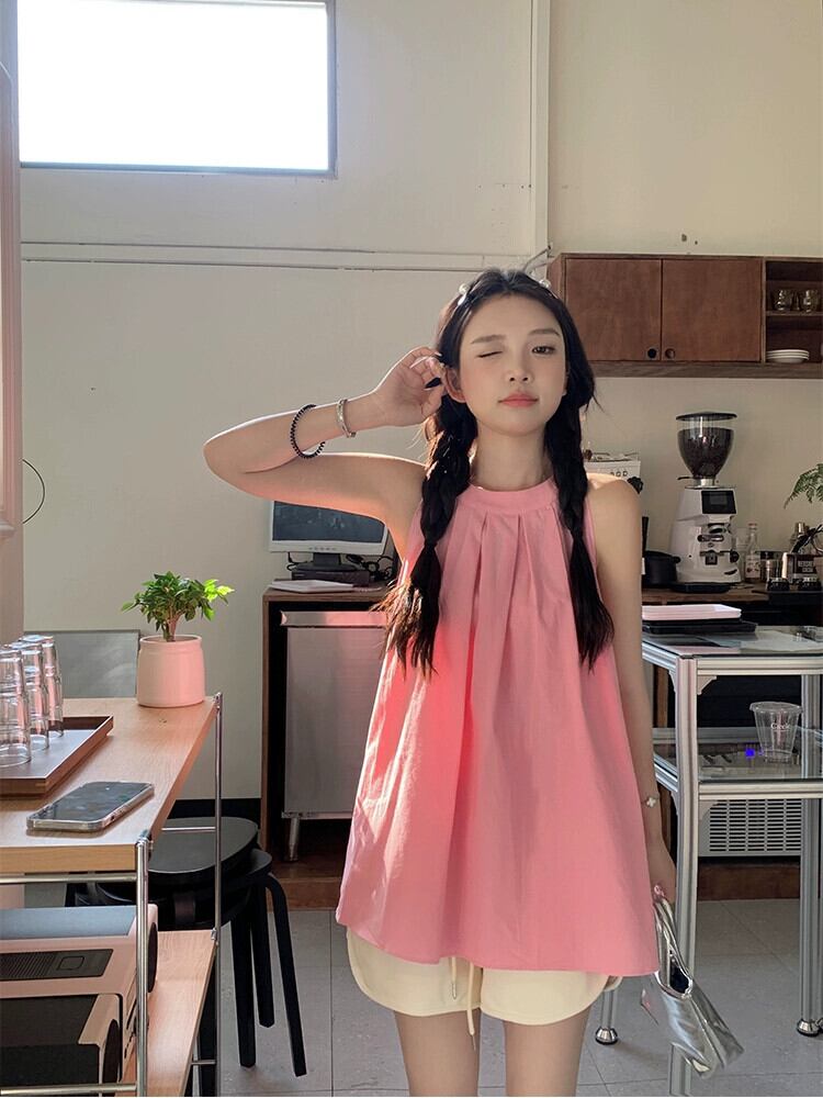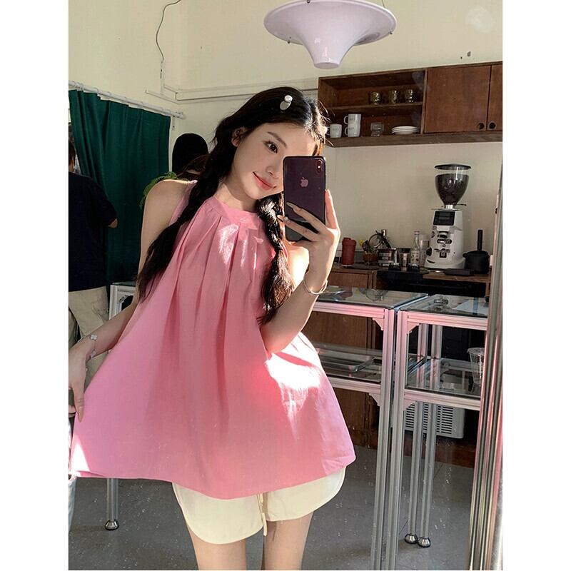 甘くてクールなスタイルのドーパミン吊りネックシャツ女性の 2023 夏の新しいデザインセンスニッチプレスプリーツピンクノースリーブトップ 大人ガーリー スウィート キュート カジュアル サマー 夏物 missk97658473296