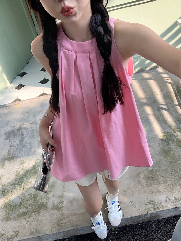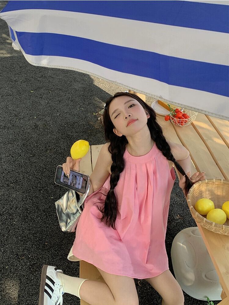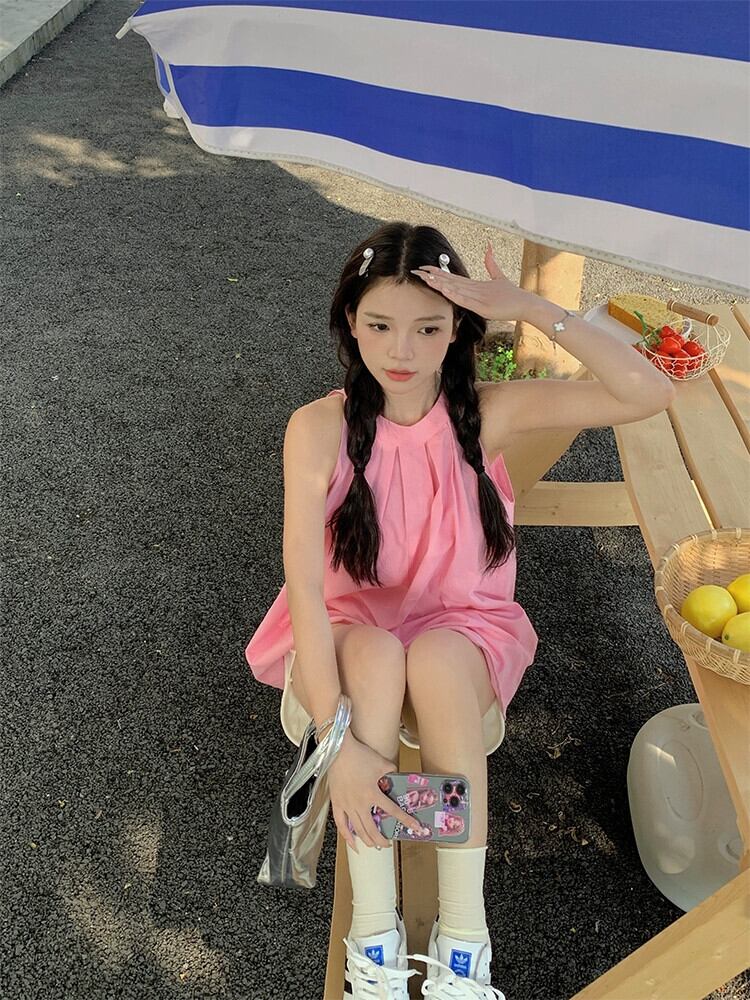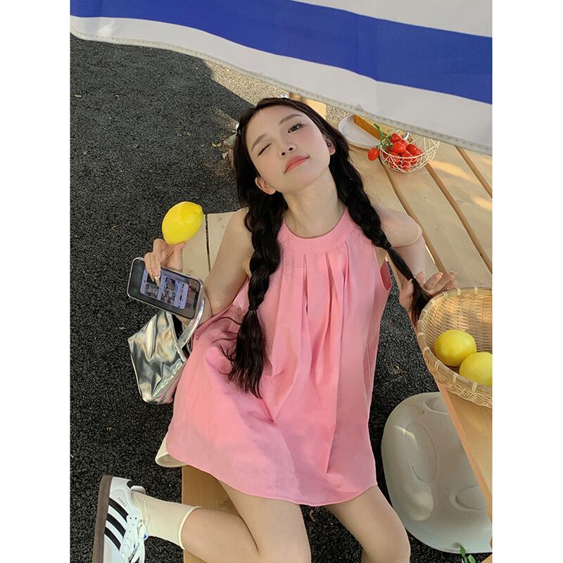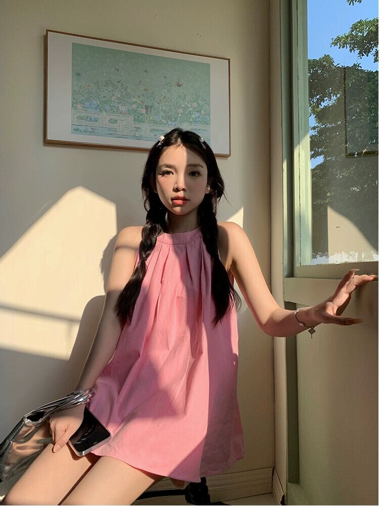 甘くてクールなスタイルのドーパミン吊りネックシャツ女性の 2023 夏の新しいデザインセンスニッチプレスプリーツピンクノースリーブトップ 大人ガーリー スウィート キュート カジュアル サマー 夏物 missk97658473296