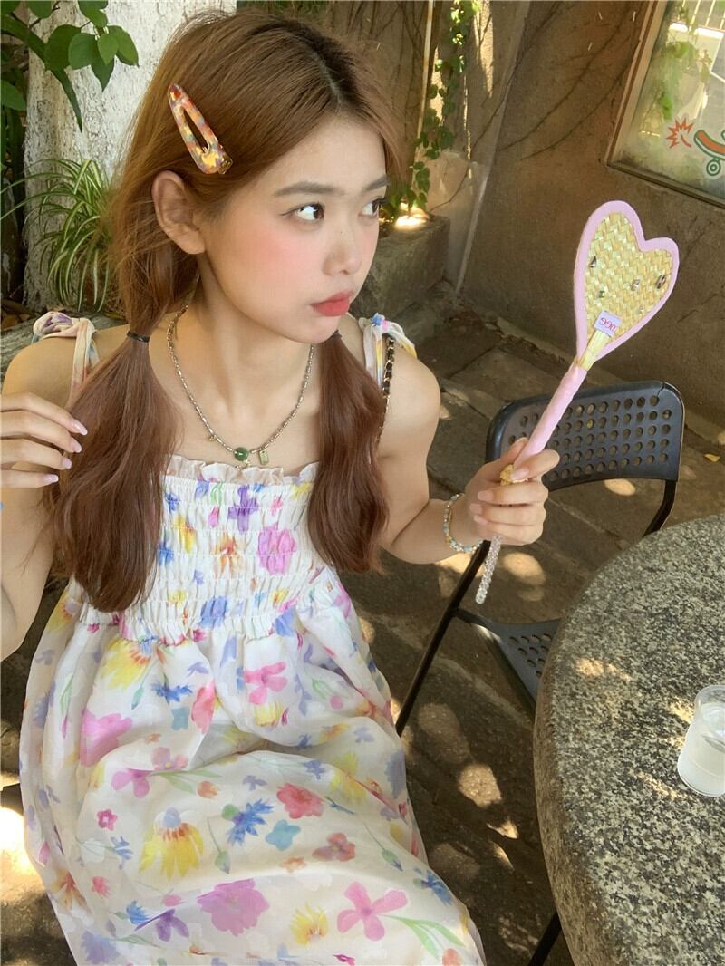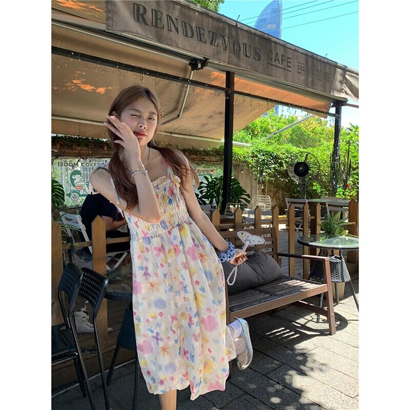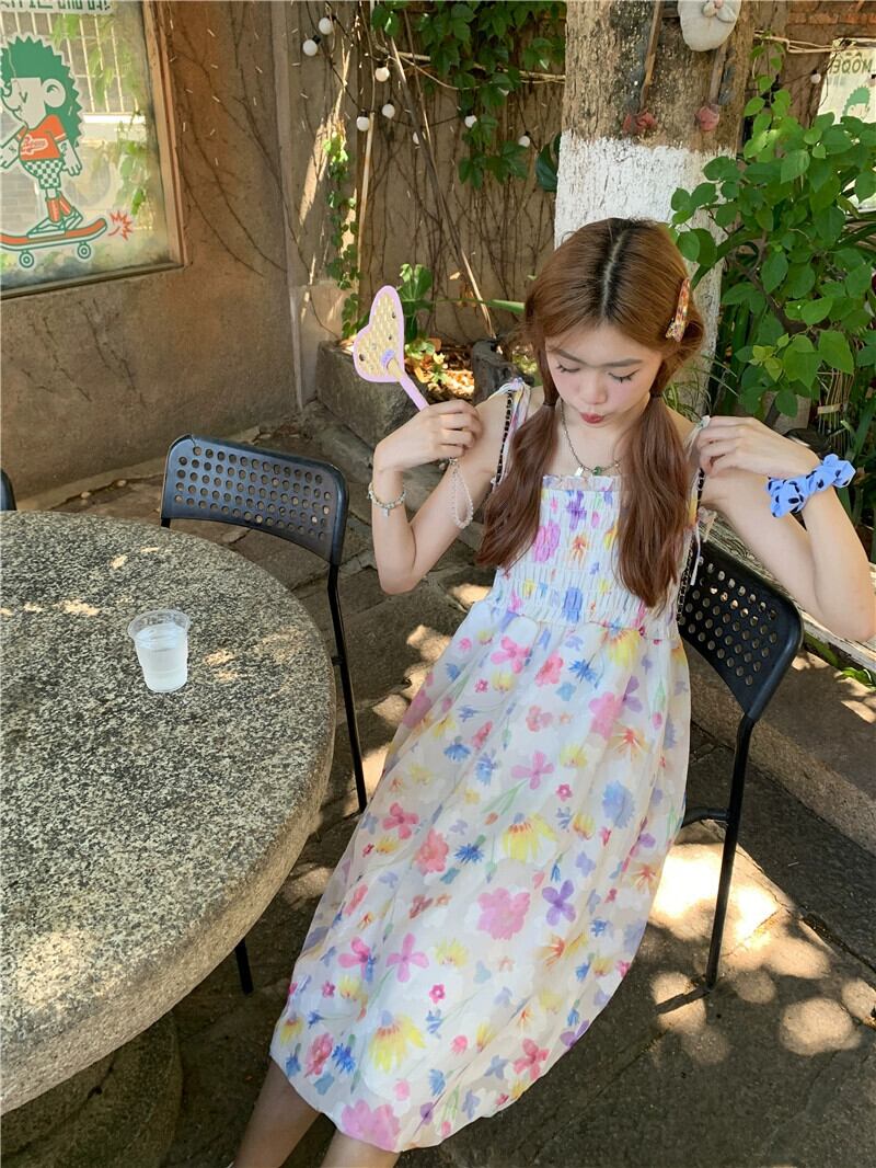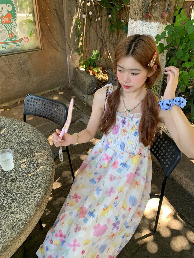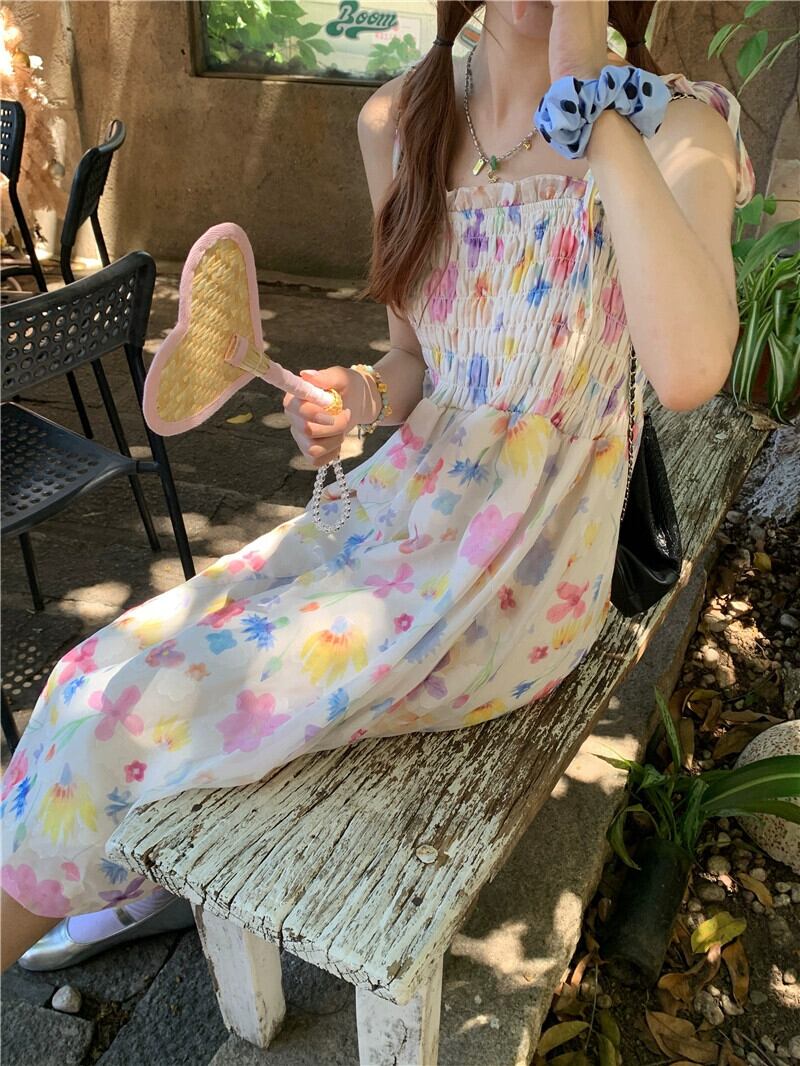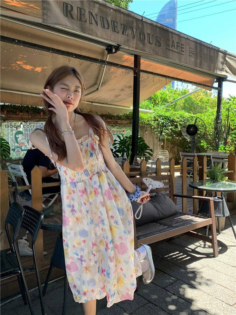 2023 夏新フレンチスタイルの甘いスタイルハイウエスト痩身折りデザインレース花サスペンダードレス婦人服 ハイウェスト 大人ガーリー スウィート キュート カジュアル サマー 夏物 花柄 missk66208671064