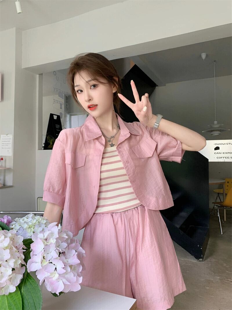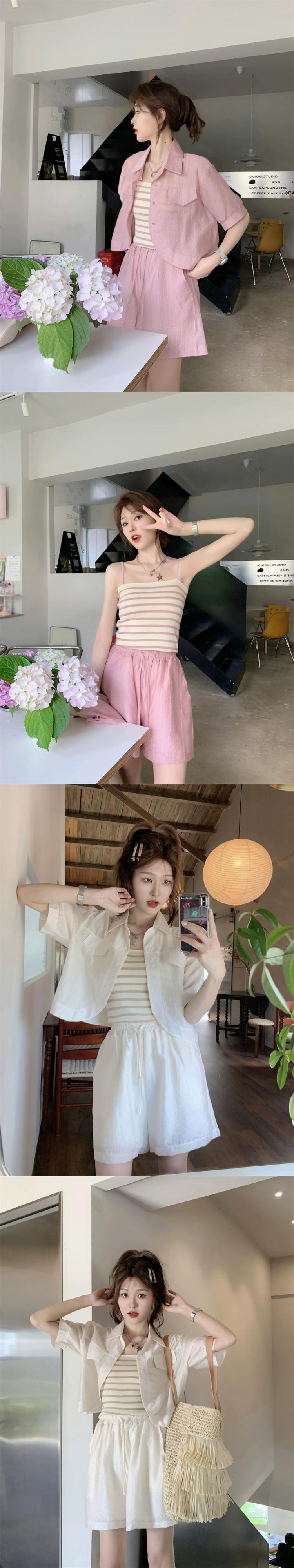 レイジーウィンドストライプキャミソールショート白シャツカジュアルショーツ女性の夏の新しいファッションスリーピーススーツ ホワイト サマー 夏物 ブルマー missk28316788776