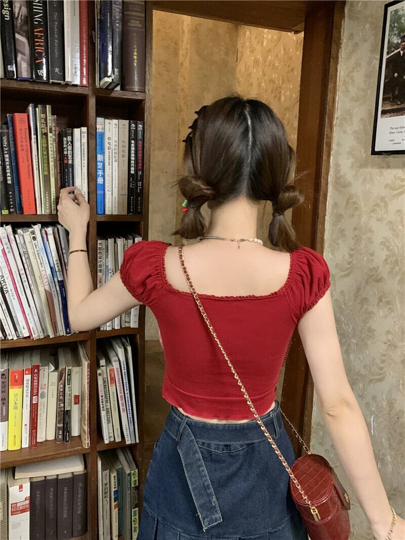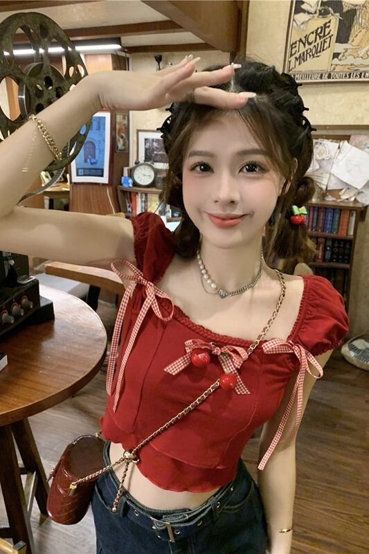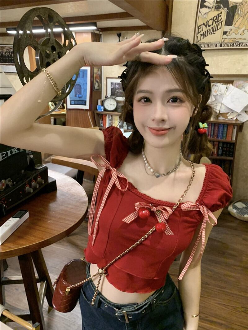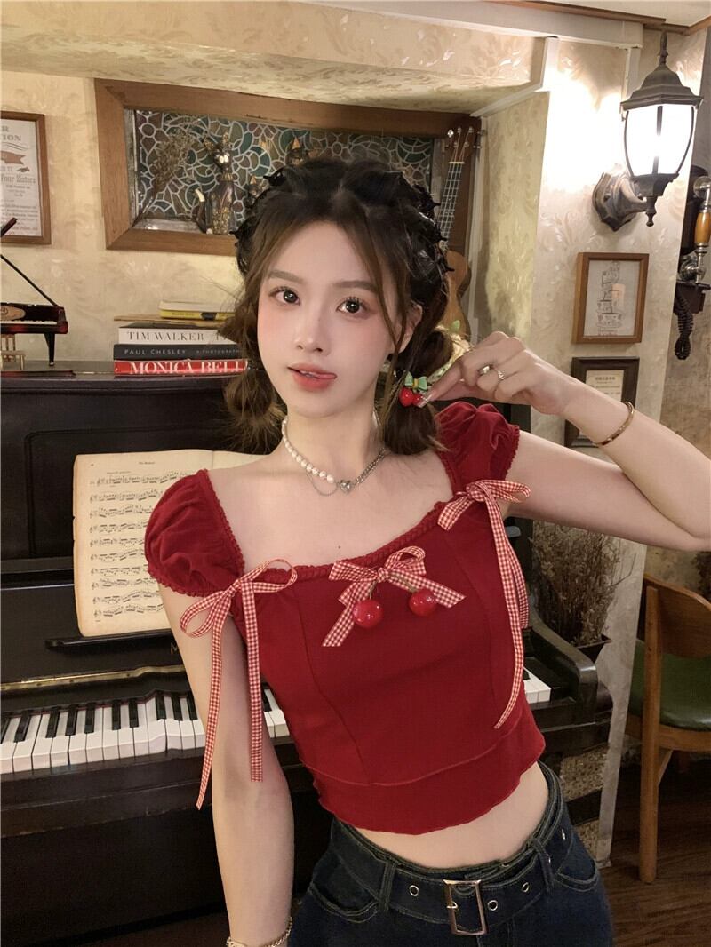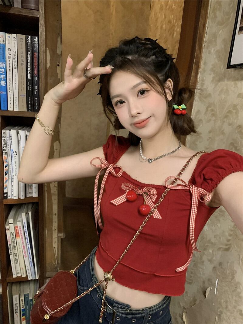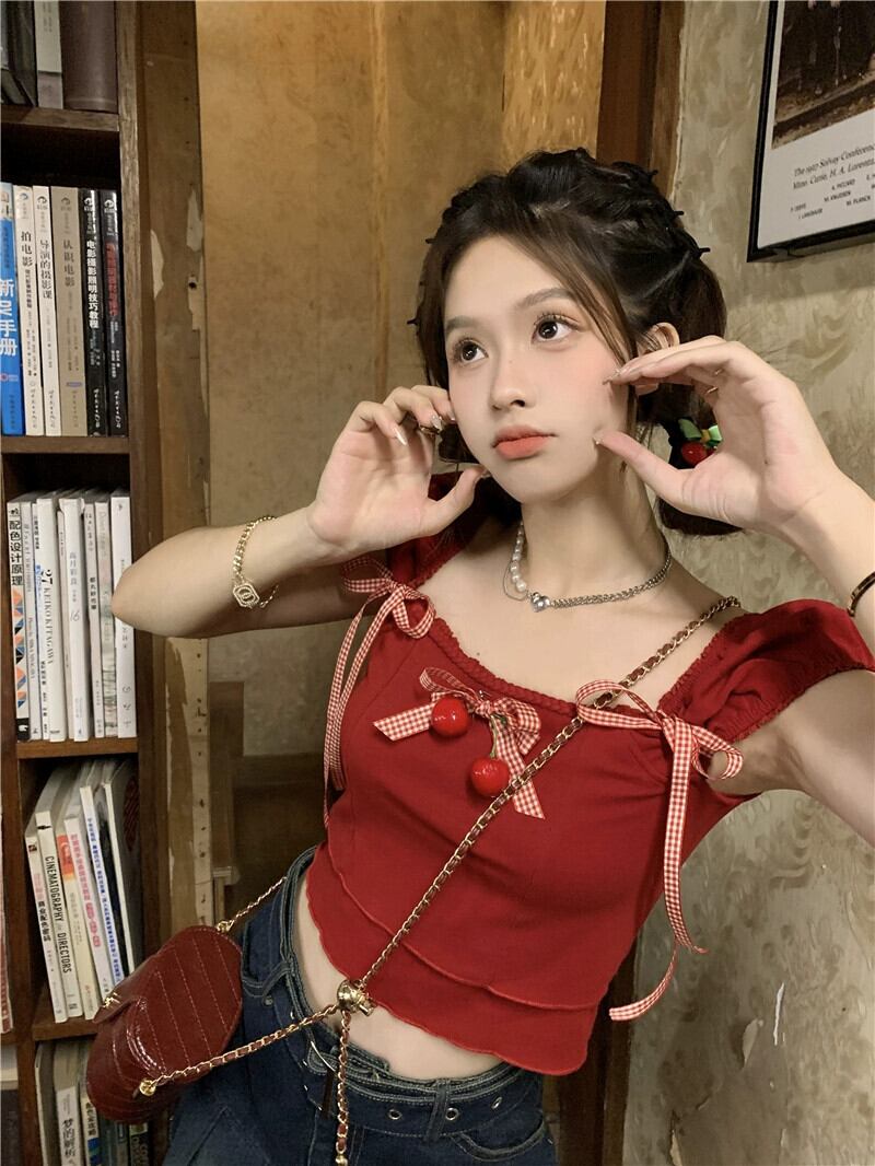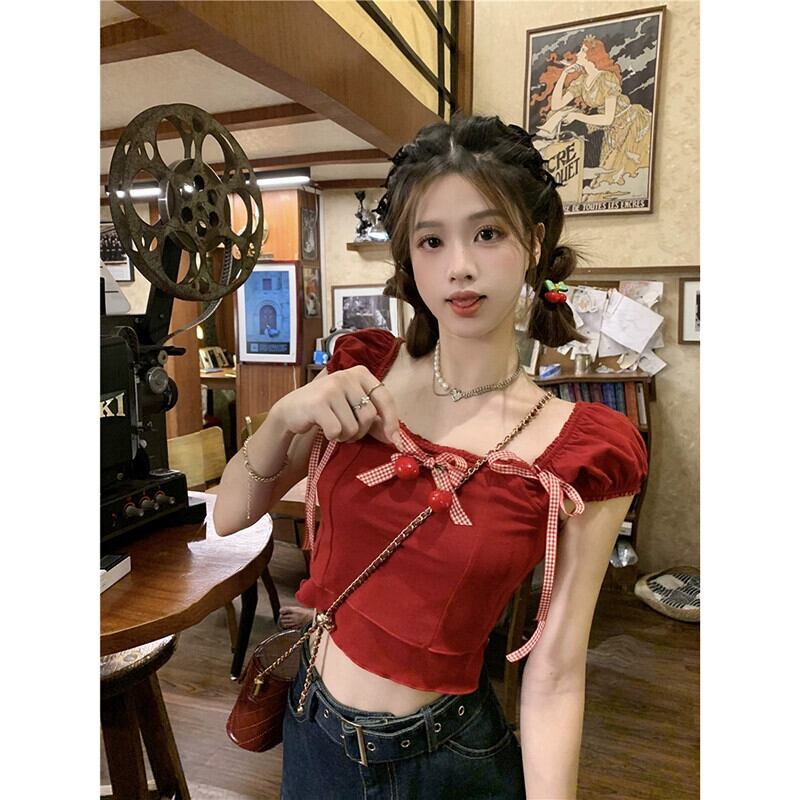 ドーパミンスイートシャツ女性の夏の2023新しいシックなチェリー蝶ネクタイショートセクションスリムトップトレンド リボン 大人ガーリー スウィート キュート カジュアル サマー 夏物 missk62877566267