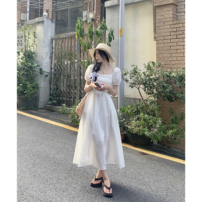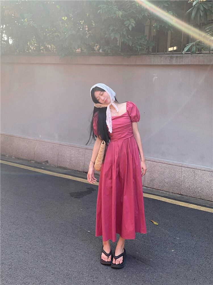 スクエアカラープリーツパフスリーブドレス女性の夏の新しい甘いウエスト痩身ドラゴンフルーツカラーロングスカート 大人ガーリー スウィート キュート カジュアル サマー 夏物 スクウェア missk16545467591