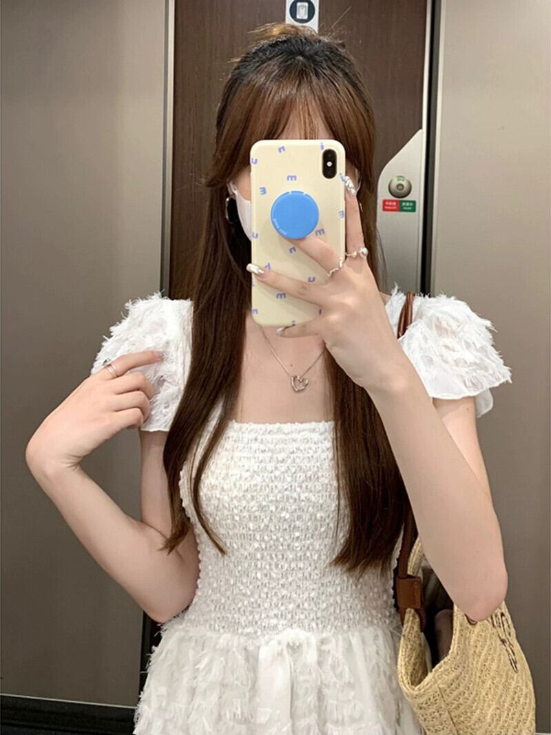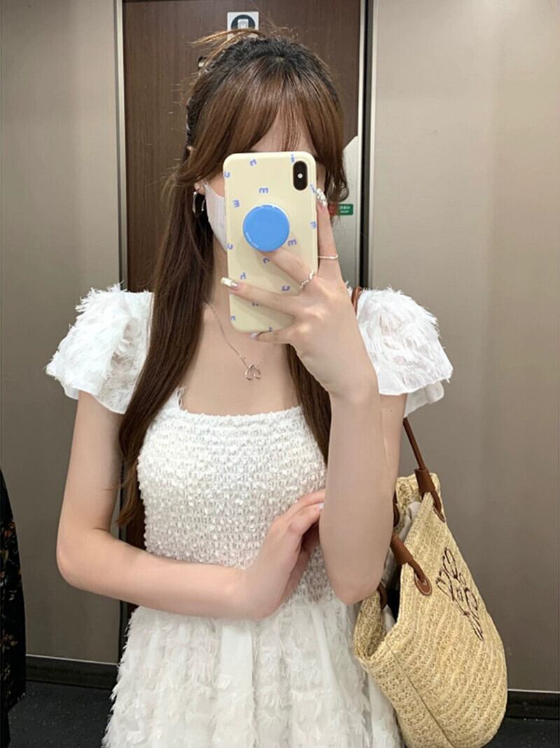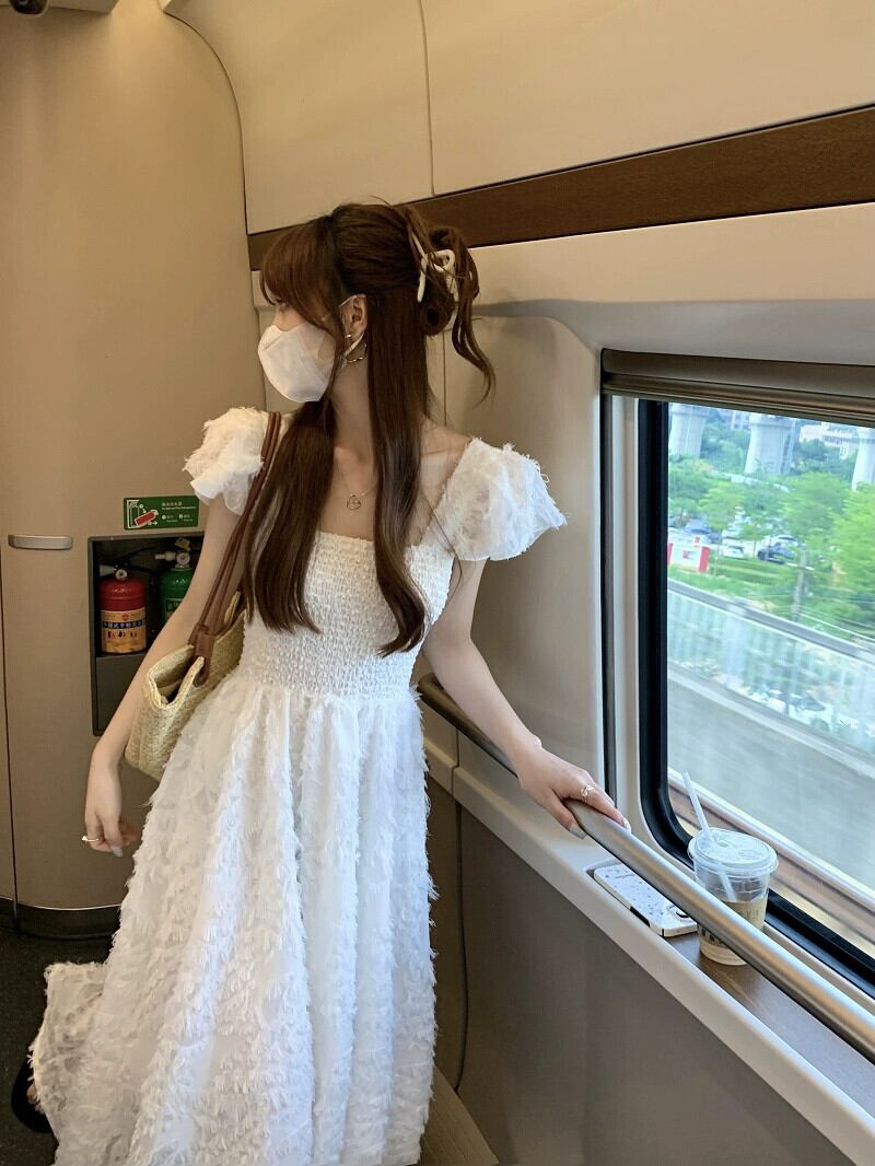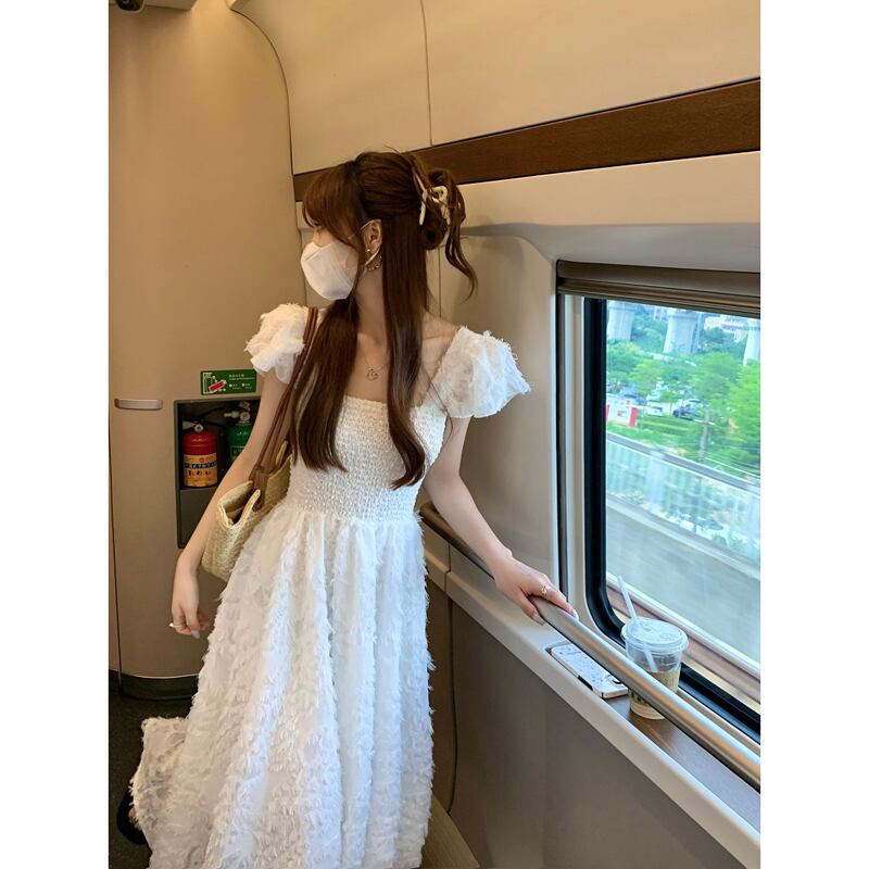 優しくて甘いフライングスリーブドレスの女性の夏の新しい弾性ウエストスーパーフェアリーホワイトホリデーロングスカート エラスティック 伸縮 大人ガーリー スウィート キュート カジュアル サマー 夏物 missk43241289536