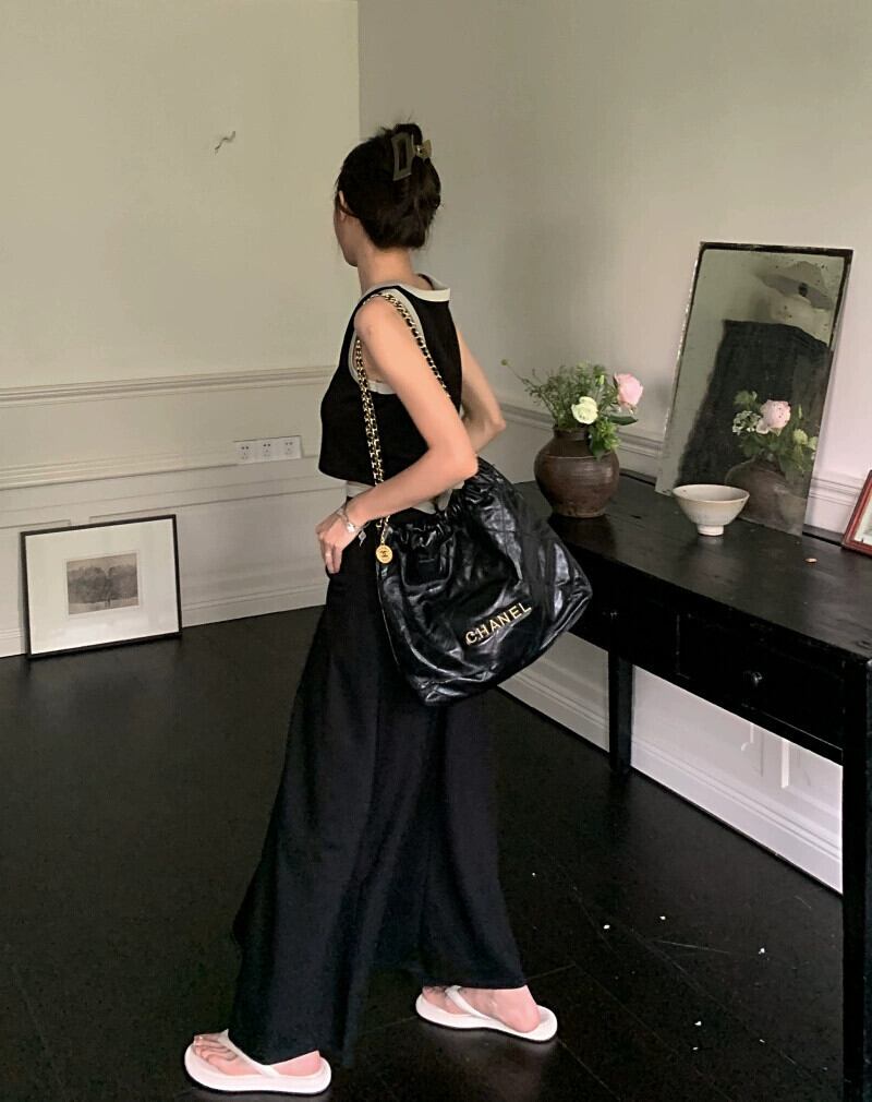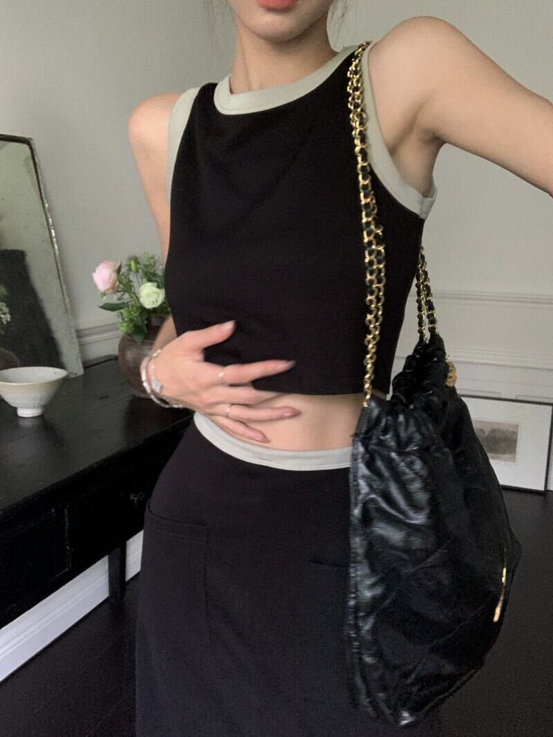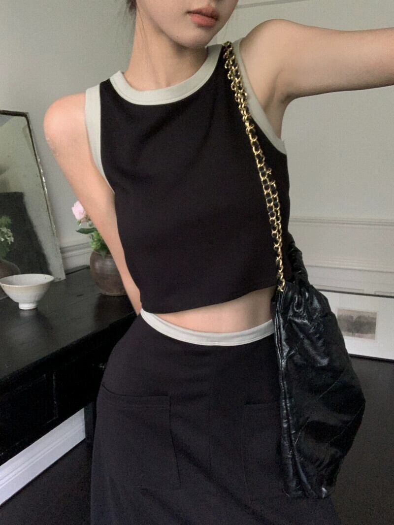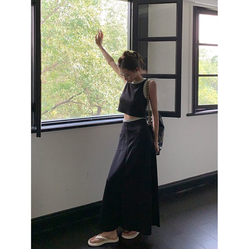 2023 夏の新色のコントラストデザインカジュアルハイウエスト A ラインスカート + ショートスリムで多用途なラウンドネックベストレディース ハイウェスト サマー 夏物 Oネック Aライン missk34815497823