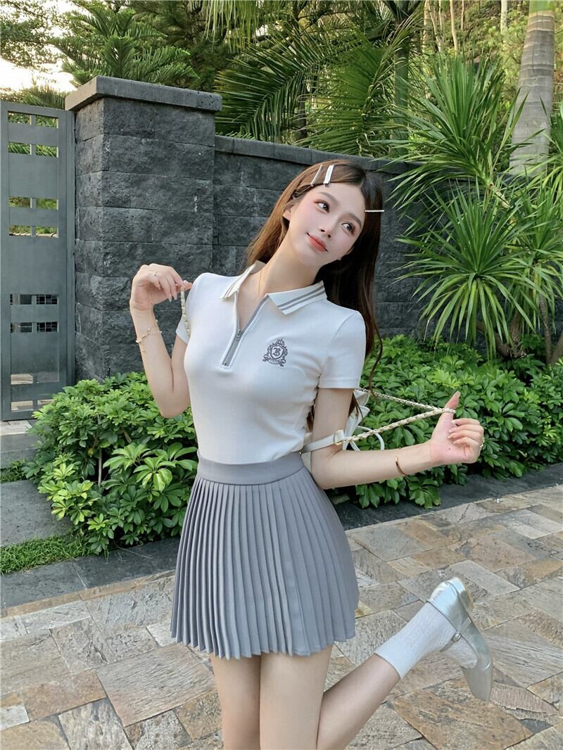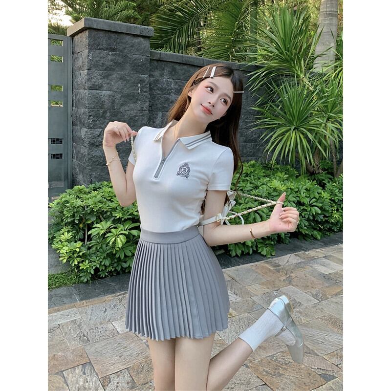 スタイルカラーコントラストショートポロカラー半袖 Tシャツハイウエストプリーツスカート女性の夏の新しいファッションスーツ ハイウェスト サマー 夏物 missk87776267774