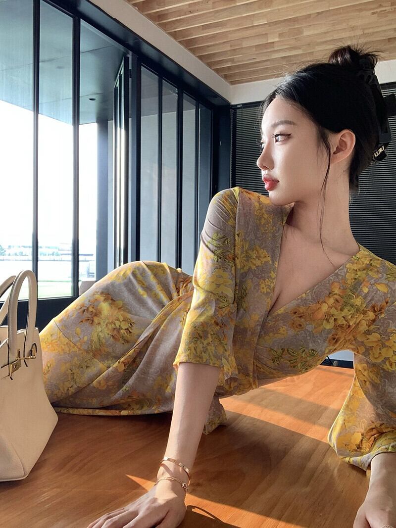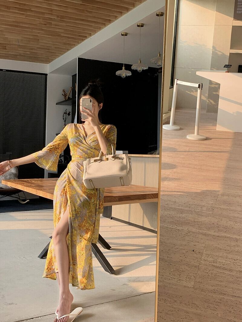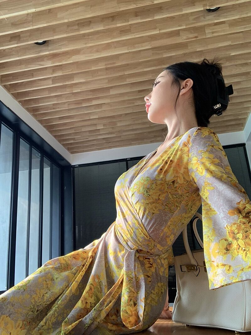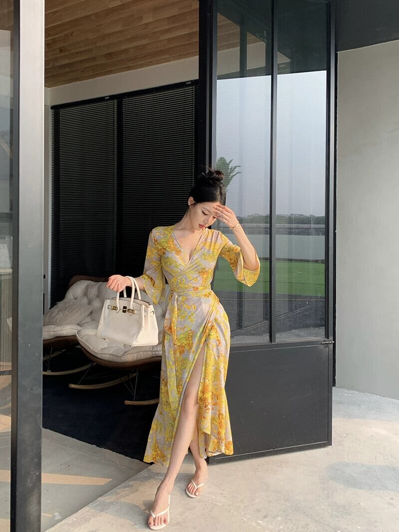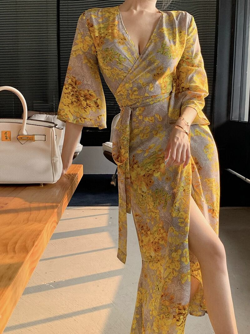 ホリデースタイルディープ V ネック花柄ドレス女性の夏の新しいイエロージャージウエストベルトセクシーなビーチドレス サマー 夏物 ハーネス Vネック missk92883684105