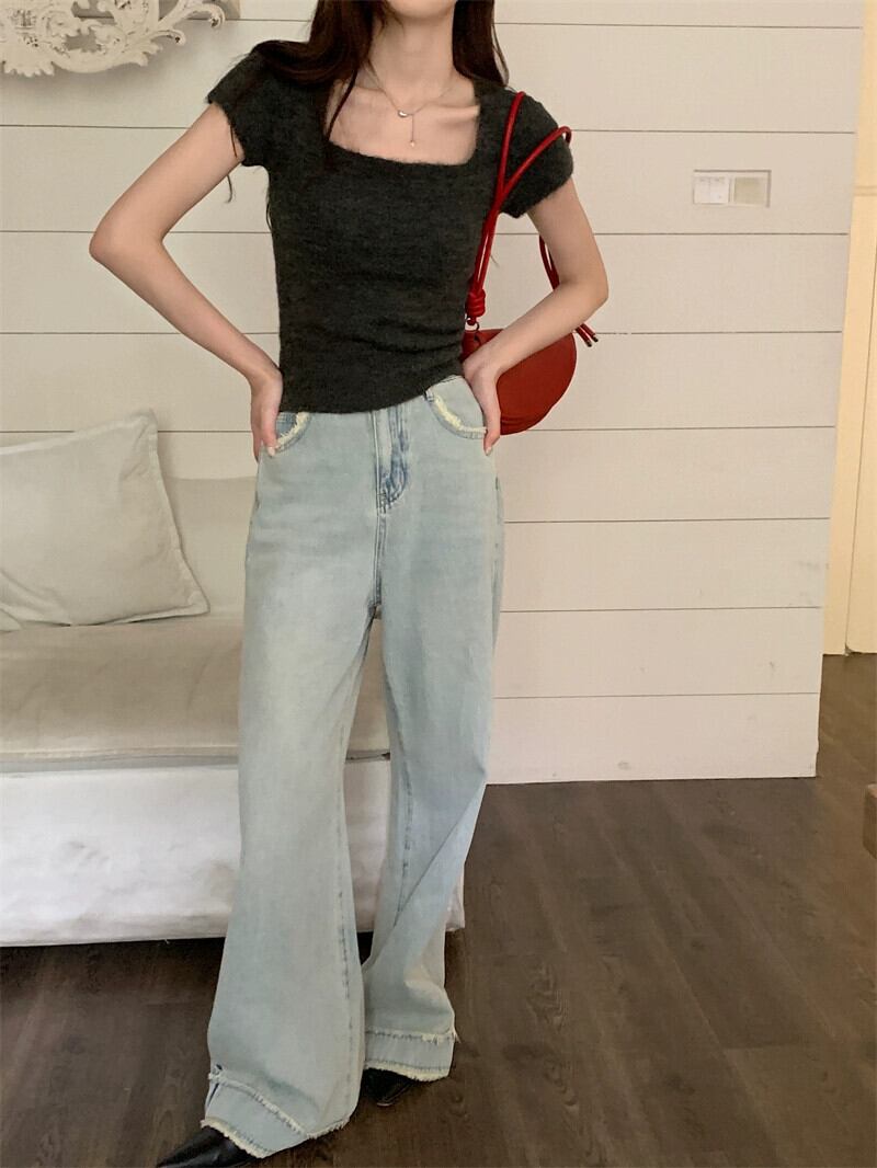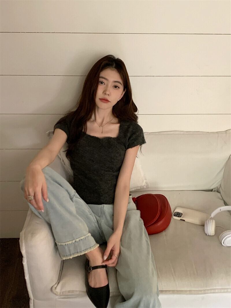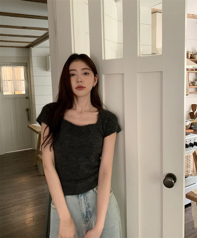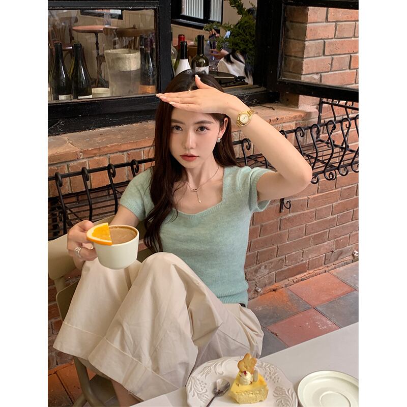 気質スクエアカラー半袖ニットセーター女性の夏バージョン2023新しいスリムフィットとスリムファッションeignスタイルショートトップ サマー 夏物 スクウェア missk395844411