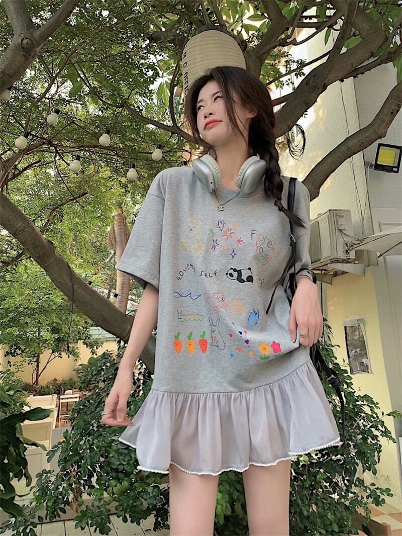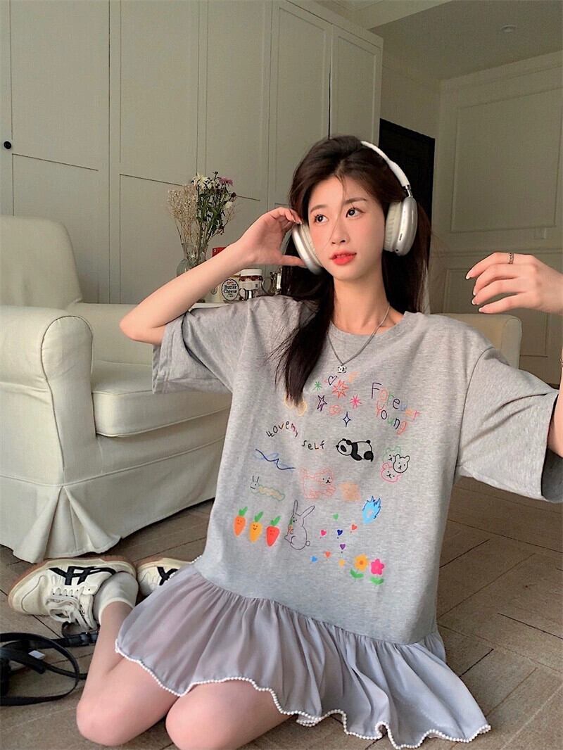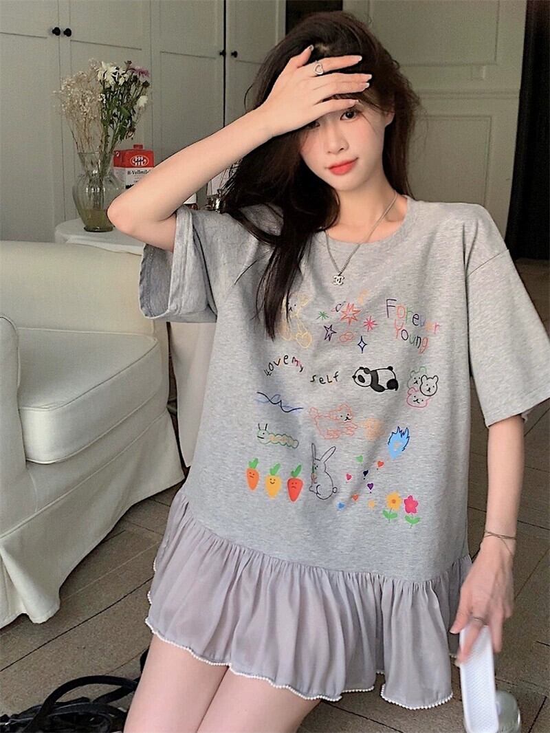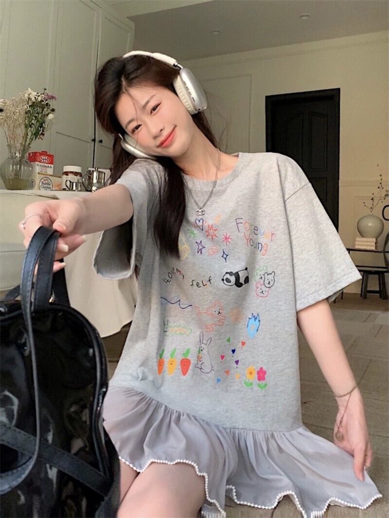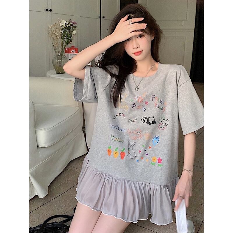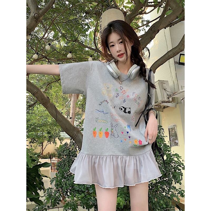落書きプリントスプライシングドレス夏の新しいスタイルルーズデザインセンスレース年齢削減Tシャツショートスカート女性潮 サマー 夏物 missk16820088488