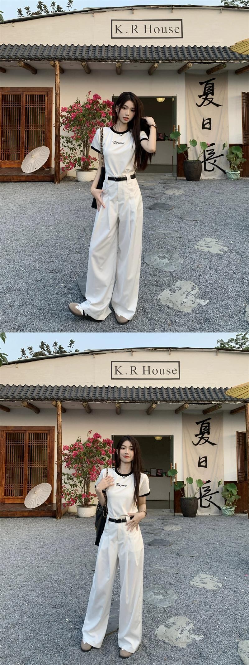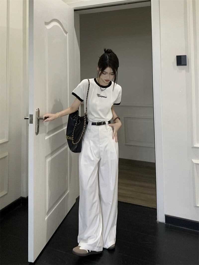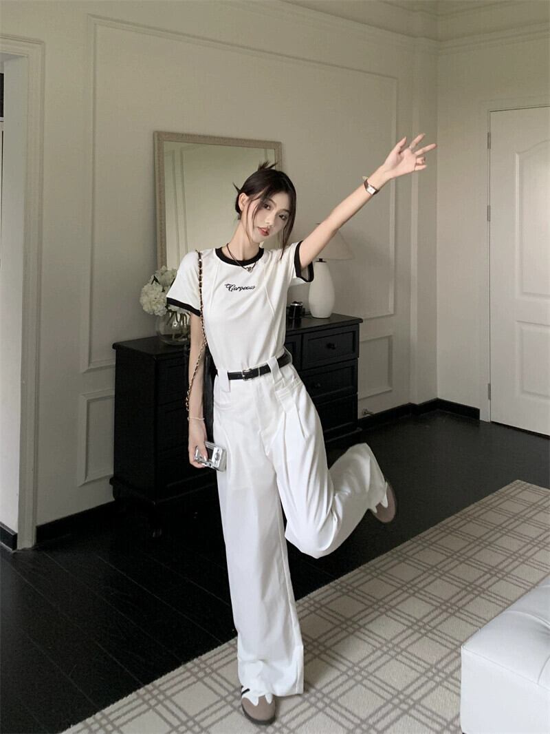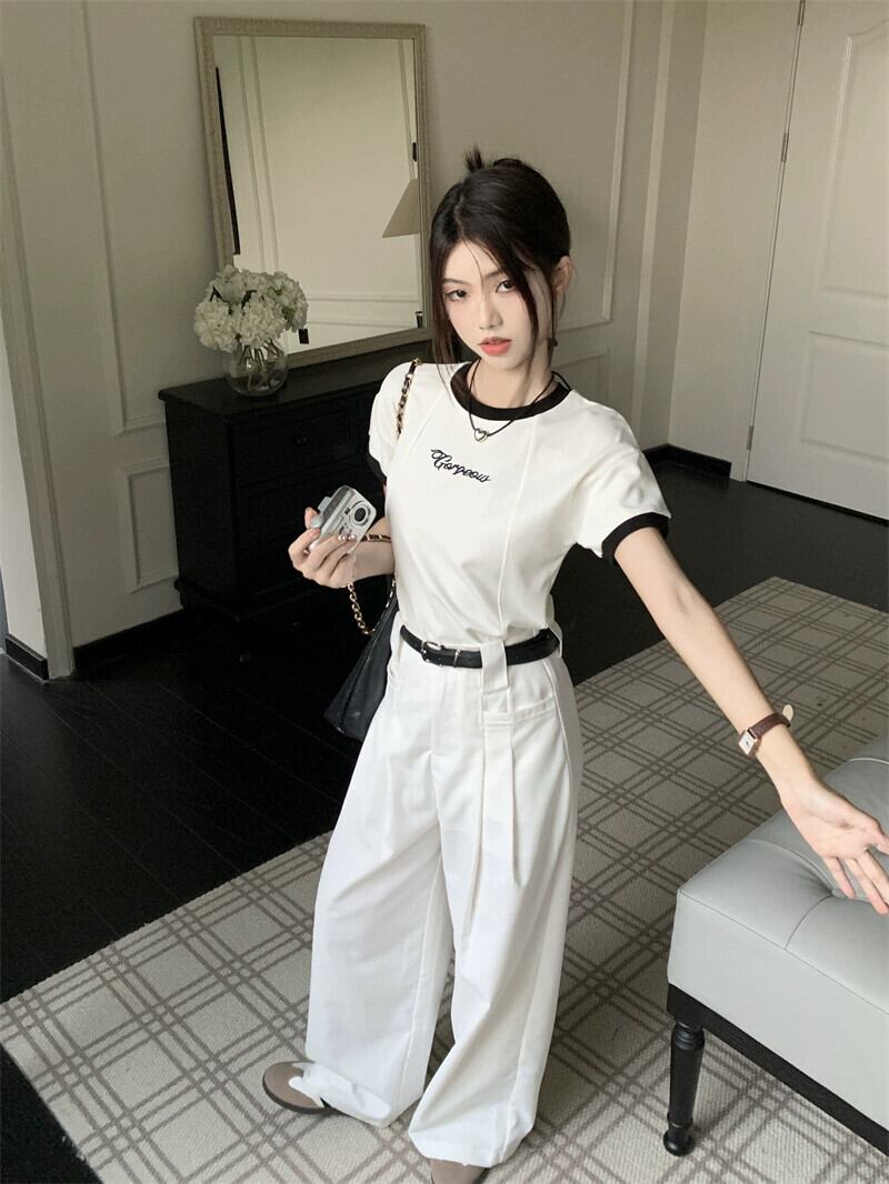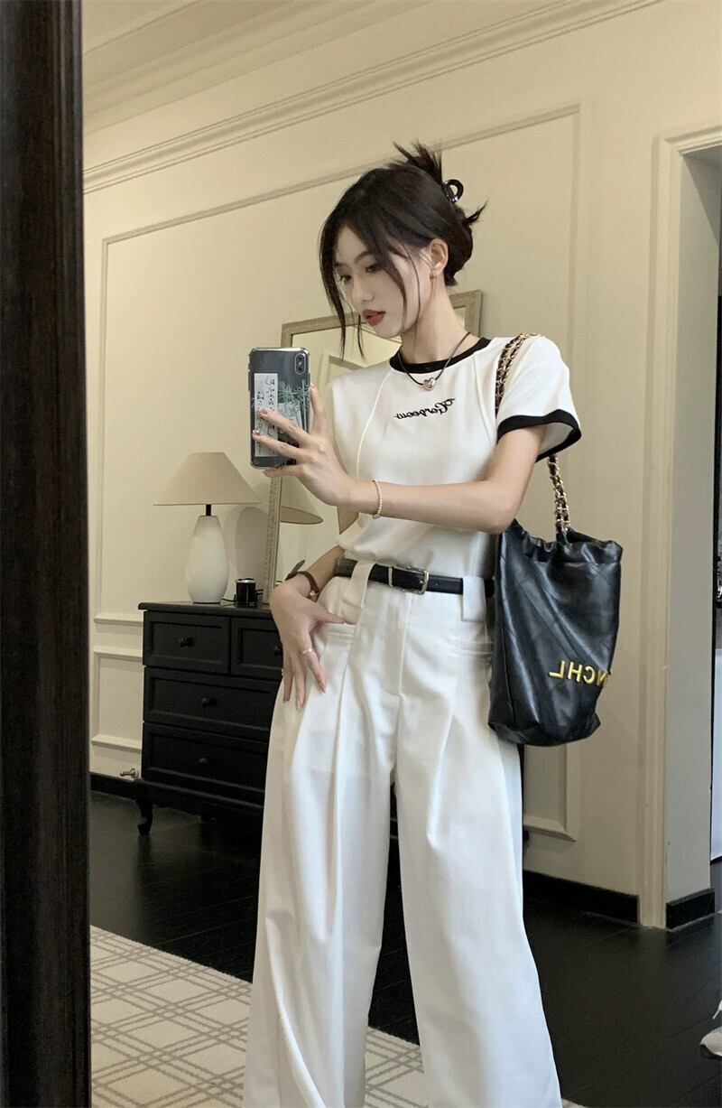 甘くてスパイシーなカラーコントラストフロントショルダー半袖 Tシャツトップハイウエストワイドレッグカジュアルモップパンツ女性の夏の新しいファッションスーツ ハイウェスト 大人ガーリー スウィート キュート サマー 夏物 missk62137491851