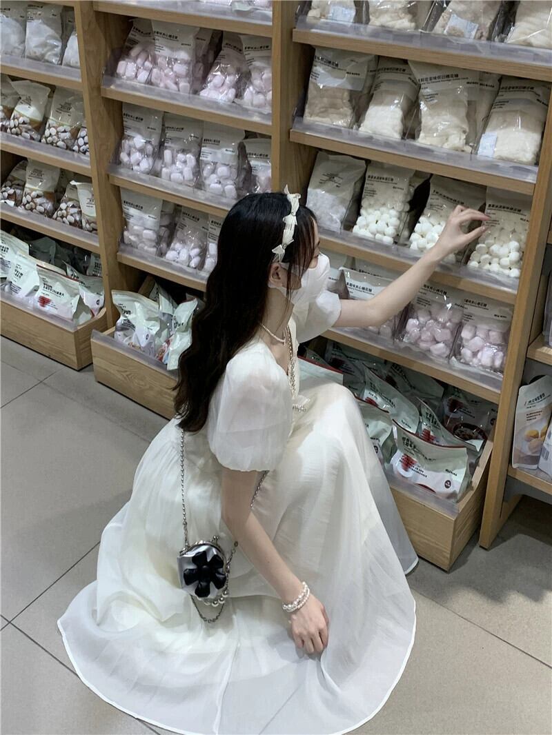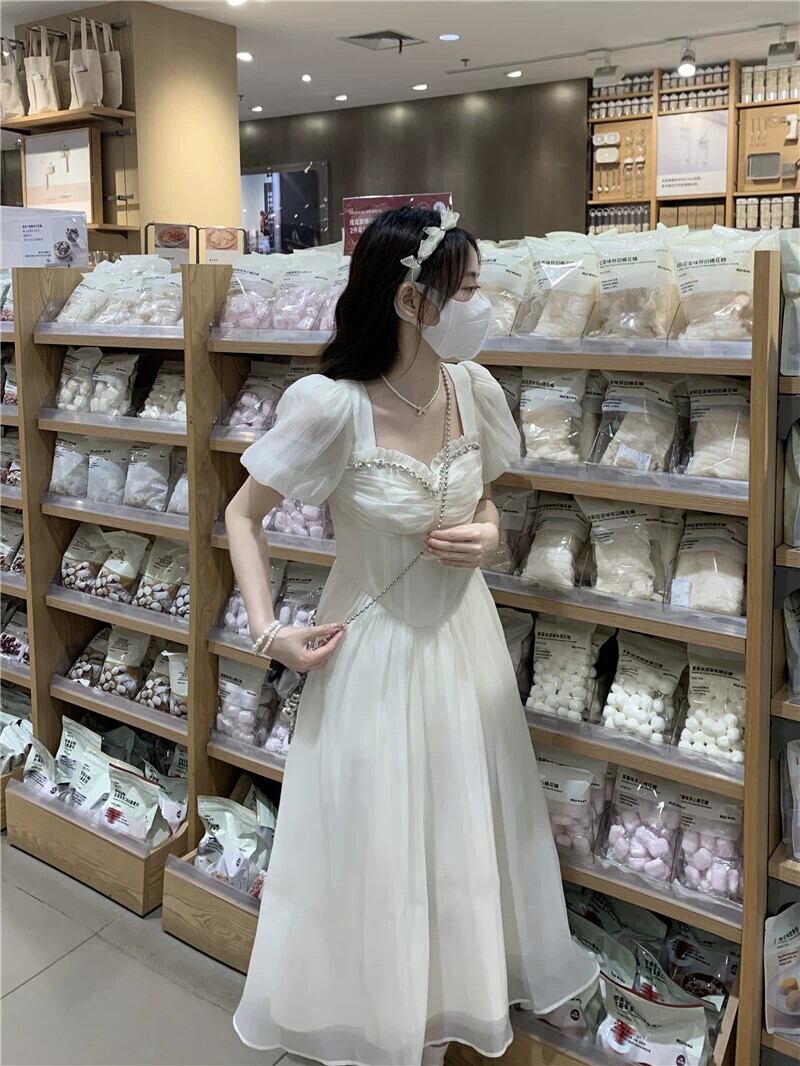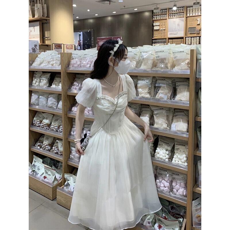 夏の 2023 新しいフレンチスタイルハイウエスト痩身ビーズレーススプライシングデザインバブル半袖ドレスの女性 ハイウェスト サマー 夏物 missk93789662825