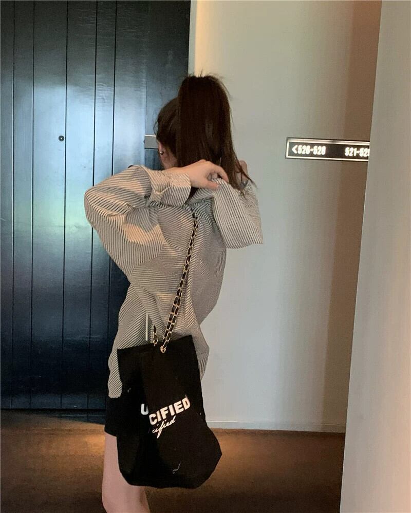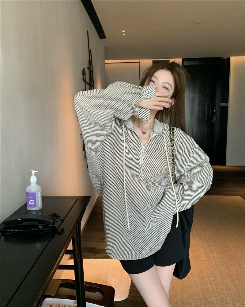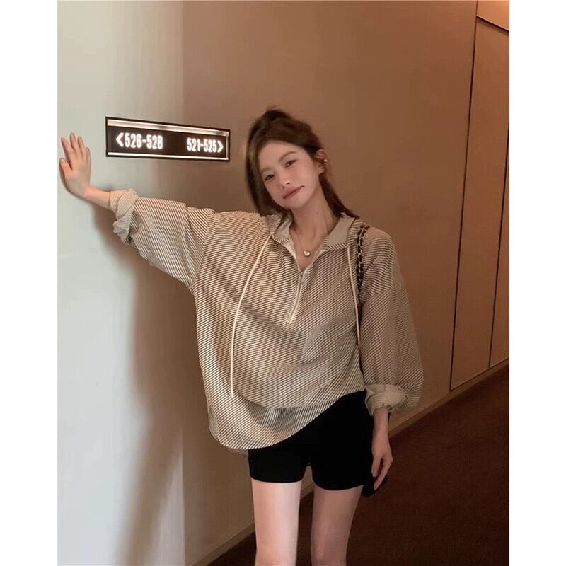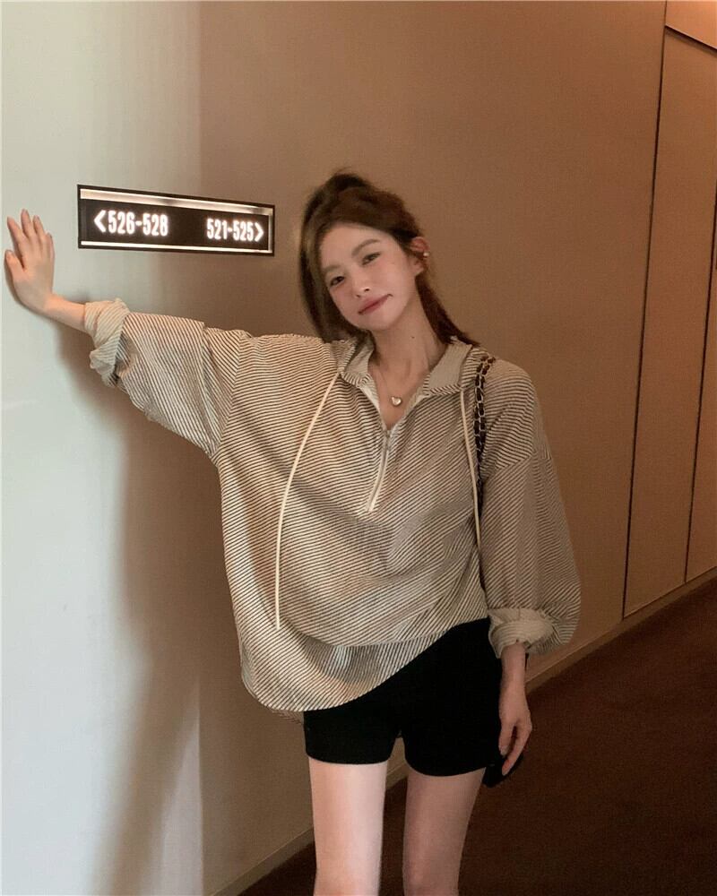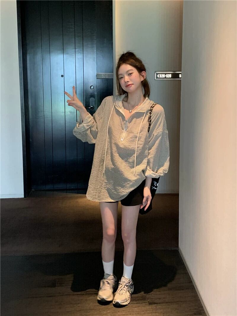 ストライプフード付き薄型長袖日焼け止めシャツ夏 2023 新しい怠惰な風ルーズミッドレングストップ婦人服 ロング サマー 夏物 missk19334441281