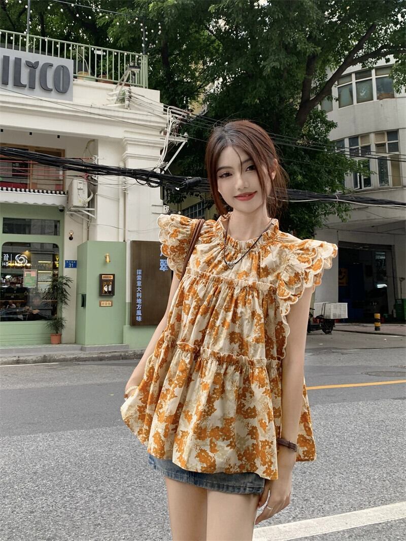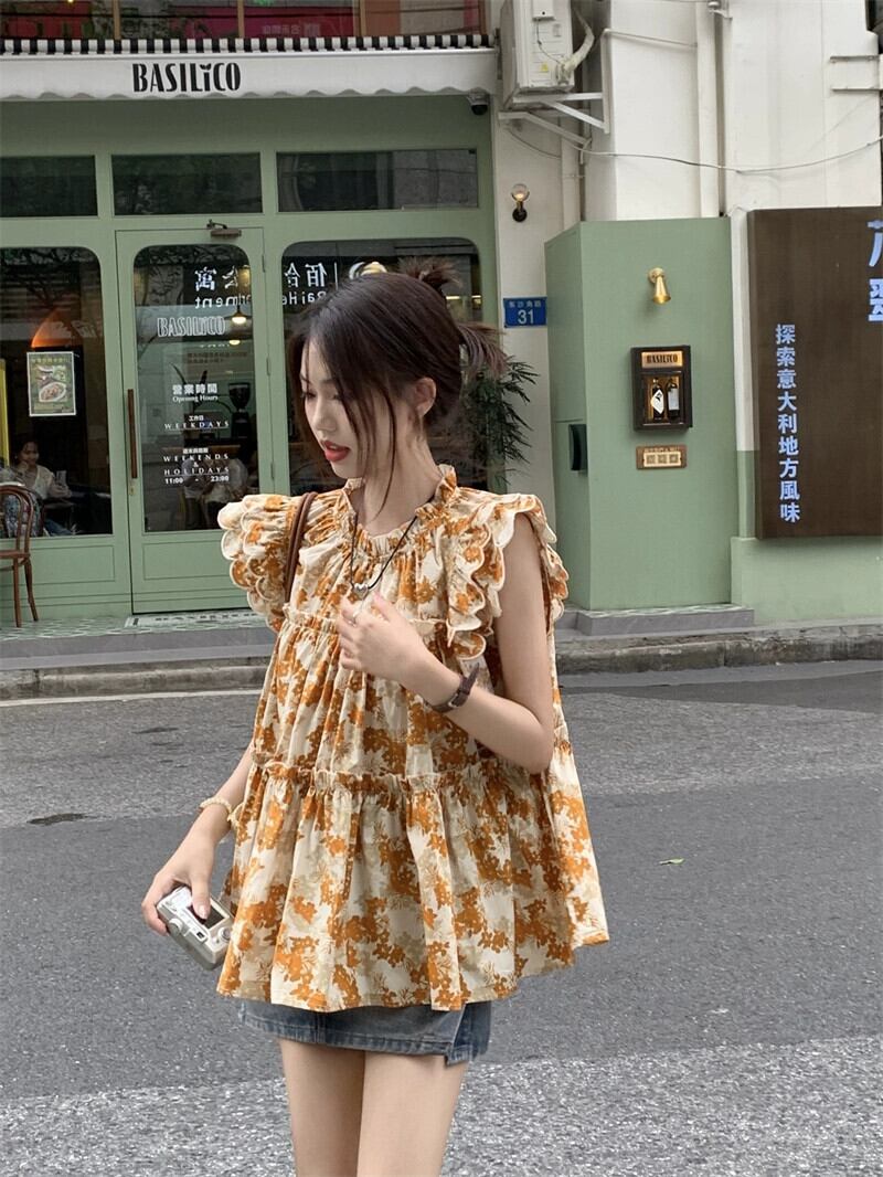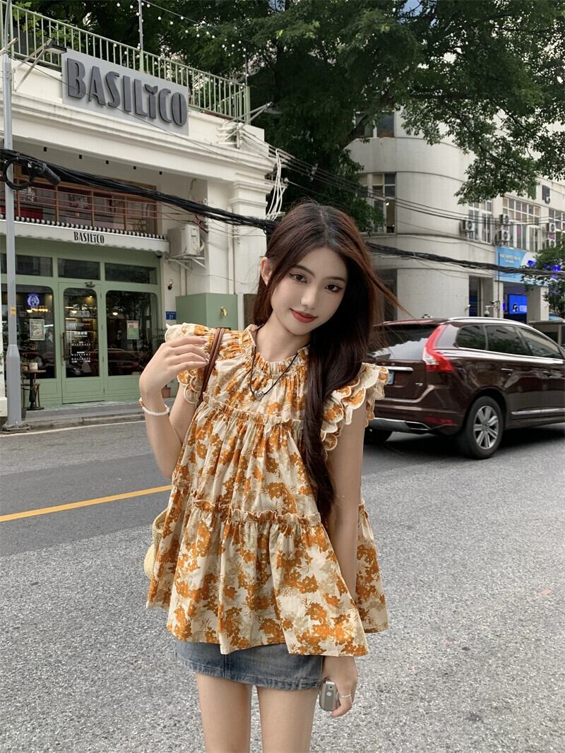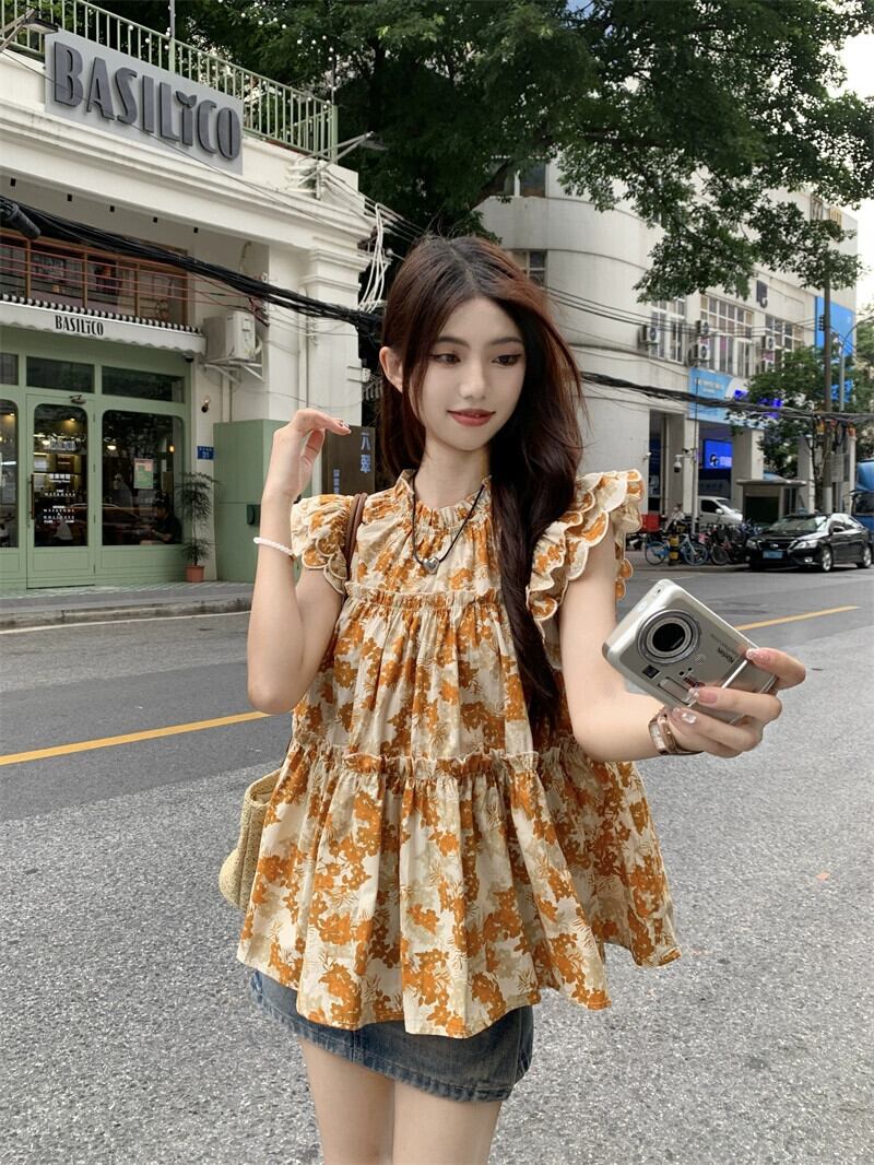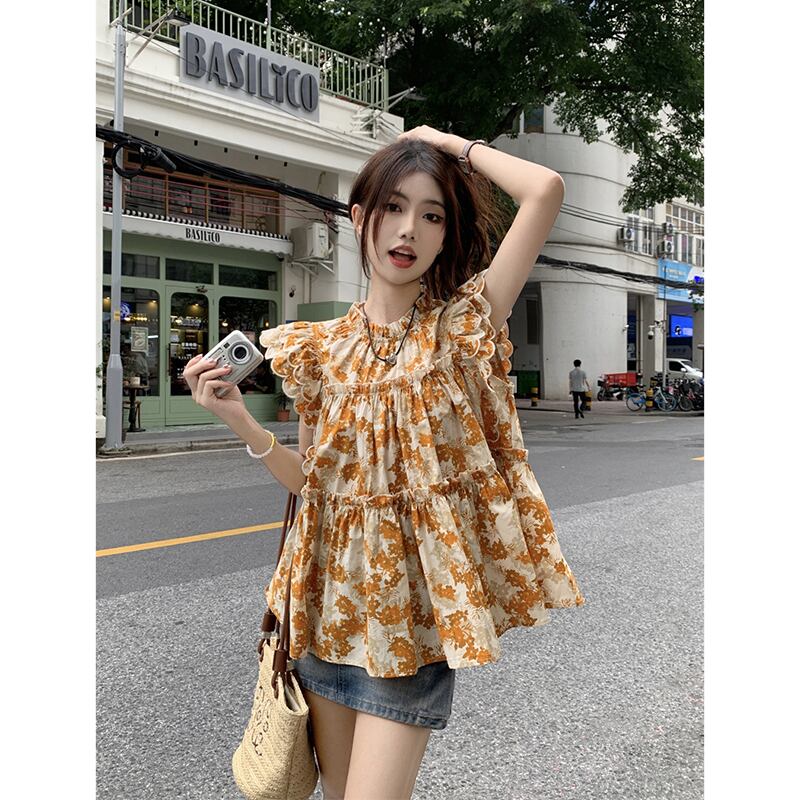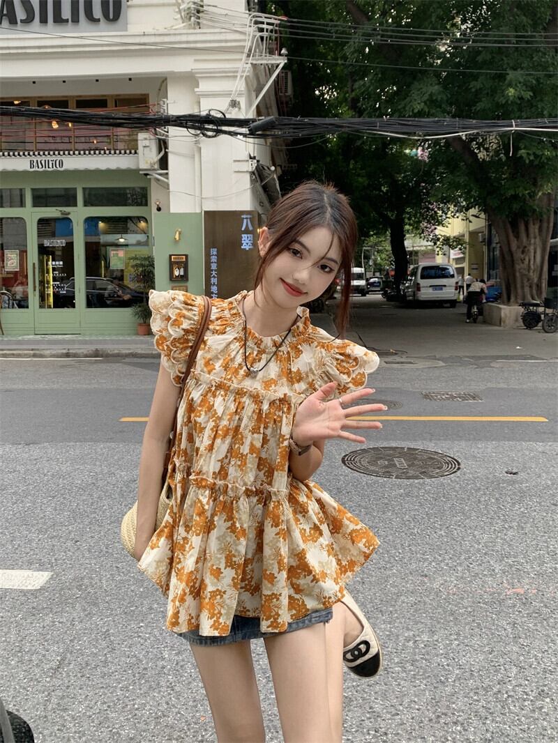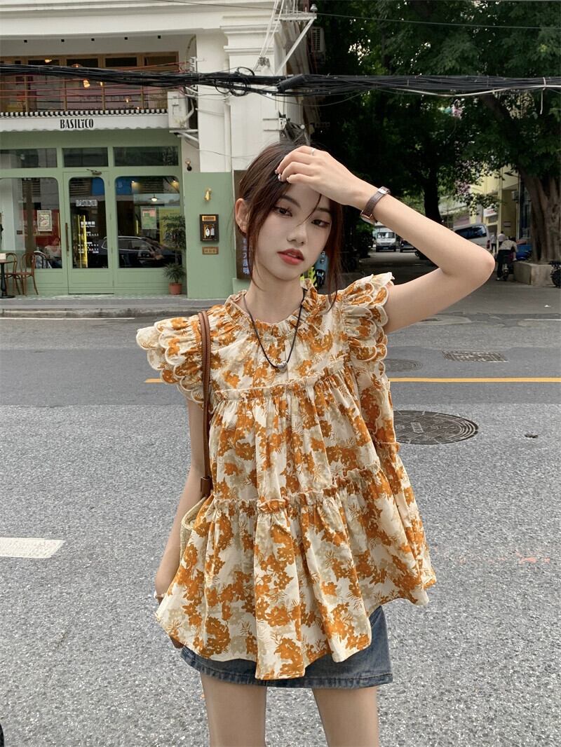 Sweet Feifei スリーブ花柄人形シャツ夏フレンチセンス年齢削減木製耳シャツトップ女性の 大人ガーリー スウィート キュート カジュアル サマー 夏物 missk88902170527