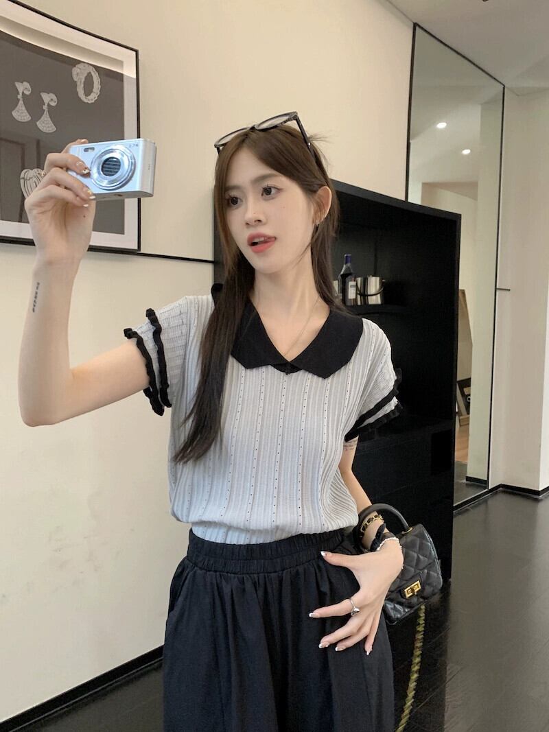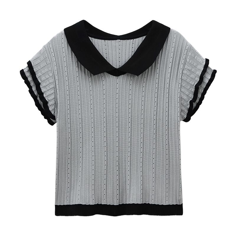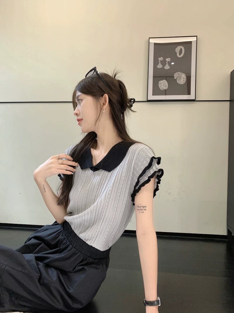 フレンチスタイルの波状サイドコントラストカラー半袖ニットセーターレディース夏新レトロデザインセンスラペル薄いセクションショートトップ サマー 夏物 missk68235242489