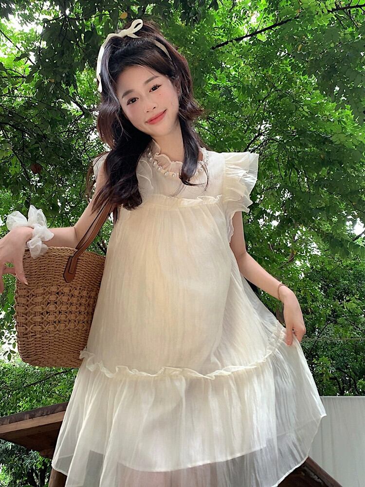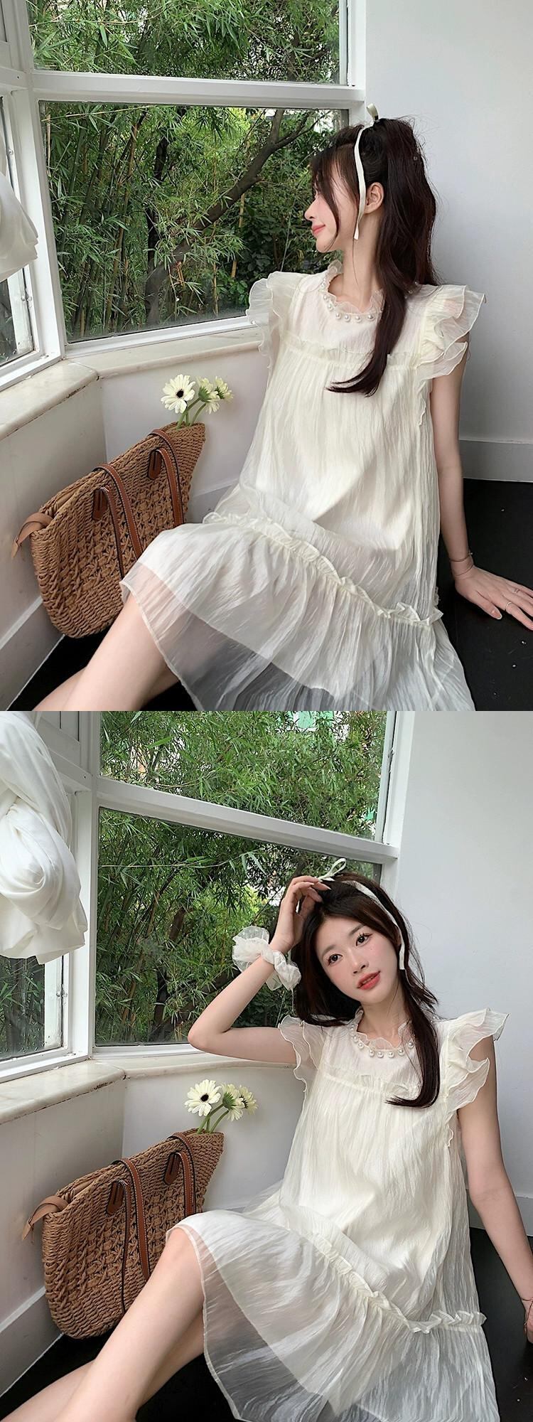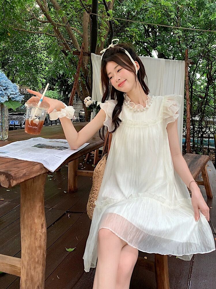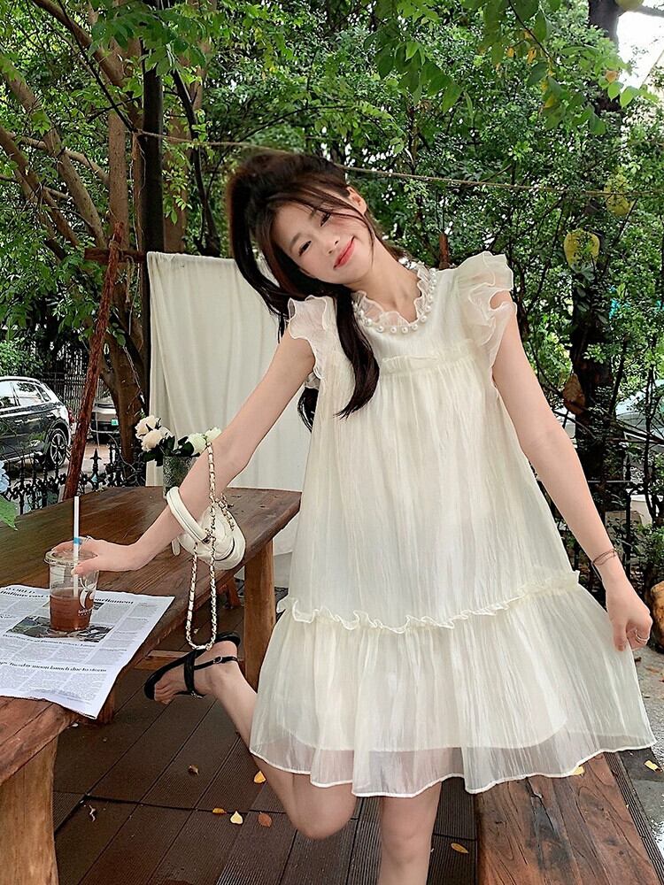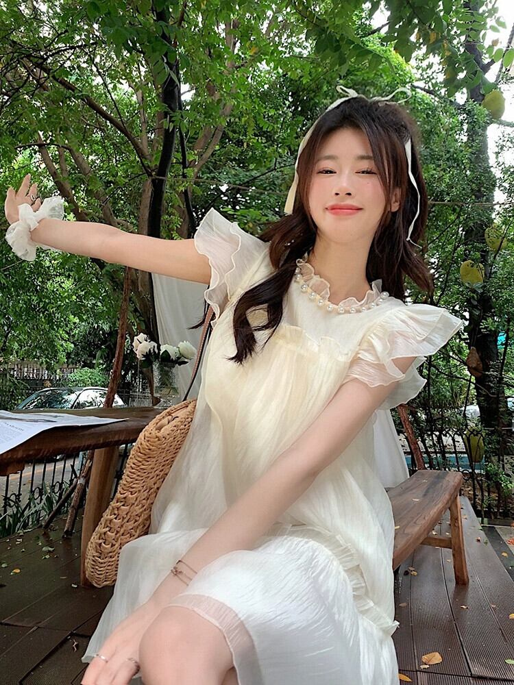 フライングスリーブシフォンドレスの女性の夏の 2022 新しいスタイルのパールカラー高品質ルースキキョウスカート木の耳 サマー 夏物 真珠 missk62551393964