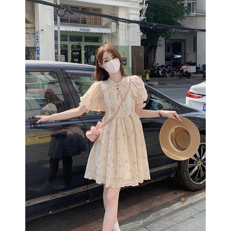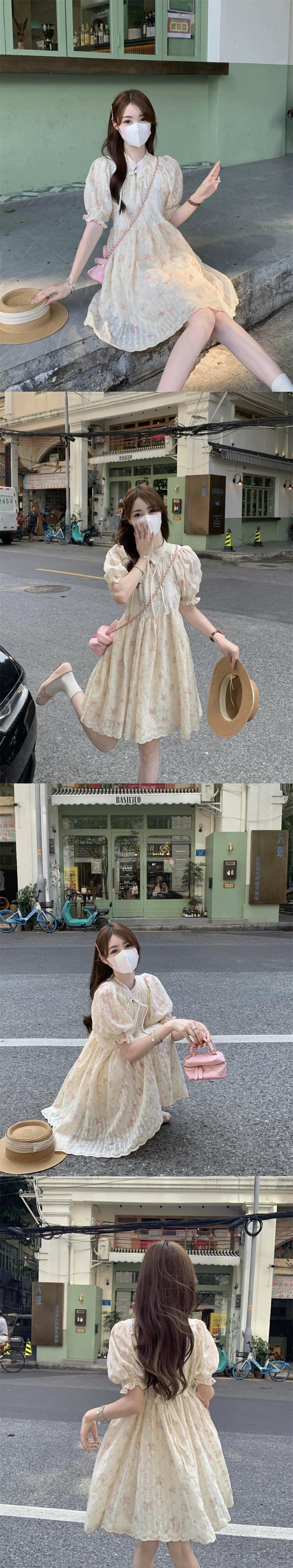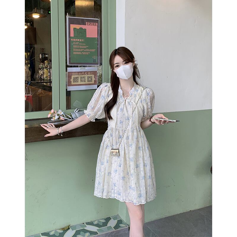 甘い刺繍花柄半袖ドレスの女性の夏 2023 新しい非常に妖精のウエスト痩身パフスリーブスカート レッド 大人ガーリー スウィート キュート カジュアル サマー 夏物 missk29493597464
