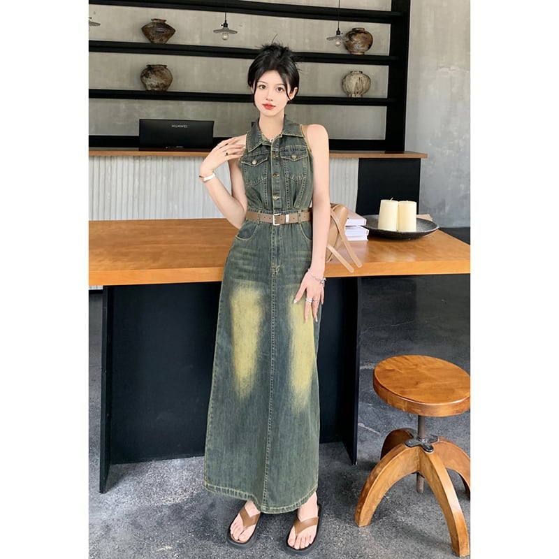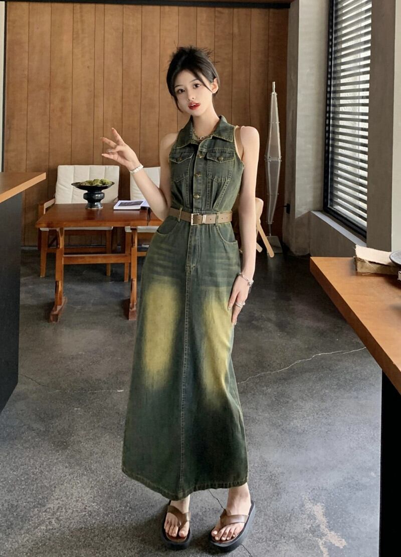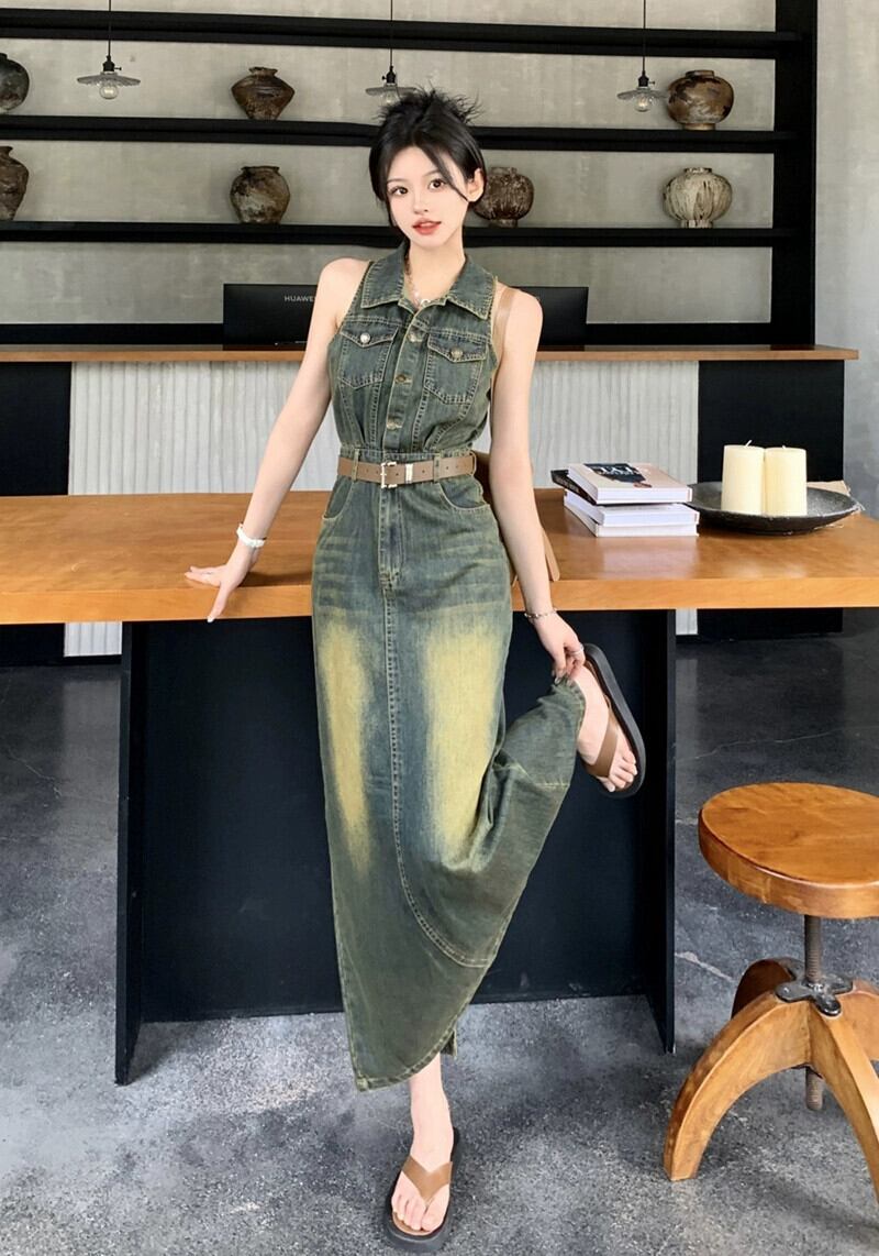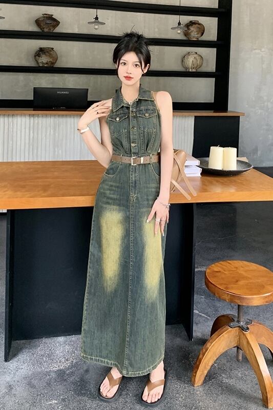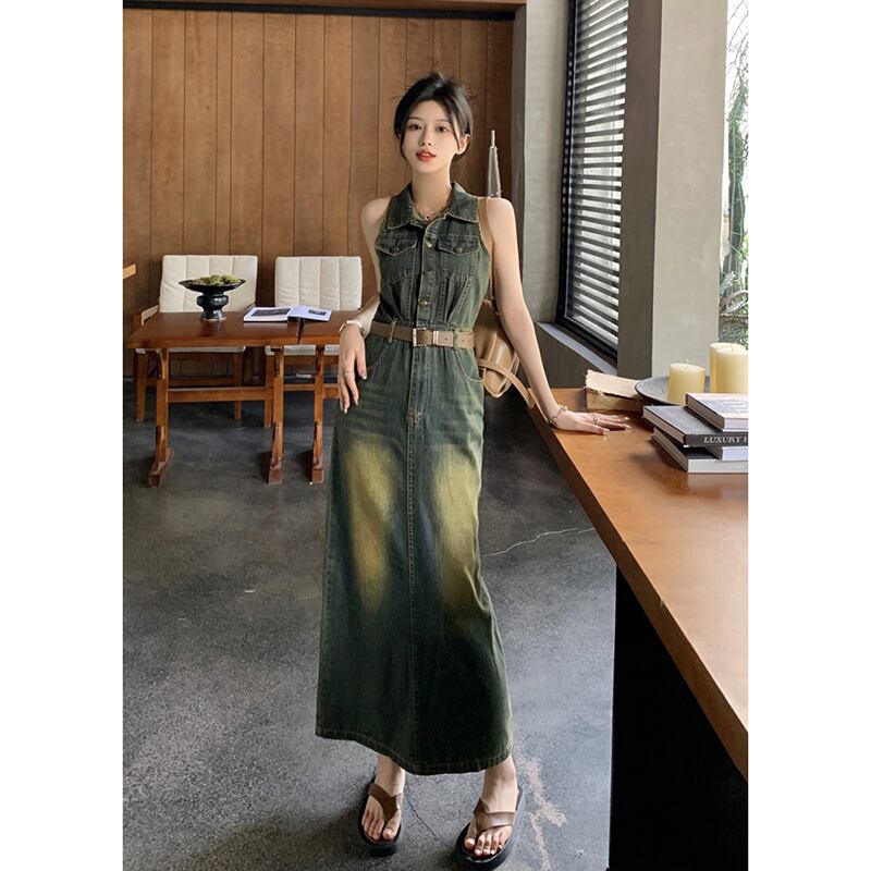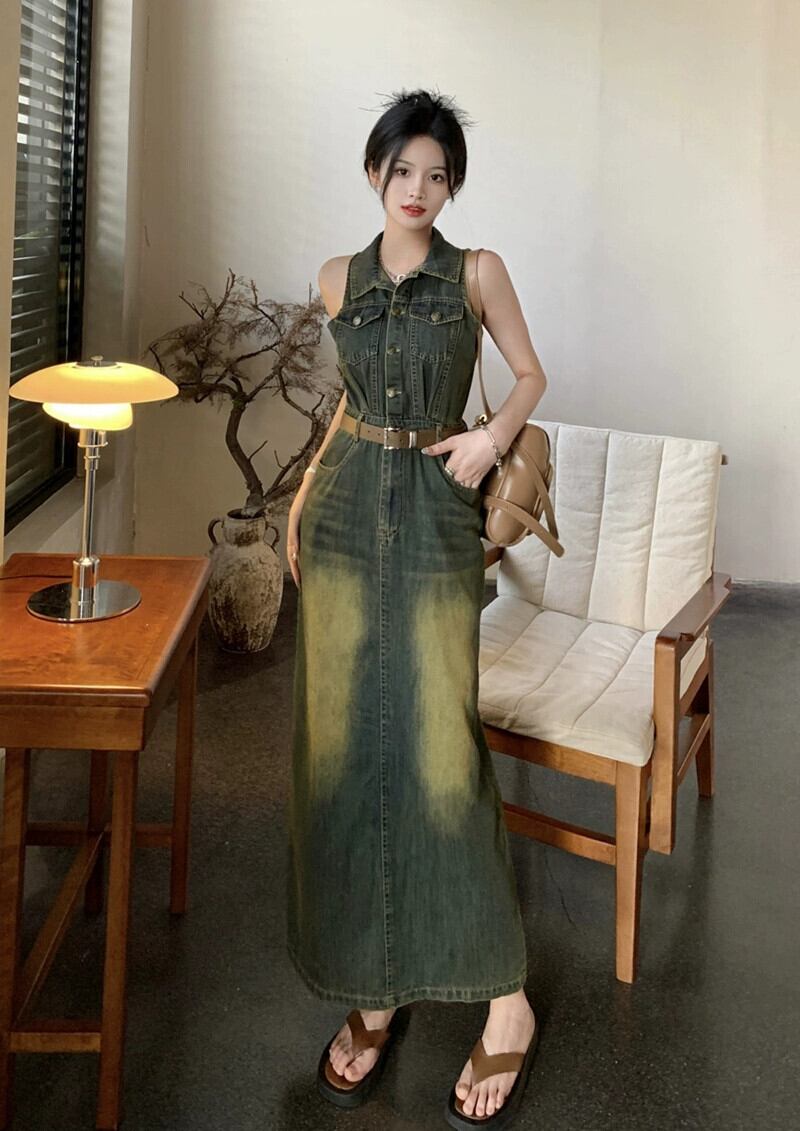 レトロな香港スタイルのデニムベストドレス女性の夏の新しいラペルウエストウエストコントラストカラーバッグヒップスカートスリットロングスカート サマー 夏物 missk98324750776