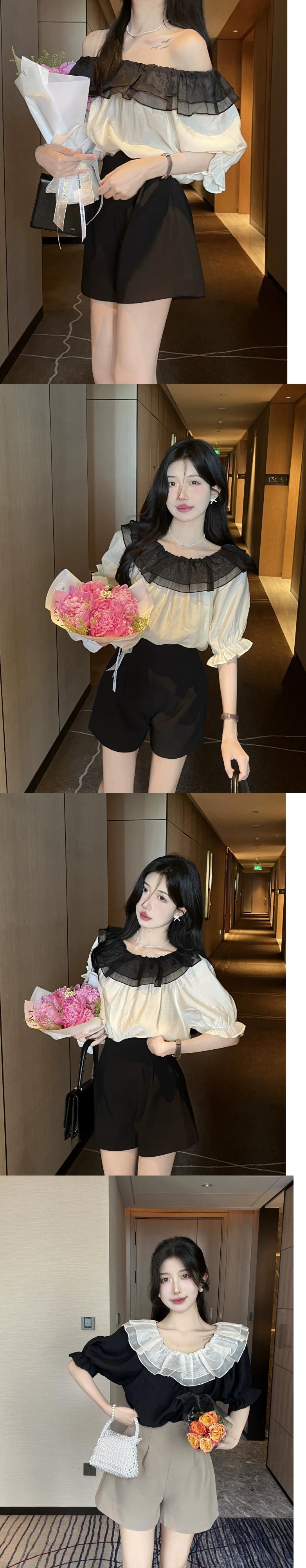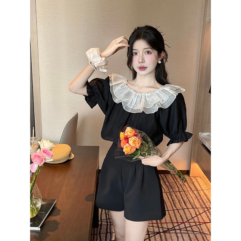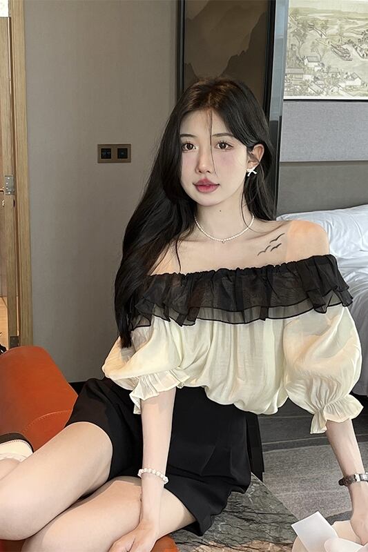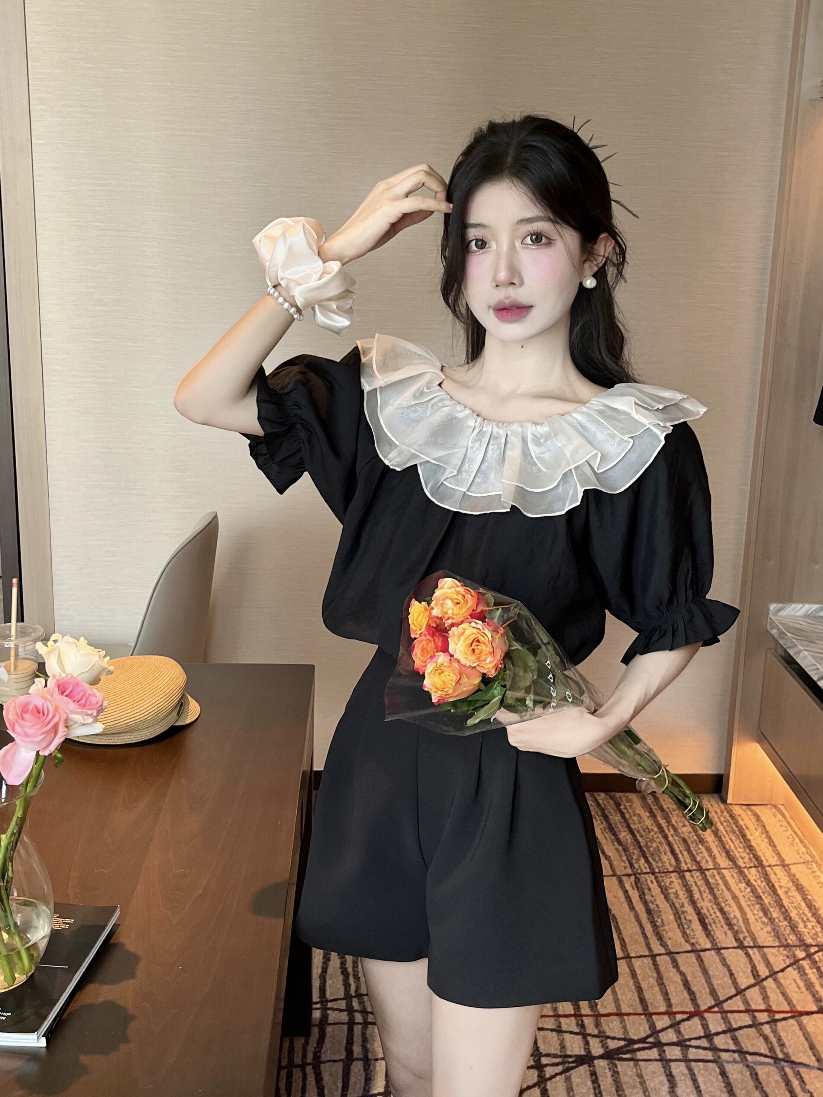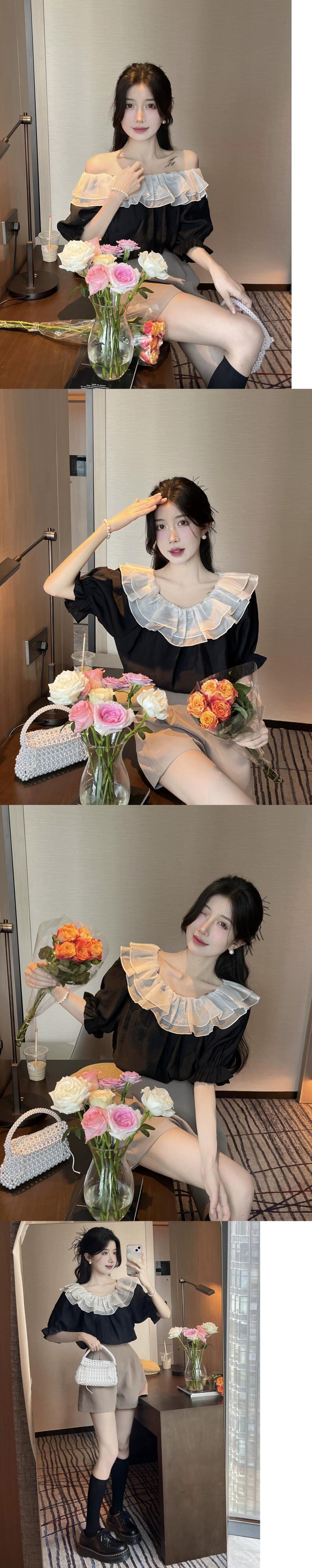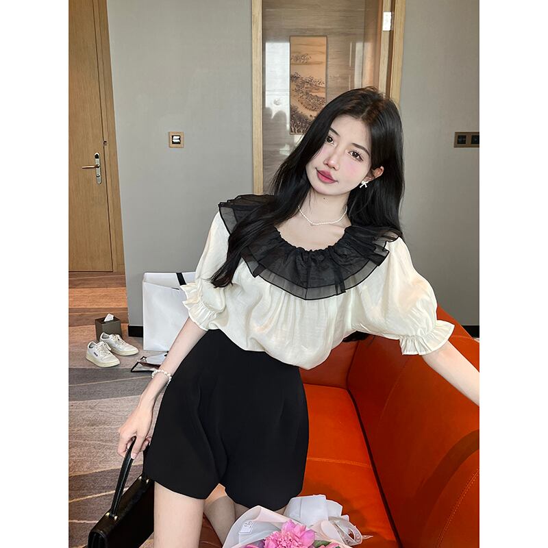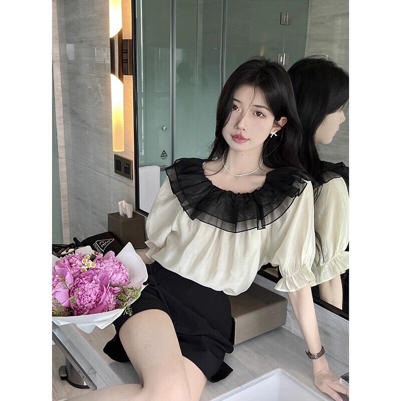 フリル襟半袖シフォンシャツ女性の夏の新しいフレンチスタイルのデザインセンスコントラストカラー気質トップ サマー 夏物 missk63578295040