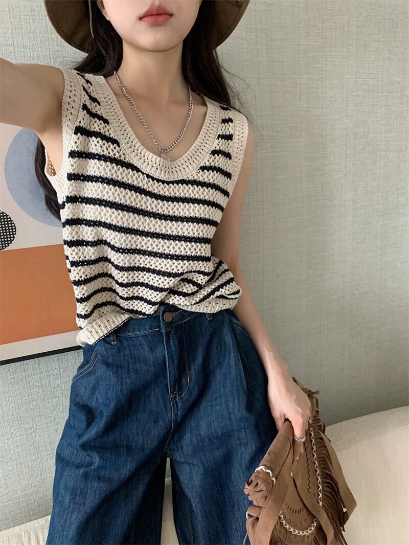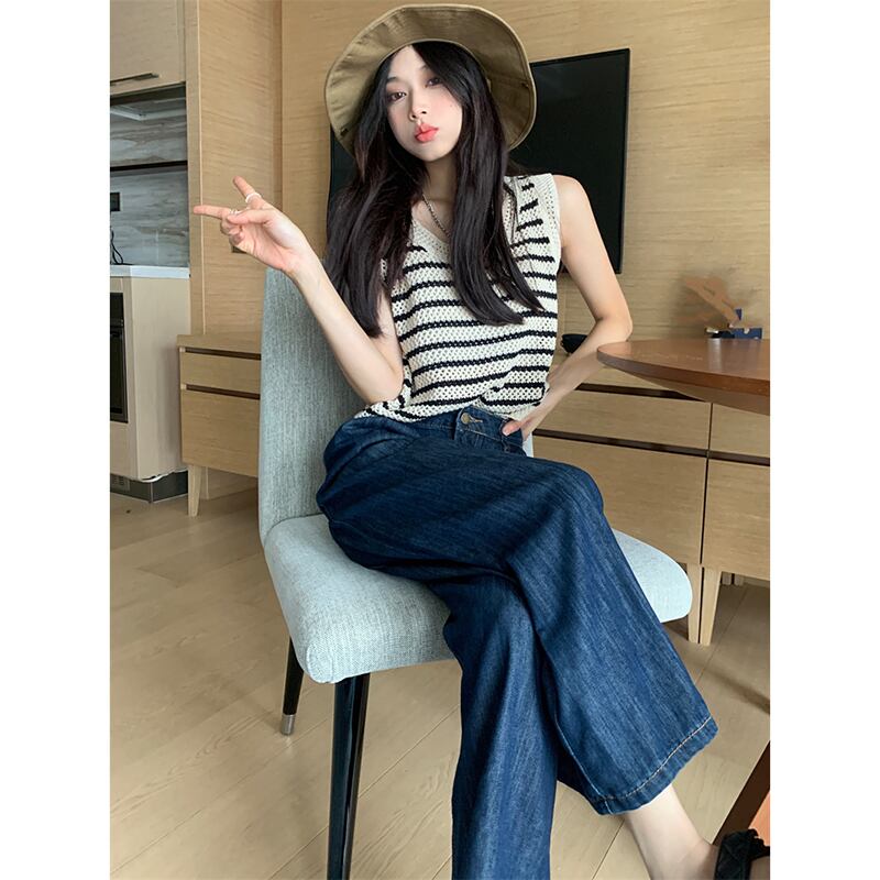 色:ジーンズ,ブラックアプリコットストライプベスト