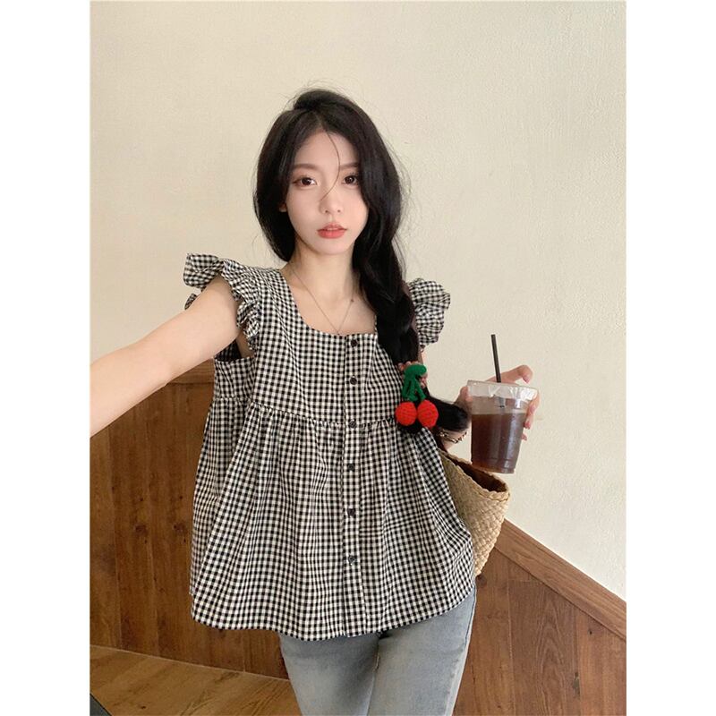 甘いチェック柄小さなフライングスリーブシャツ女性の夏の新しいフレンチスタイルの年齢を軽減する小さなデザインセンスシックな小さなシャツトップ 大人ガーリー スウィート キュート カジュアル サマー 夏物 missk12247782473