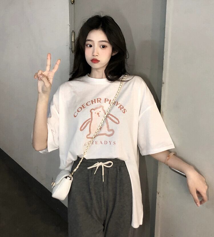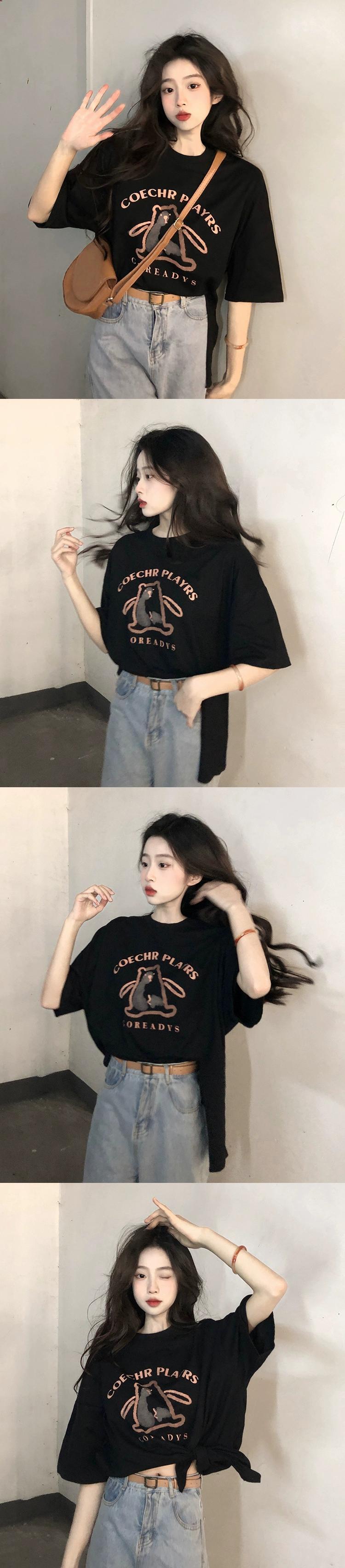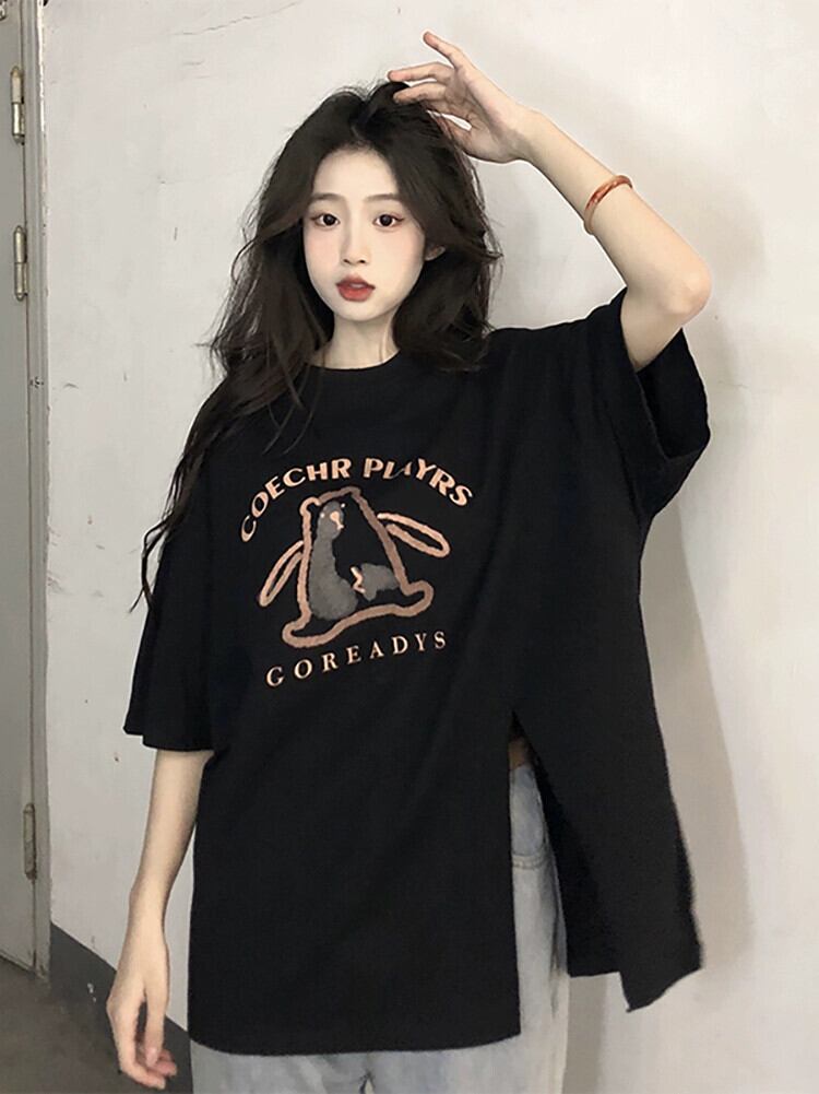 純粋な綿クマ半袖 Tシャツ夏の新しいスリットデザインセンスニッチシックな黒底シャツトップス婦人服 ブラック コットン サマー 夏物 missk18574710781