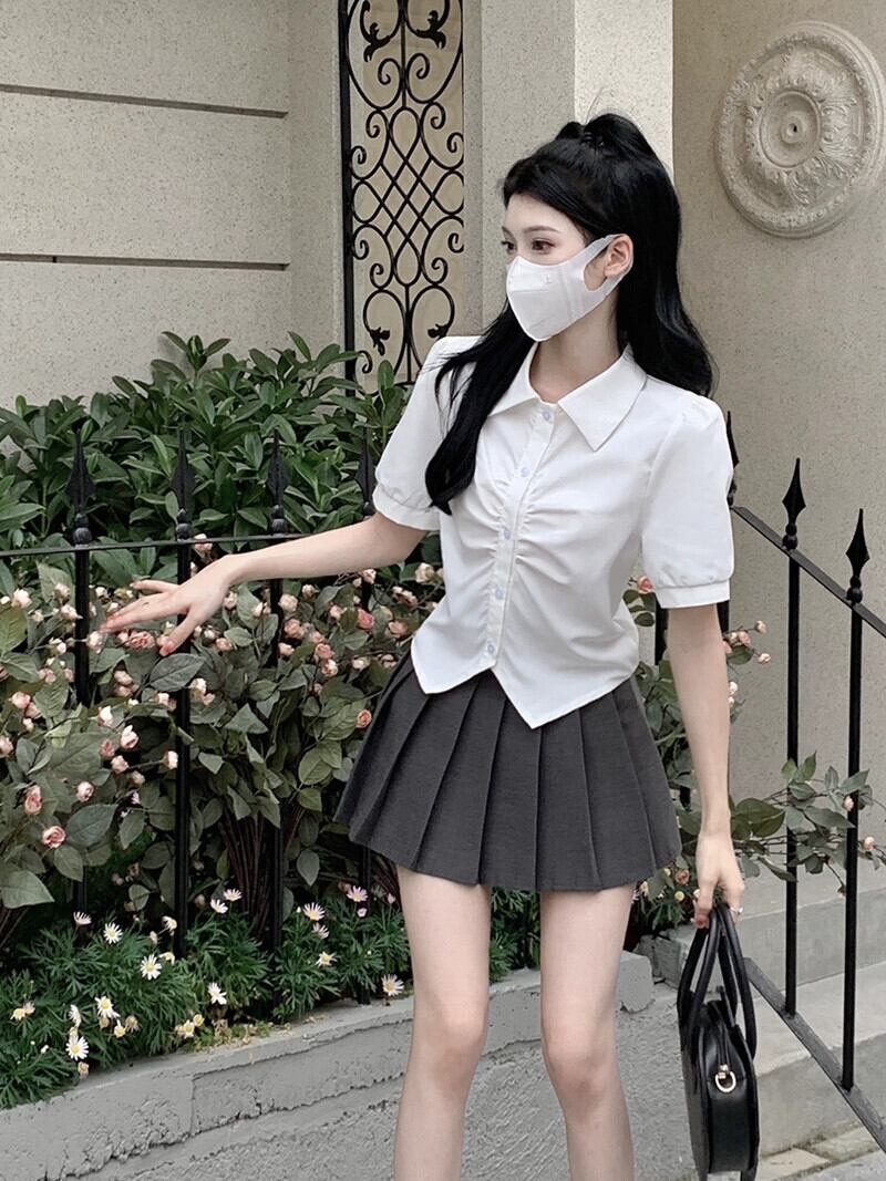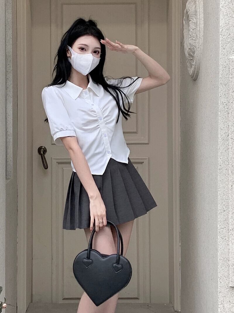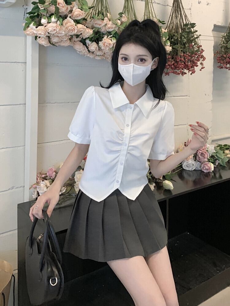 ホワイトデザインセンスプリーツシャツ2023夏新作ニッチ甘辛シック半袖トップレディースシックトレンド 大人ガーリー スウィート キュート カジュアル サマー 夏物 missk27051205416