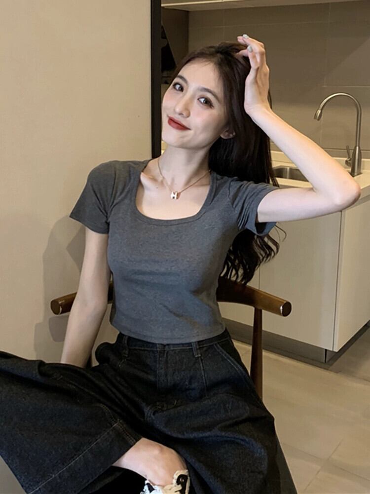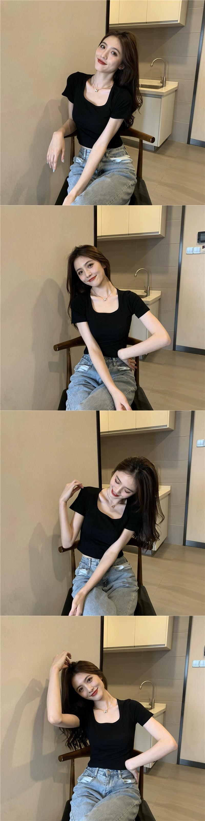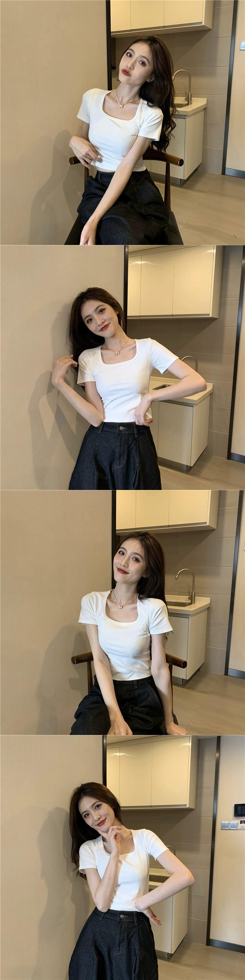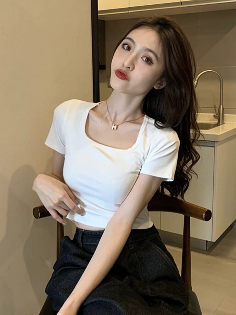 スクエアカラー半袖白 Tシャツ夏 2023 新しいスリムフィット痩身へそショートセクション注意マシン底トップ女性 ホワイト サマー 夏物 スクウェア missk82126240005