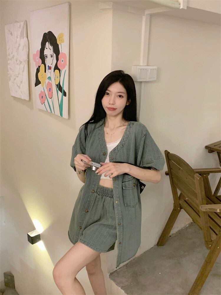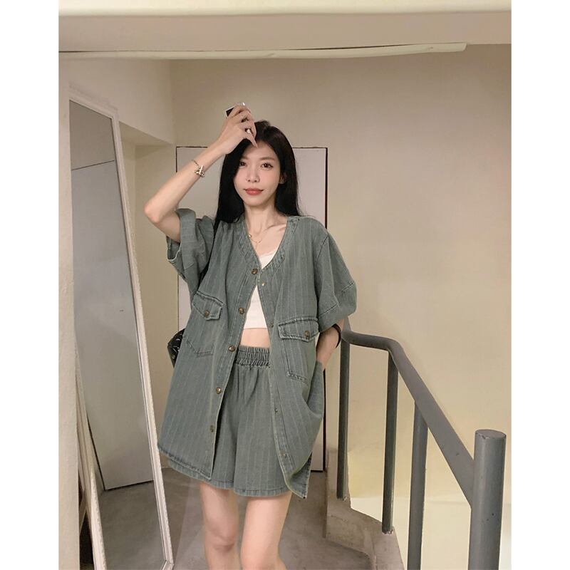 スーパーレトロランタンスリーブ V ネックデニムトップ夏 2023 新しいハイウエストカジュアルショーツファッションスーツ女性 ハイウェスト サマー 夏物 ブルマー Vネック missk69127030416