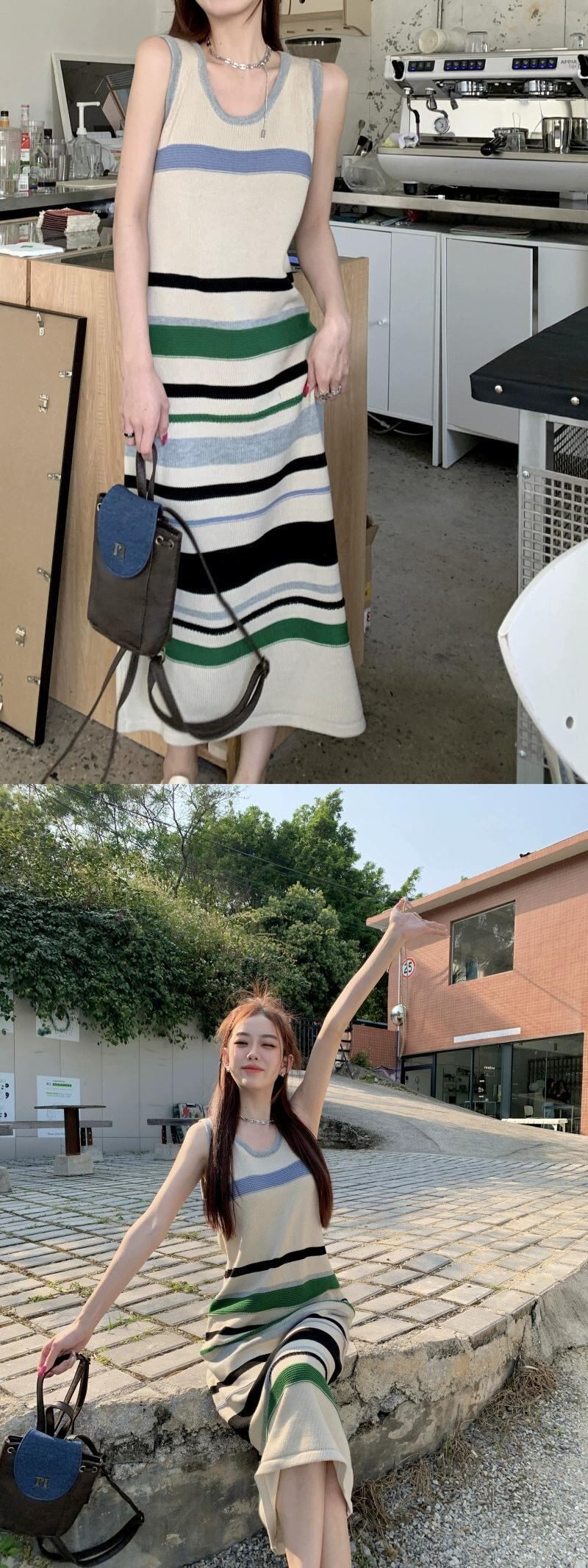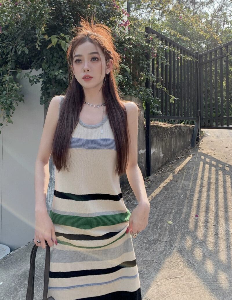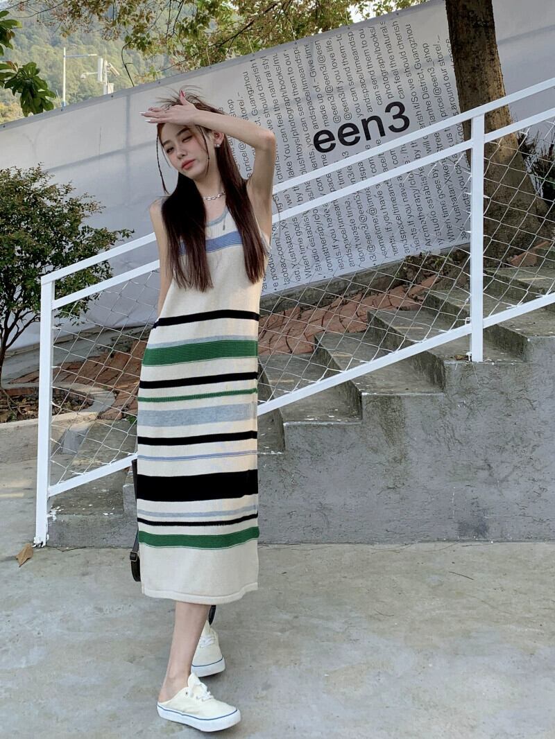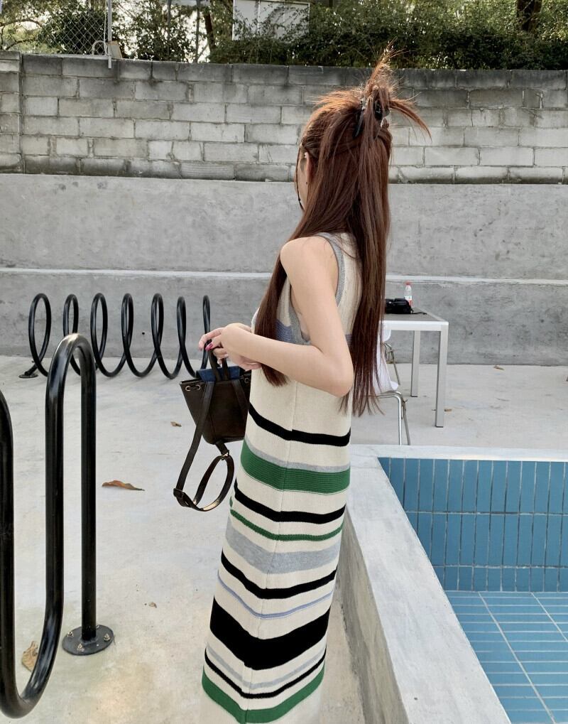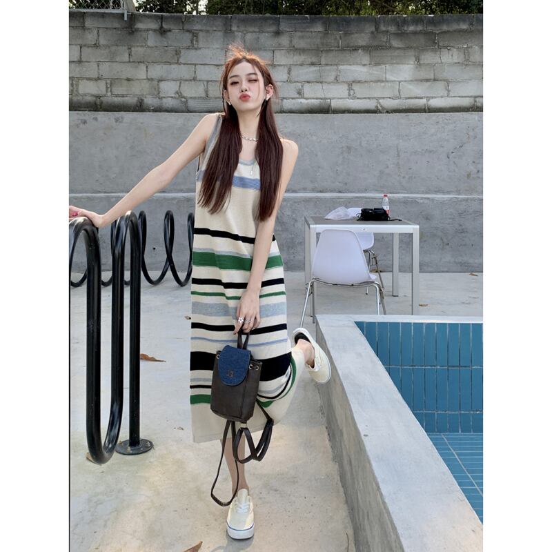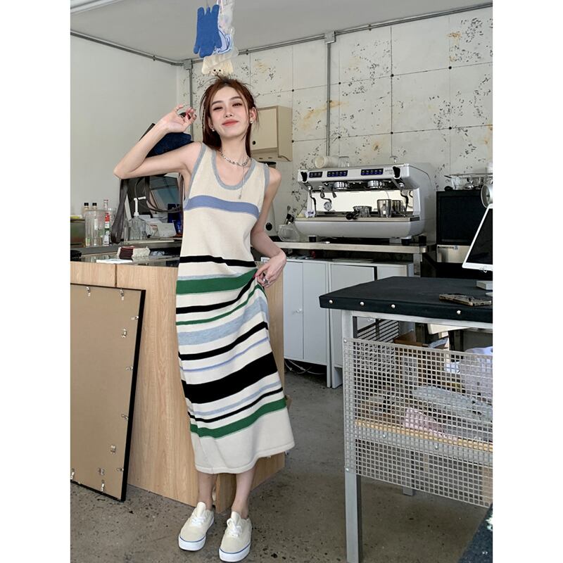 ノースリーブストライプニットベストドレス女性の夏の2023新しいミッドレングスデザインセンス配色スリムスカート サマー 夏物 missk31344333503