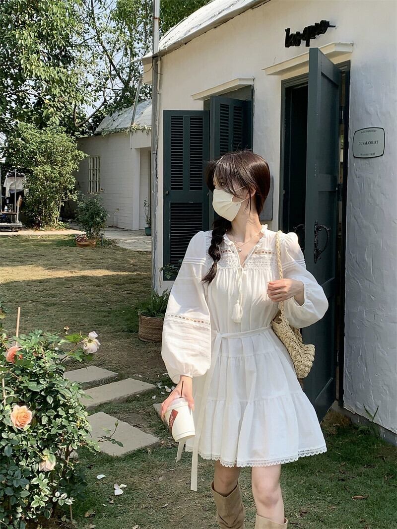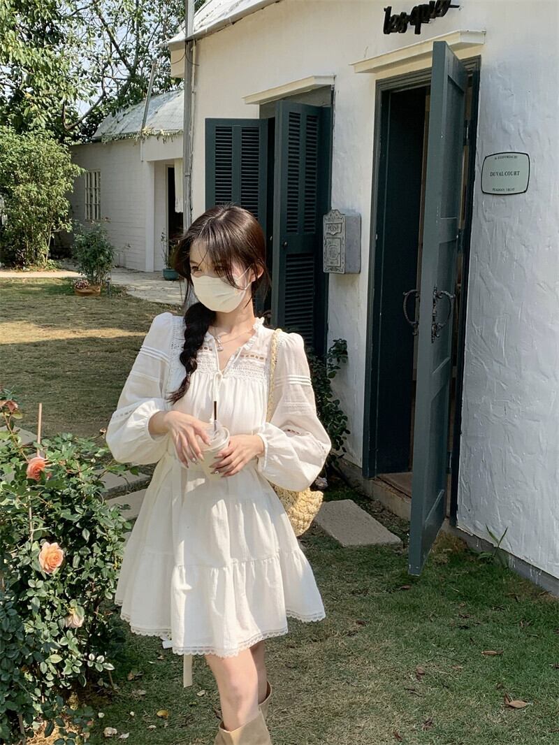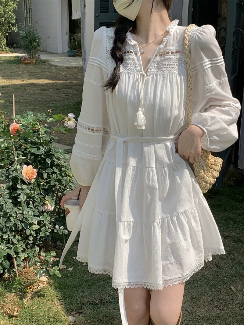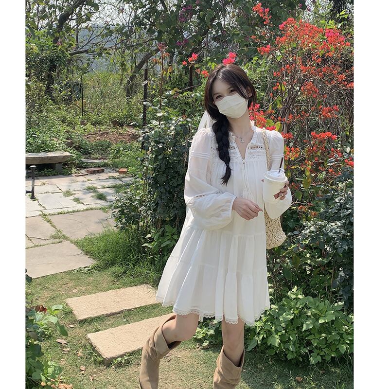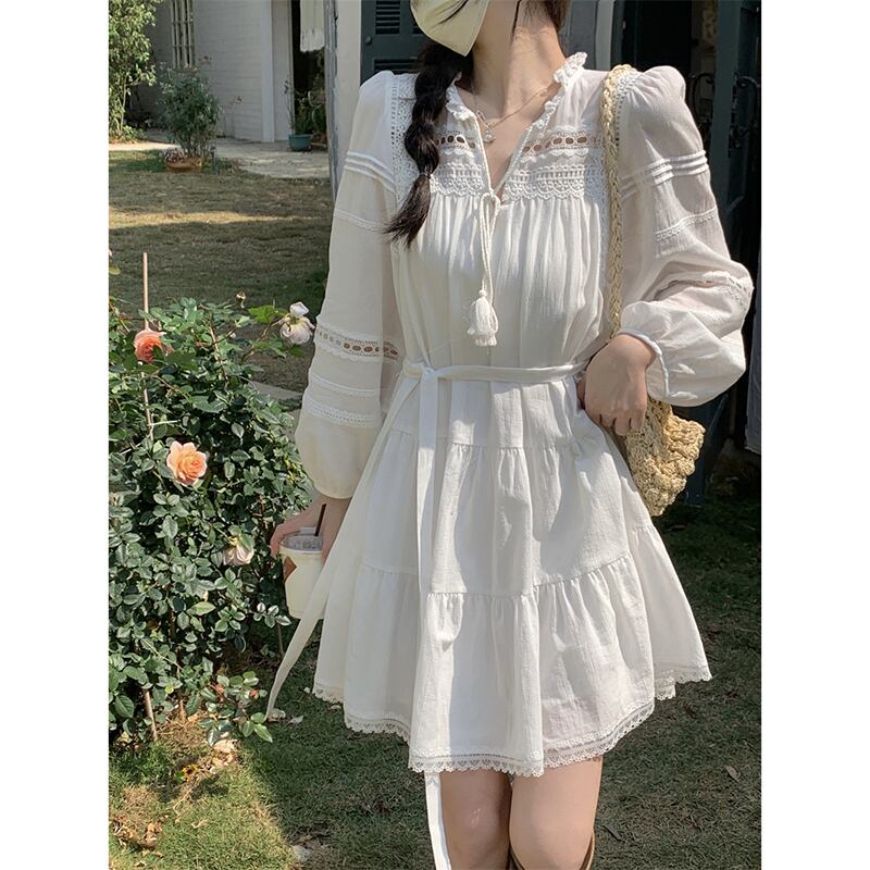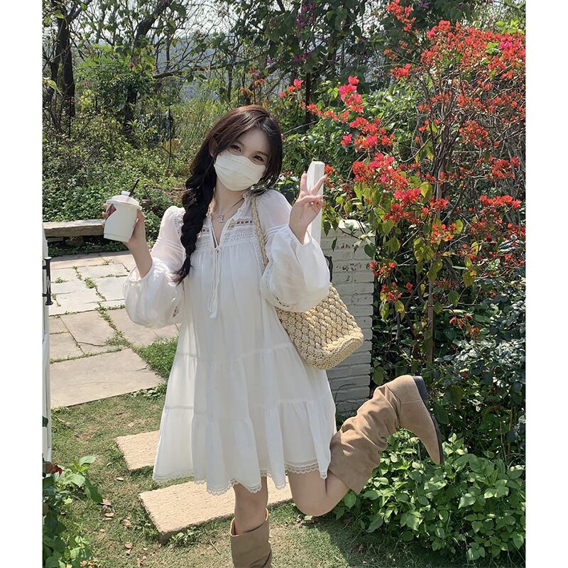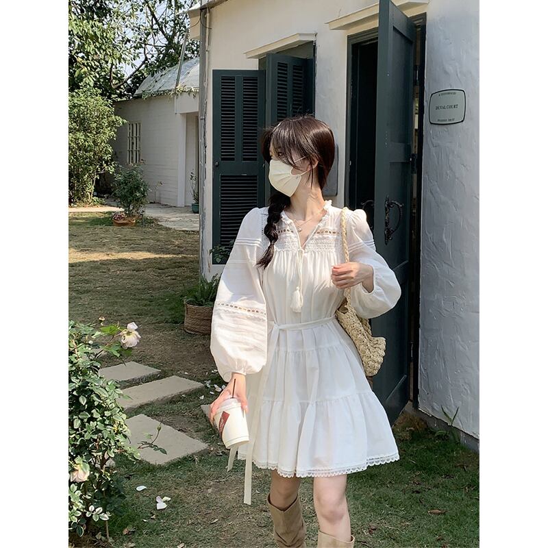 パフスリーブドレスレディース2023夏新作フレンチホワイトVネックネクタイウエスト痩身長袖スカート ロング サマー 夏物 missk67571402332