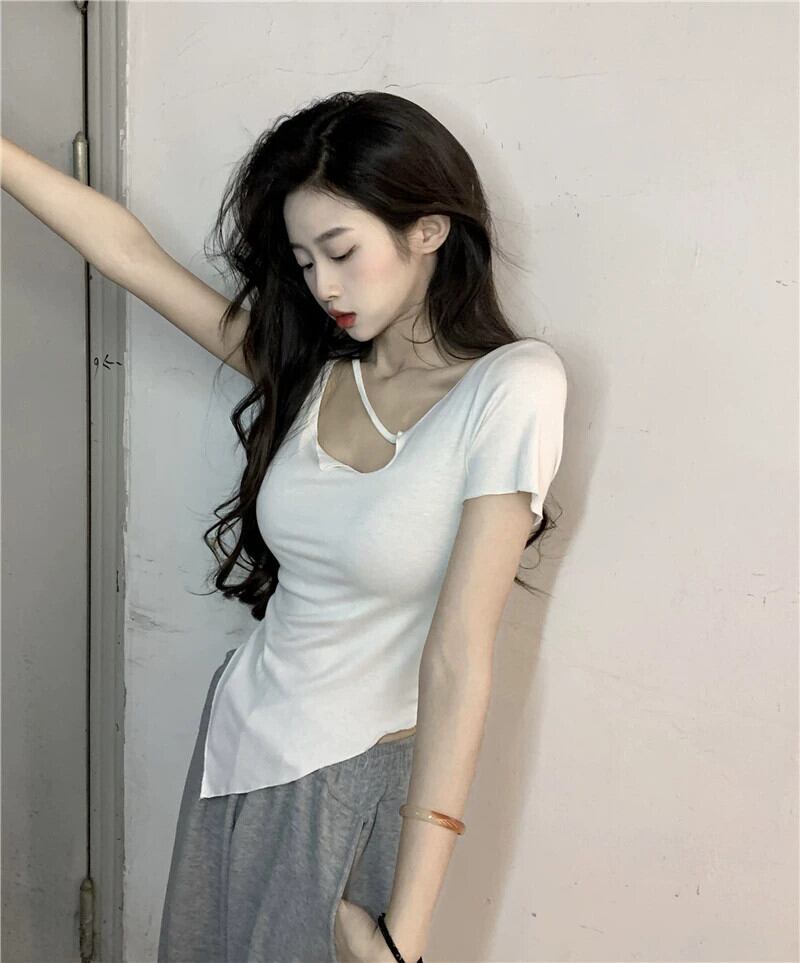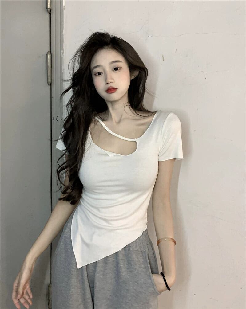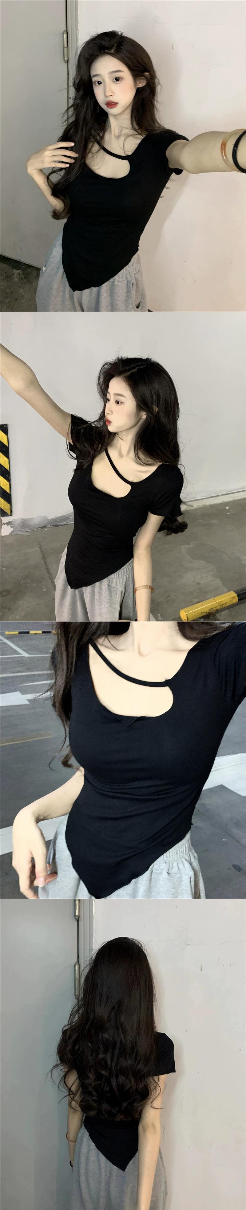 ホット陰謀中空セクシーな半袖 Tシャツ夏 2023 新しいファッションスリムショート不規則なトップの女性 サマー 夏物 missk63558784808