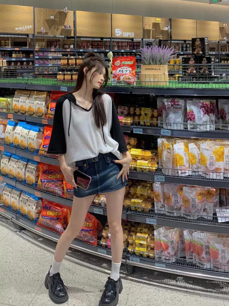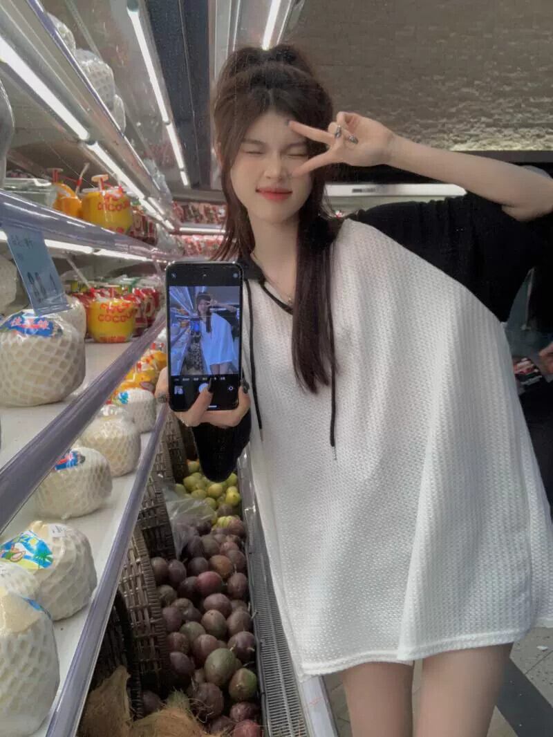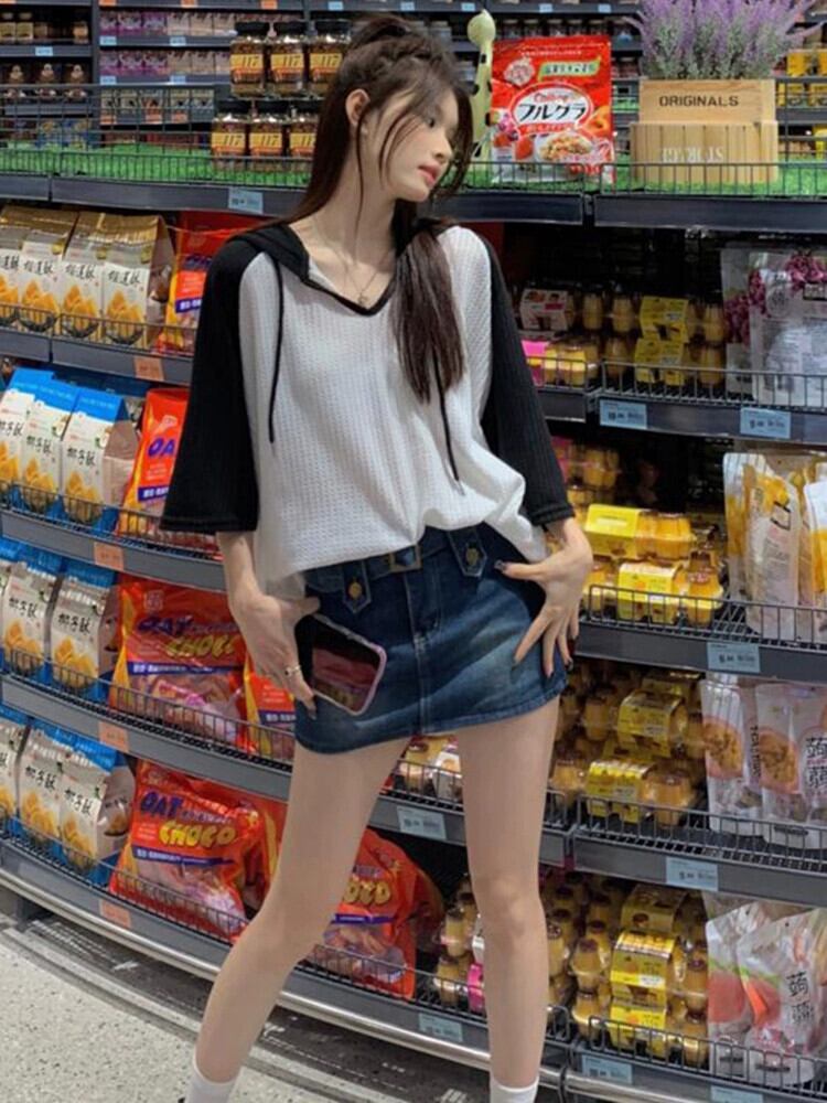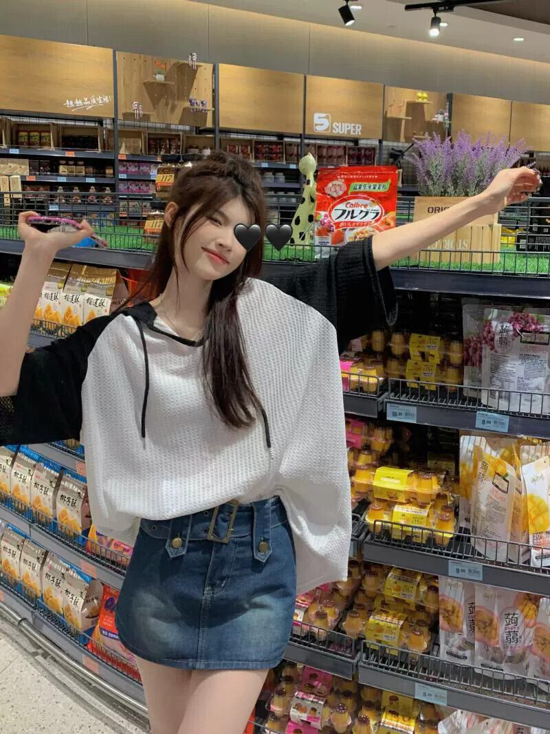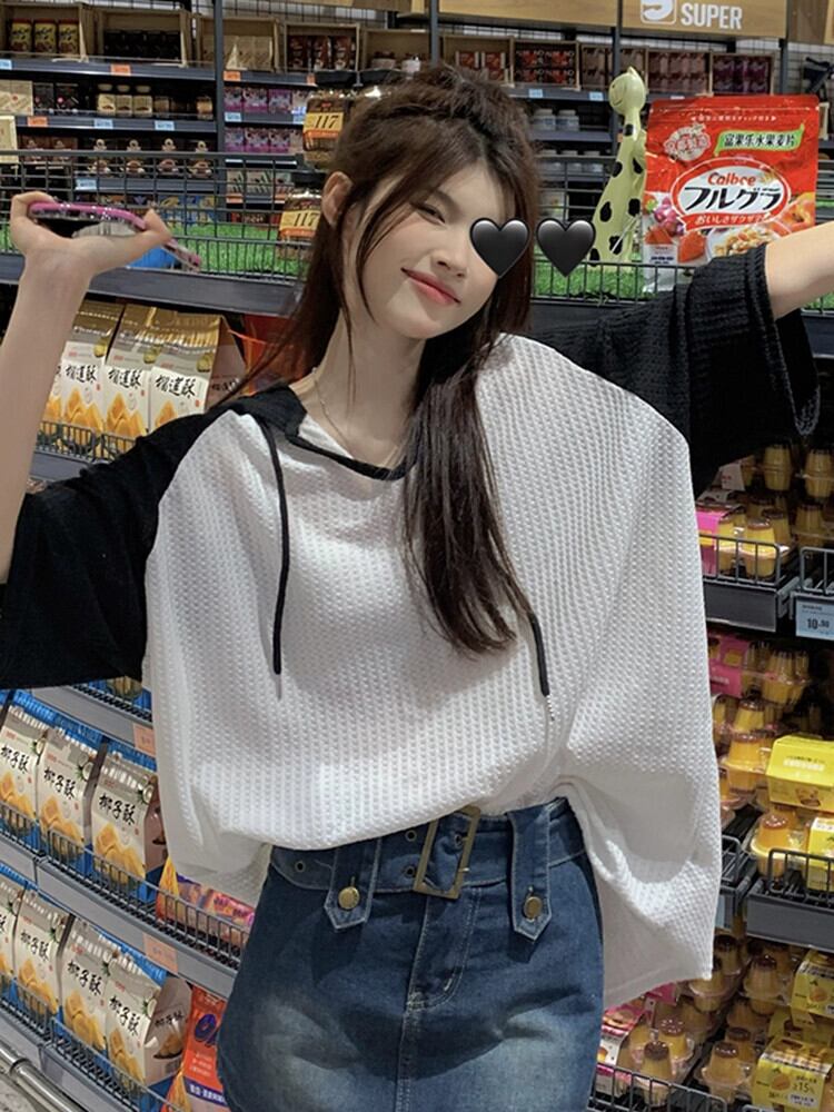 コントラストカラーのフード付きミッドレングス日焼け止め Tシャツ夏 2023 新しいスタイルルーズ怠惰なデザイントップス婦人服 サマー 夏物 missk33054273784