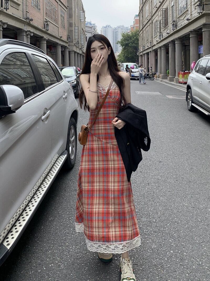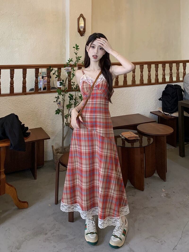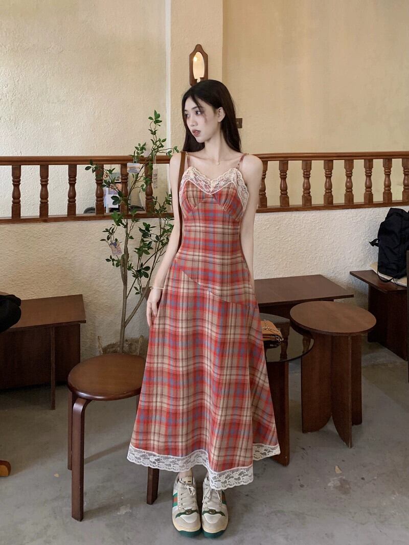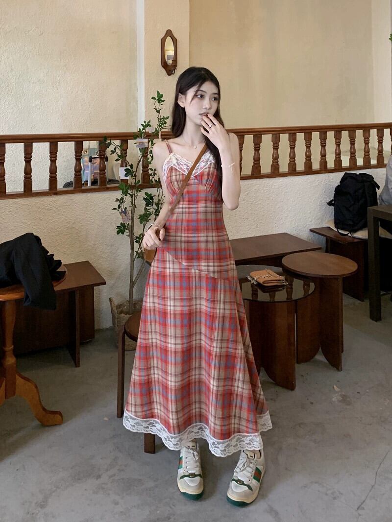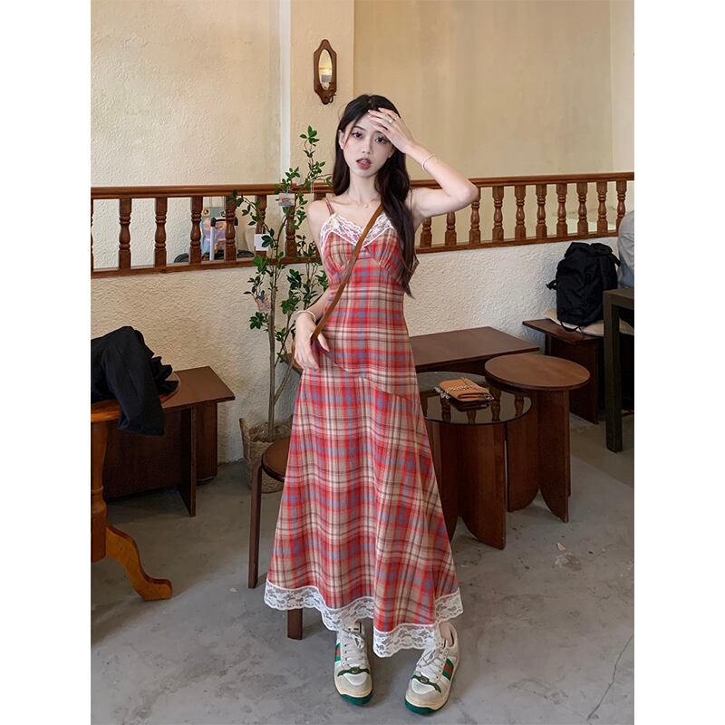 レースチェック柄スリングドレスの女性の夏の 2023 新しい甘いフランスのミッドレングスウエスト A ラインスカート 大人ガーリー スウィート キュート カジュアル サマー 夏物 Aライン missk7859818750