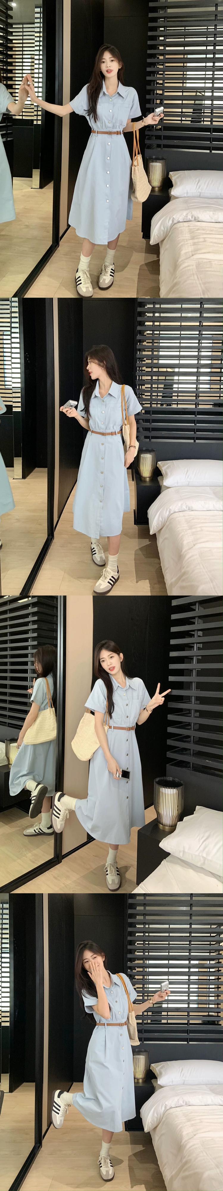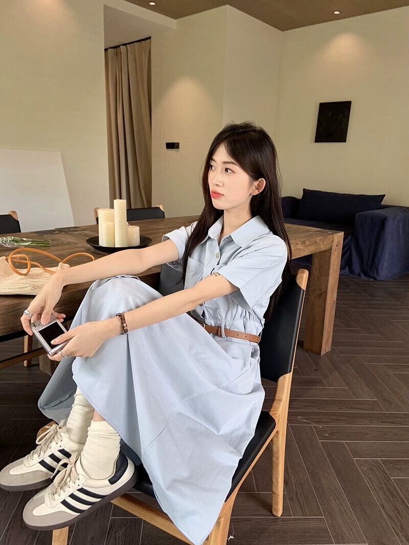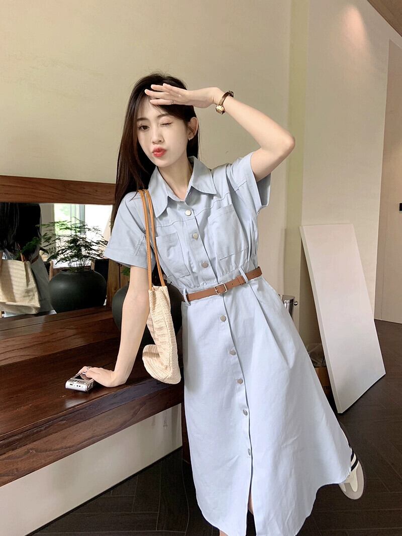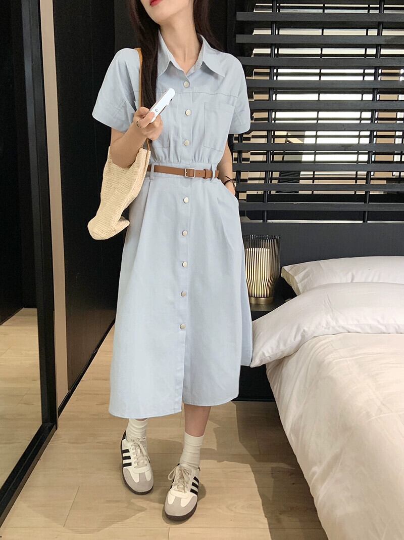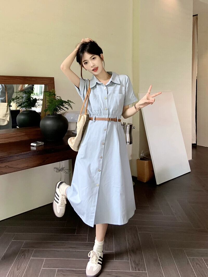 ポロ襟ブルードレス夏 2023 新しいファッションスリムウエスト半袖ミッドレングスデニムスカートトレンディな女性 サマー 夏物 missk49234358648