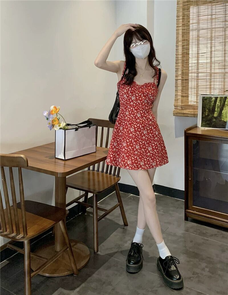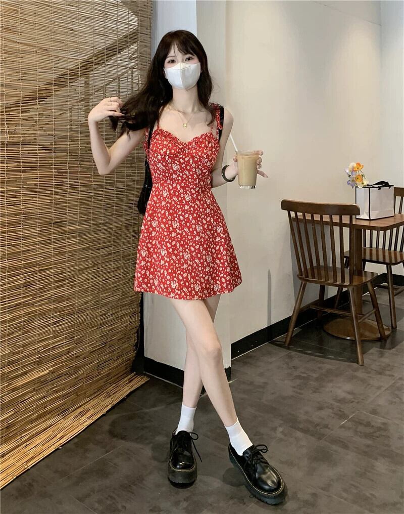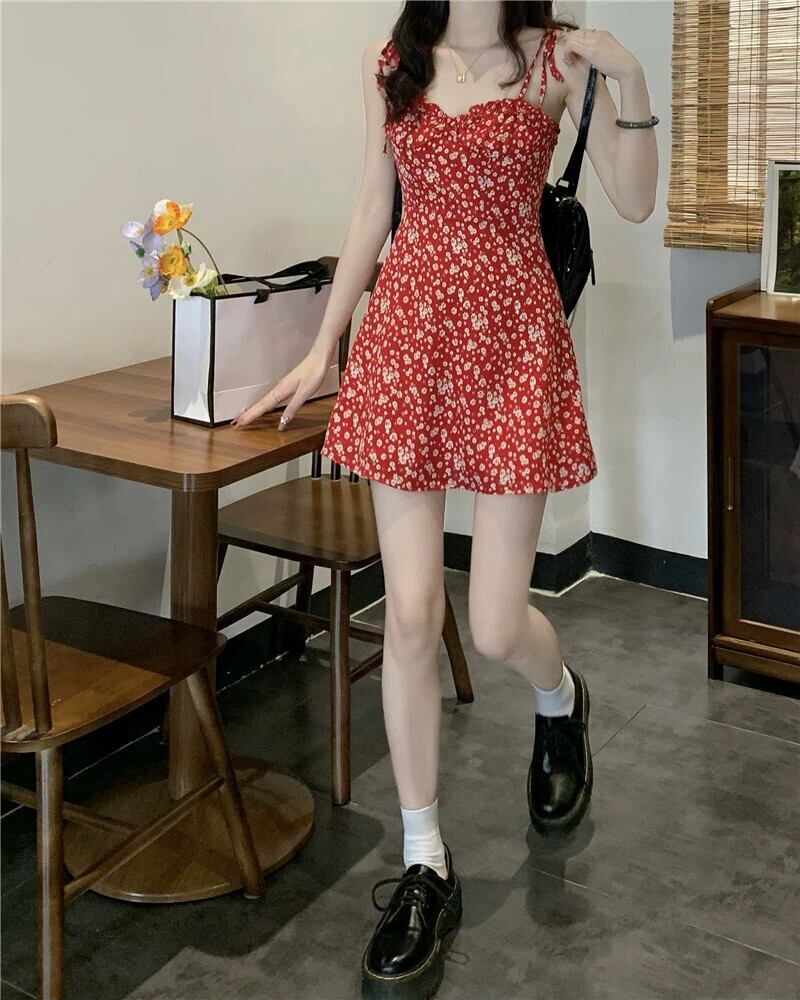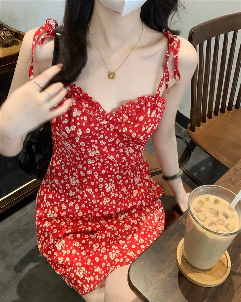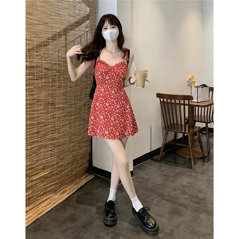 甘くてスパイシーな赤い花柄ショートスカート夏eignスタイルの小さな新鮮なウエストベルトAラインサスペンダードレストレンディ レッド 大人ガーリー スウィート キュート カジュアル サマー 夏物 ハーネス missk44150606207