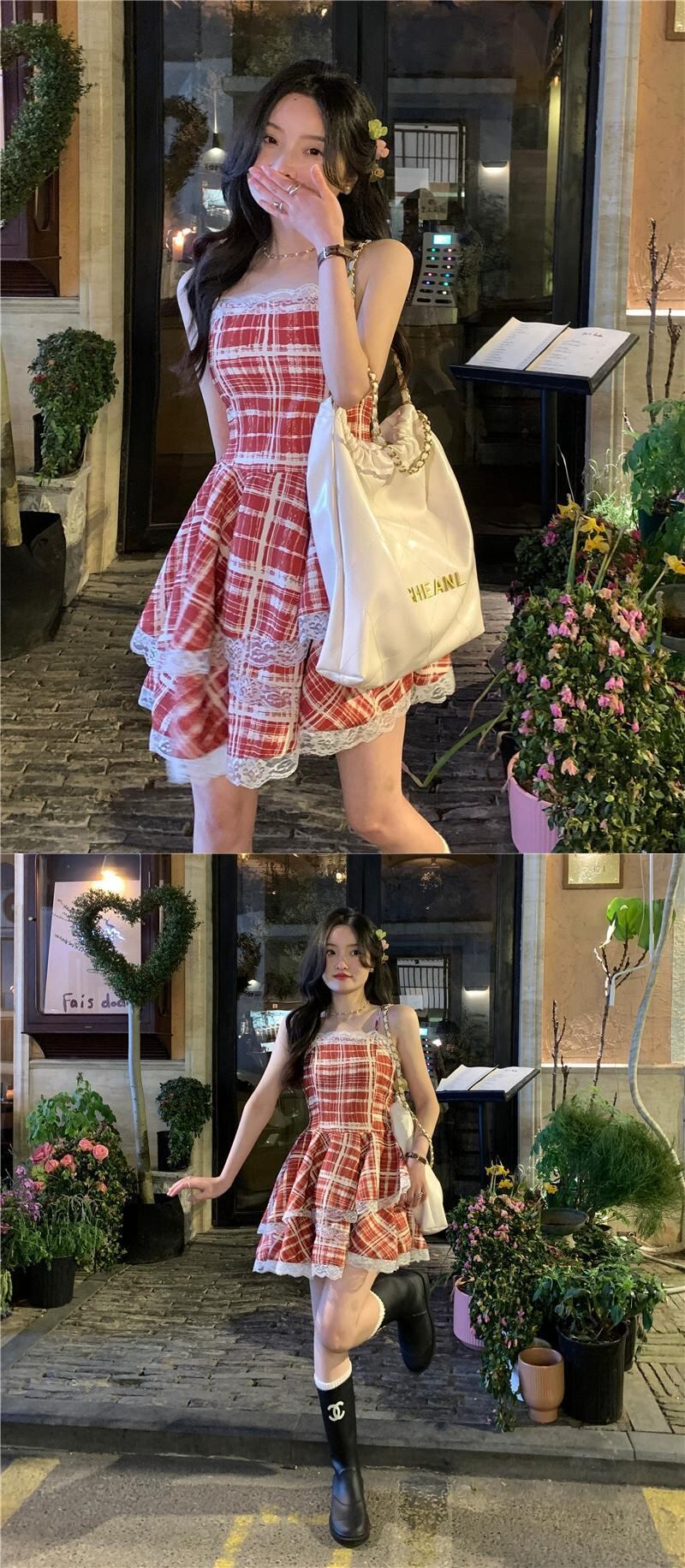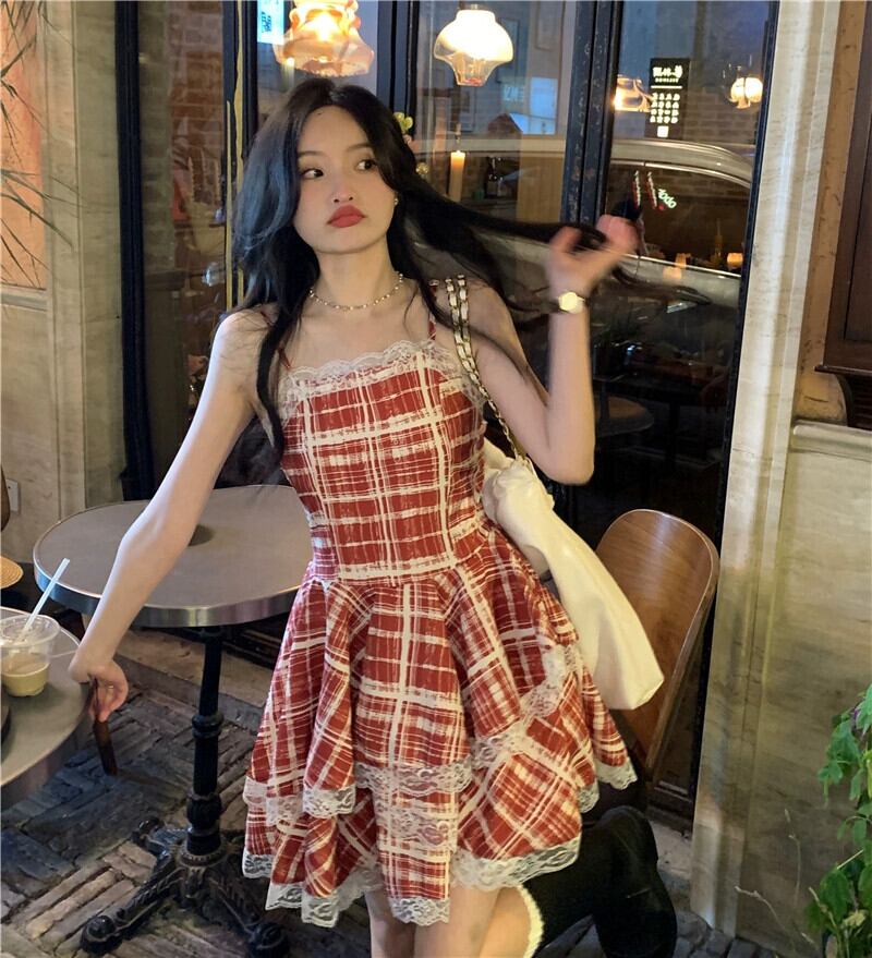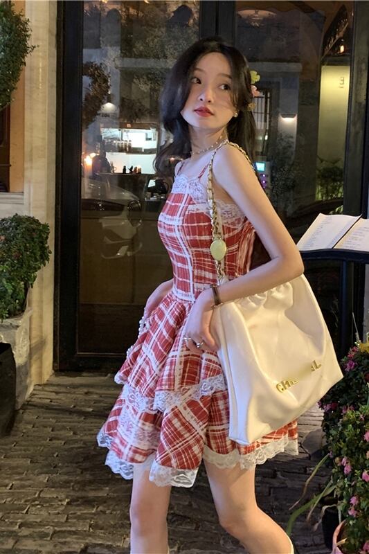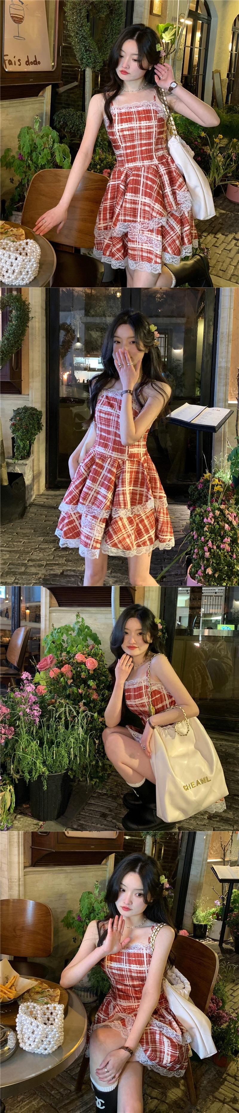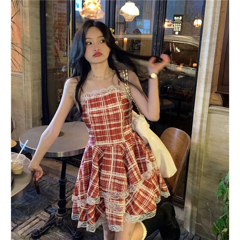 レースステッチチェック柄サスペンダードレス女性の夏 2023 ウエスト痩身 A ラインふくらんスカート サマー 夏物 Aライン missk61160554494