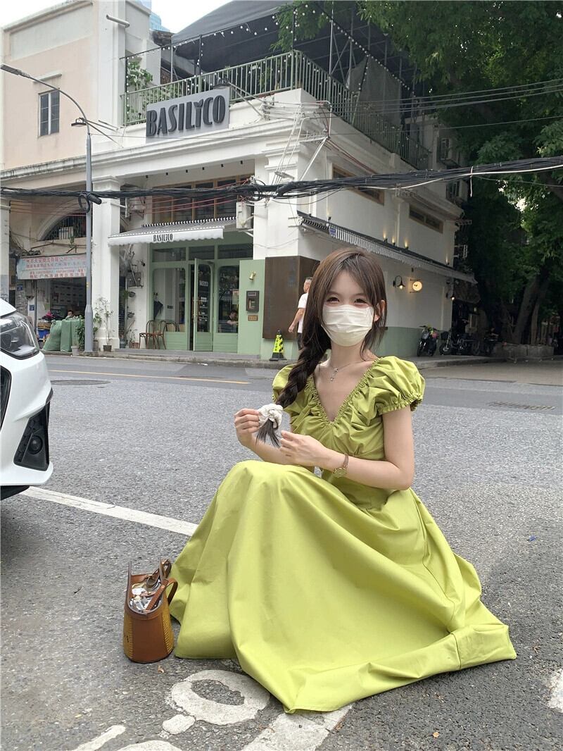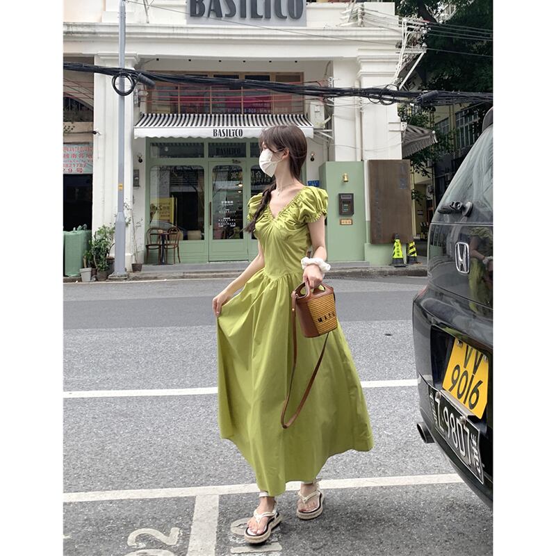 夏フレンチレトロ 2023 新しいウエスト痩身ファッション気質プリーツ V ネックミドル丈ドレス女性の潮 サマー 夏物 Vネック missk66268661736