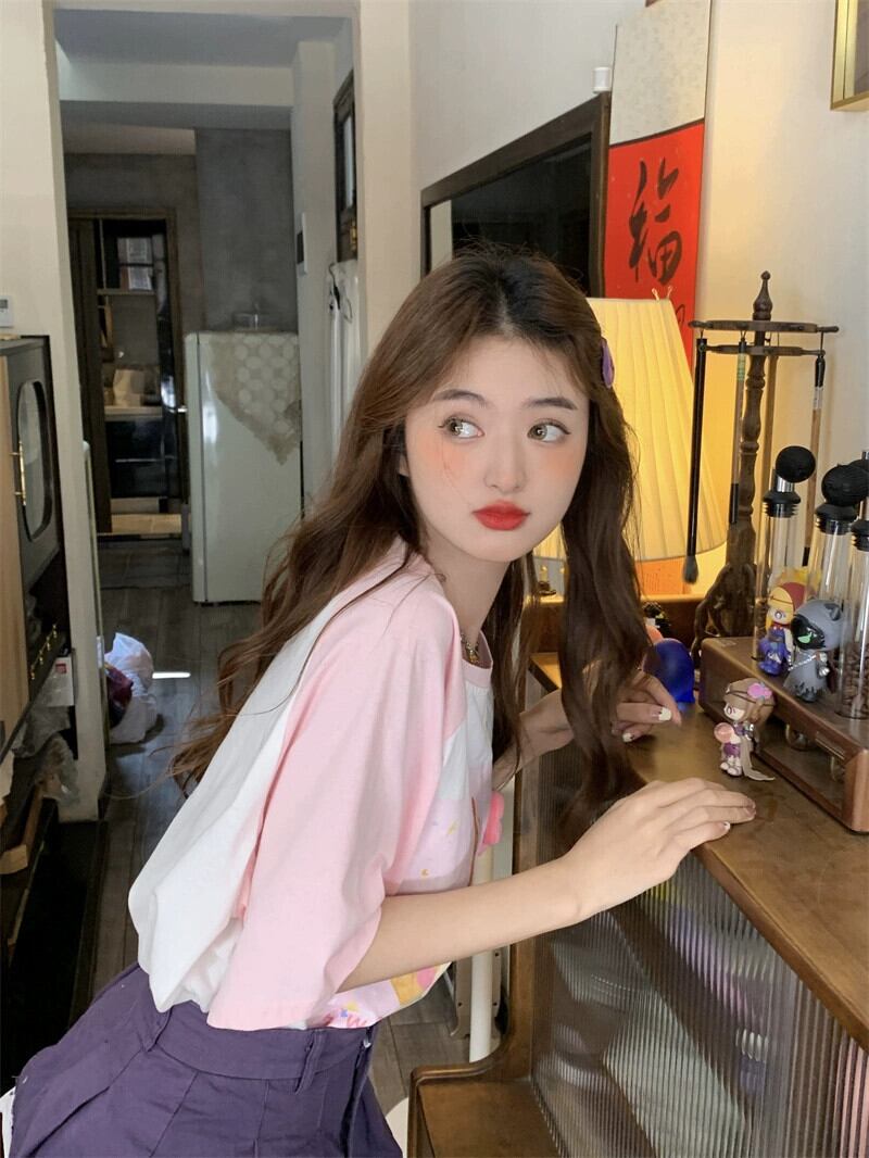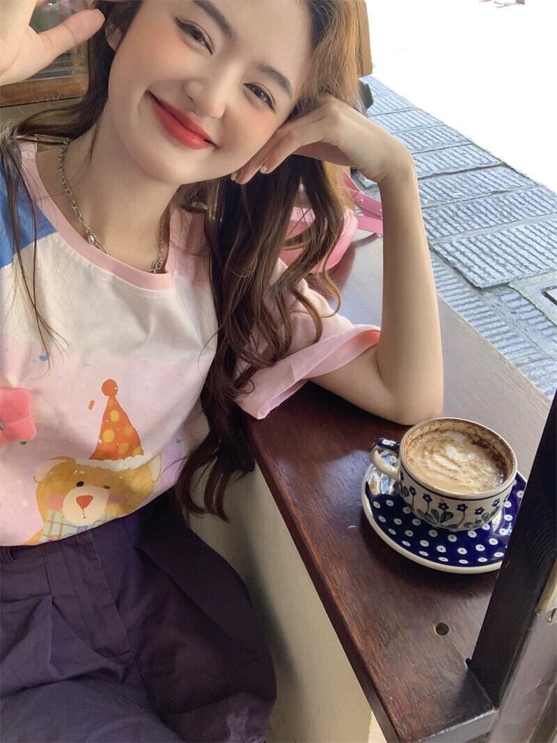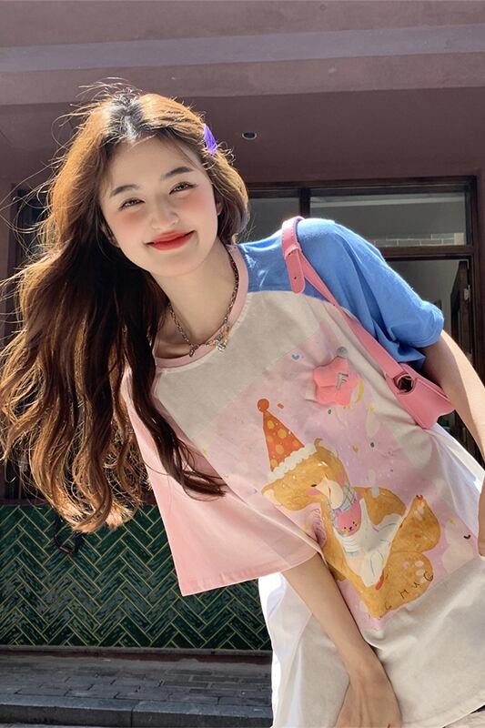 甘いプリントクマ Tシャツレディース 2023 夏の新色コントラストデザイン感ゆったりミドル丈半袖トップスイン 大人ガーリー スウィート キュート カジュアル サマー 夏物 missk98322321785
