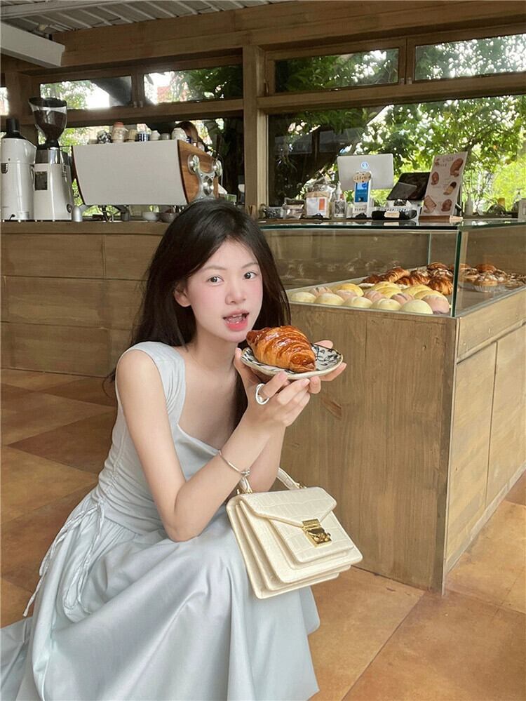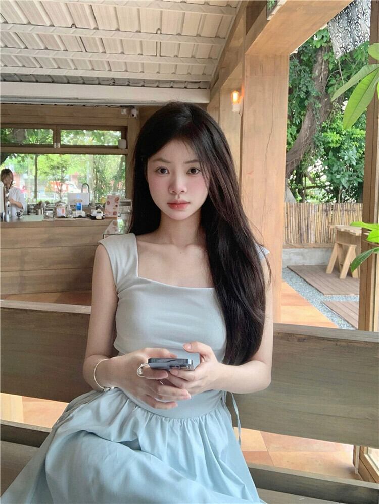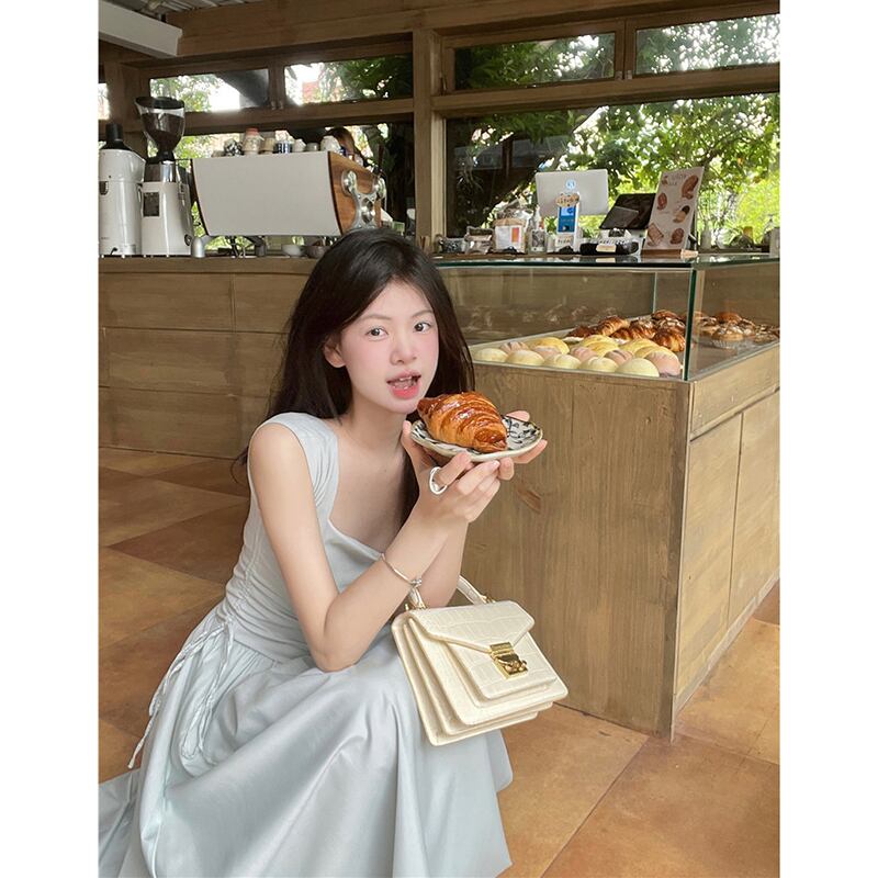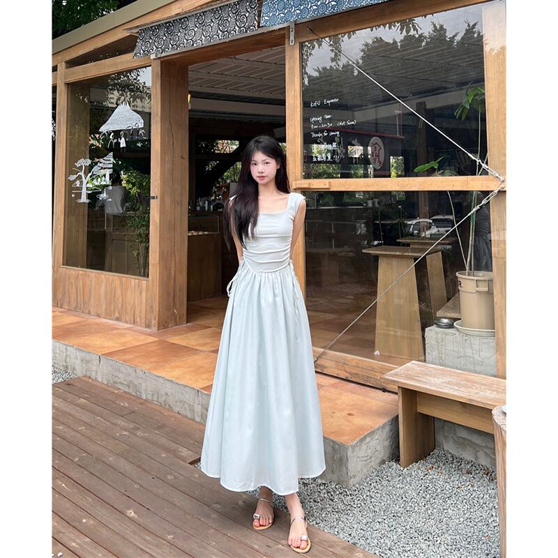 フレンチスクエアネックサスペンダードレスレディースサマーウエストステッチ巾着ロングスカートトレンディ 夏物 スクウェア missk20992838600