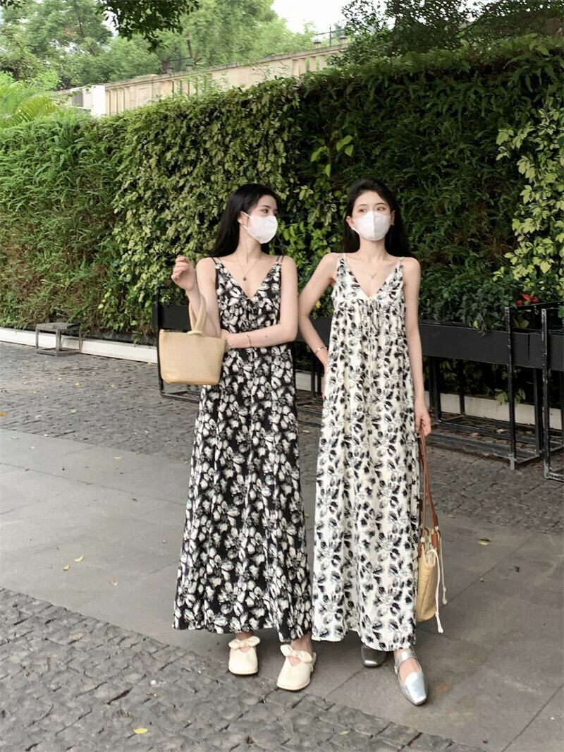 フレンチヘップバーンスタイルフラワープリントロングスカート夏2023新デザイン感覚ルーズノースリーブサスペンダードレス女性 サマー 夏物 フラワーデザイン missk88803022050