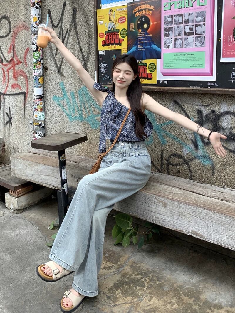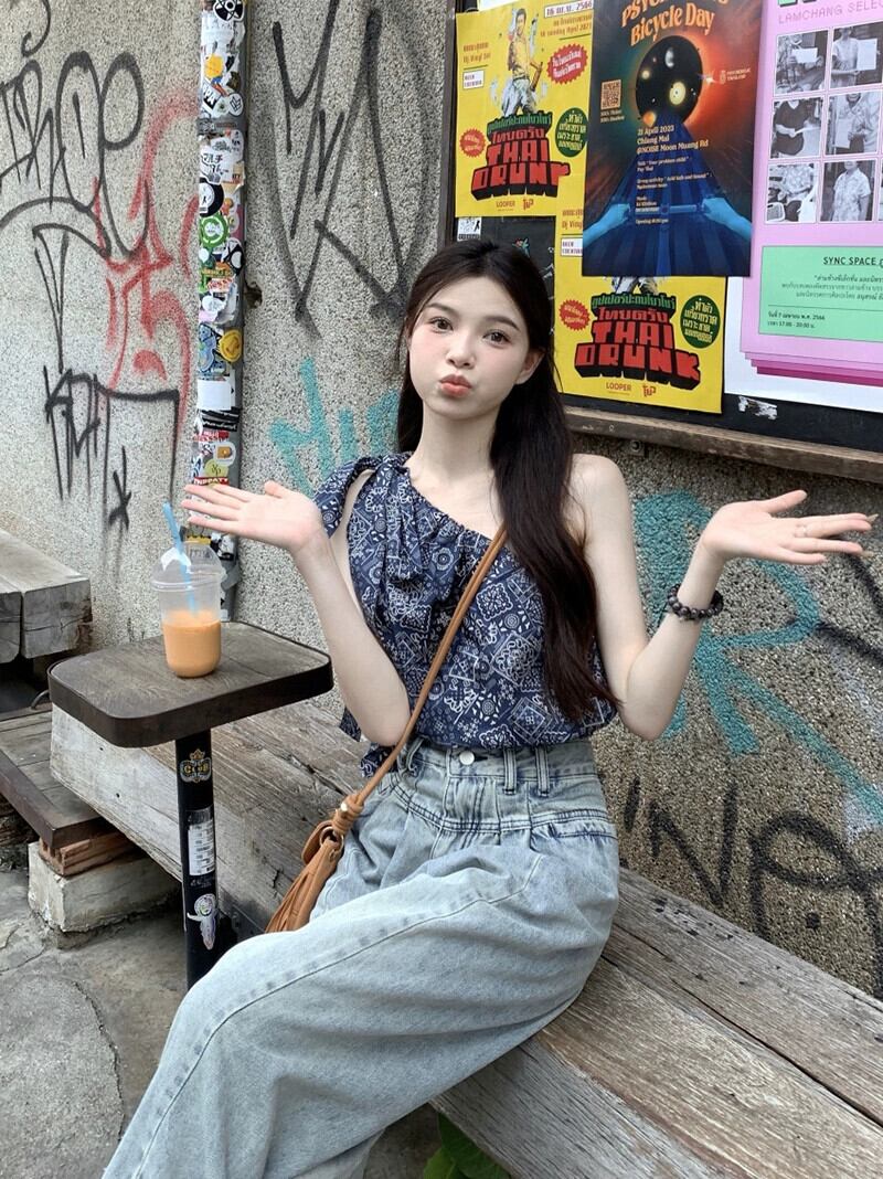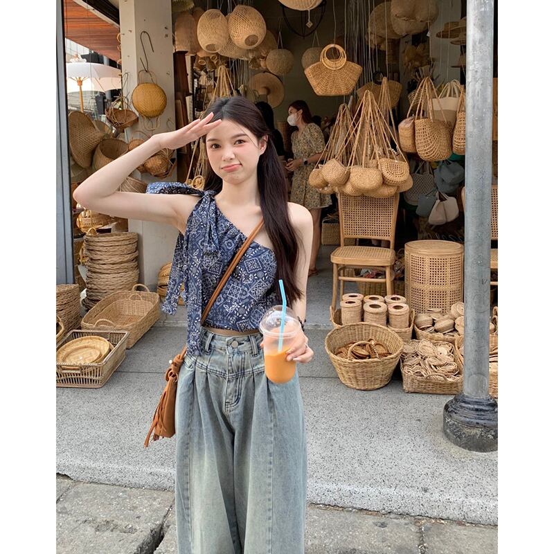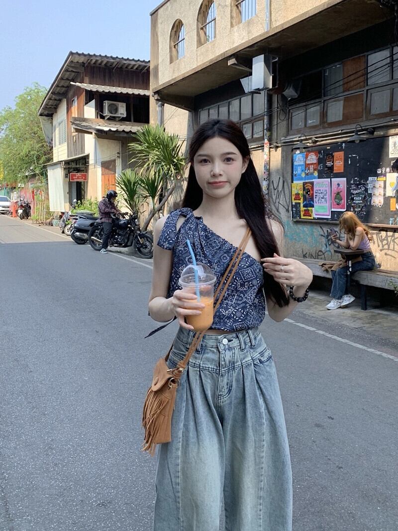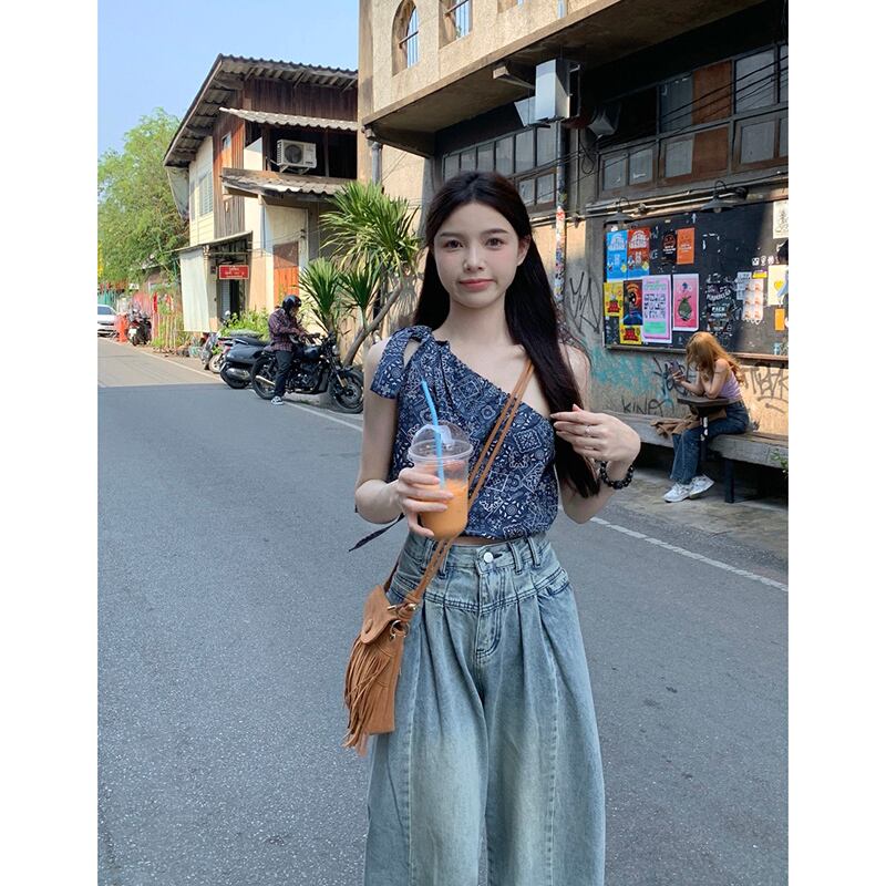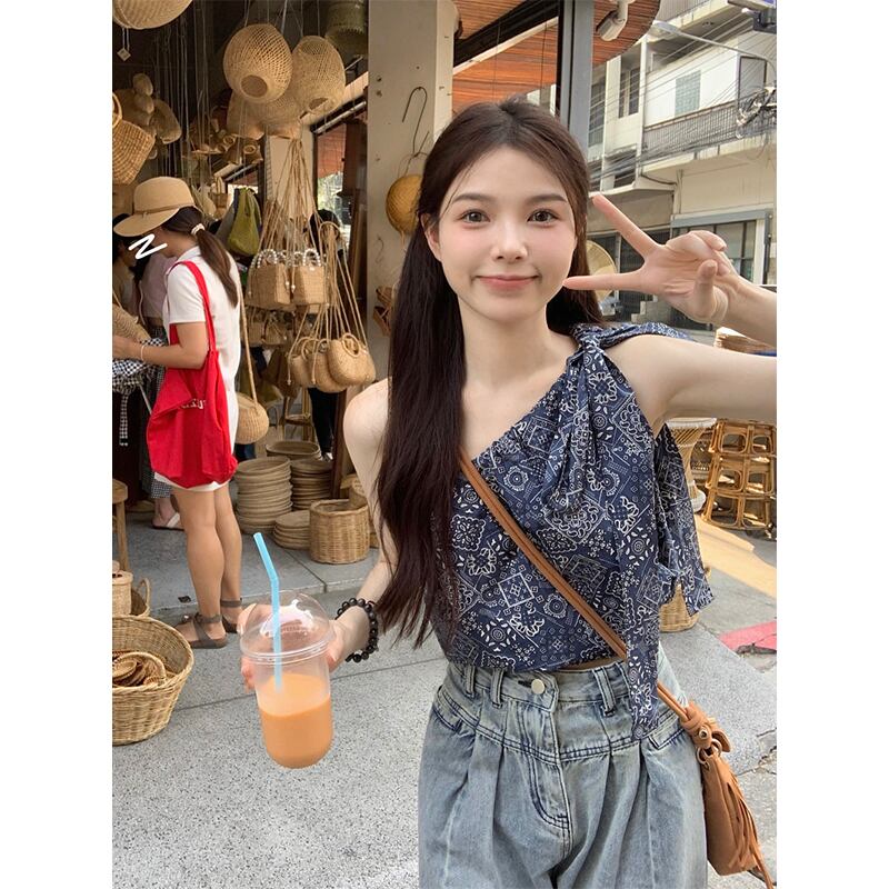 レトロな斜め襟ストラップレスプリントベスト女性の夏の新しいデザインセンスショートストラップストラップキャミソールトップシック サマー 夏物 missk84928200103