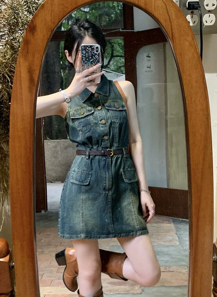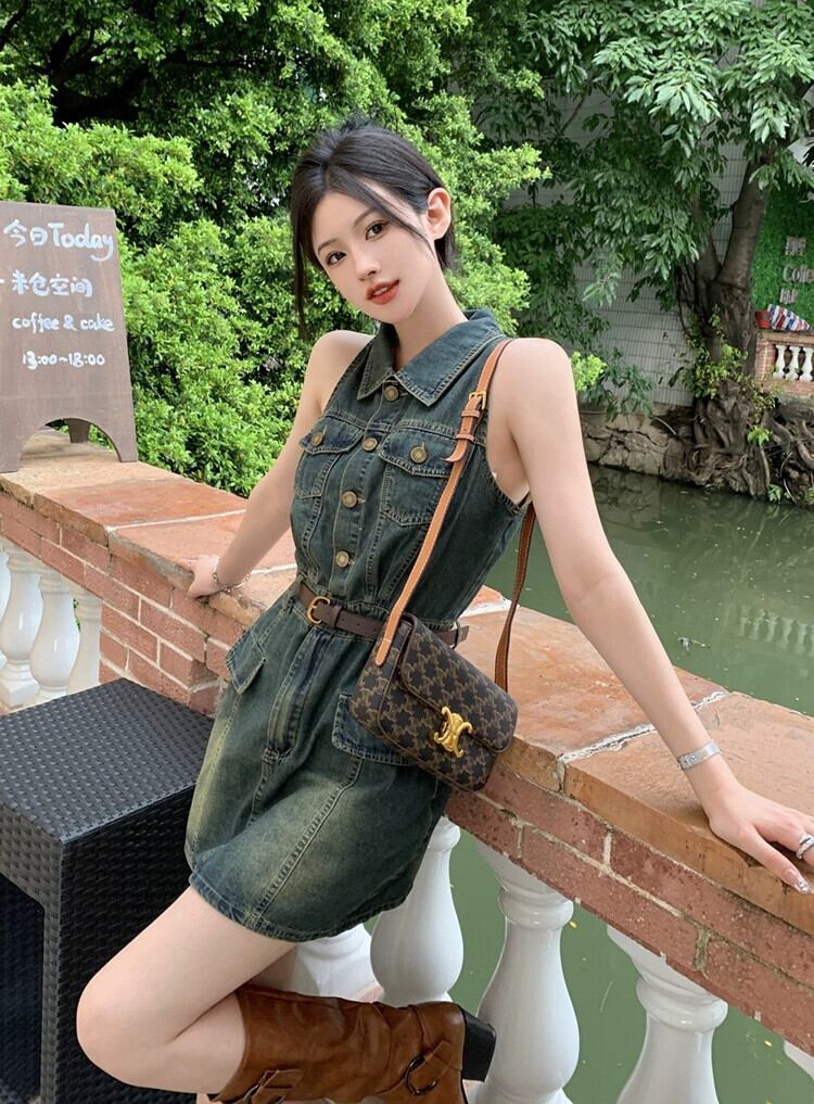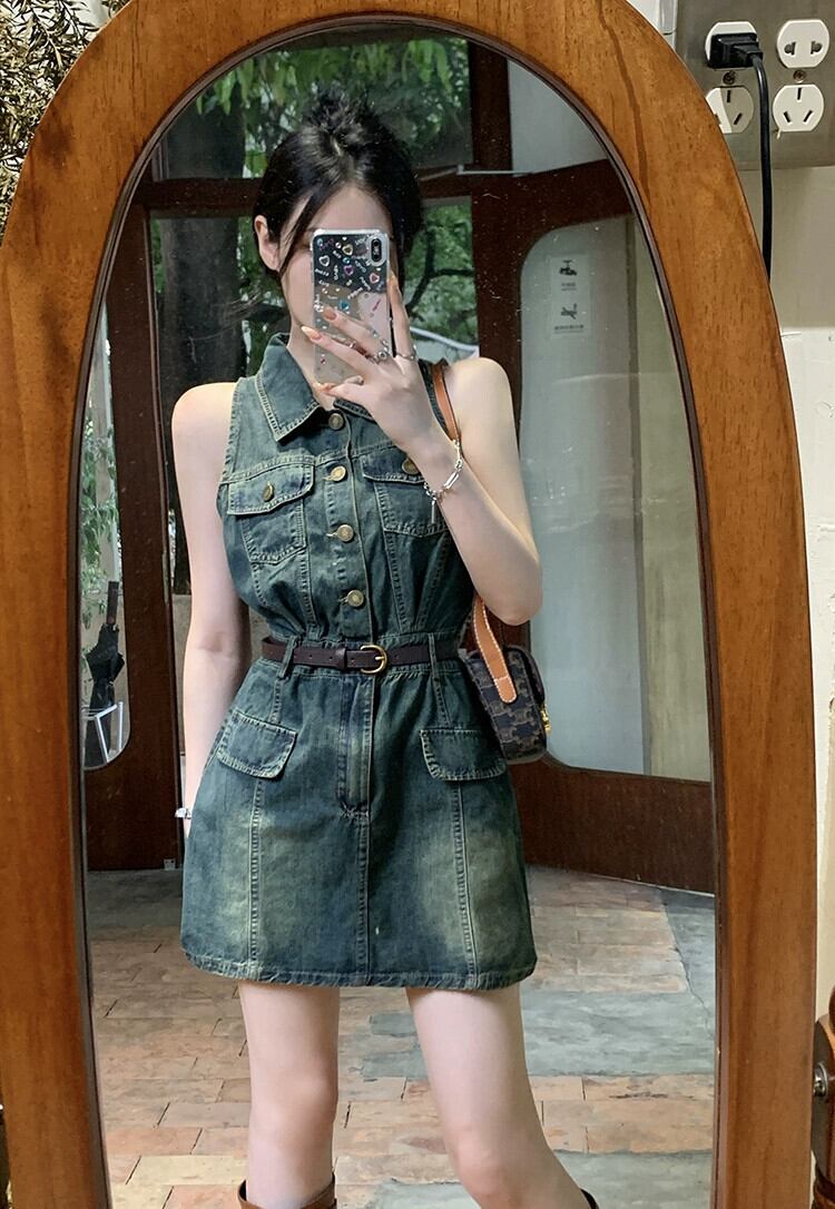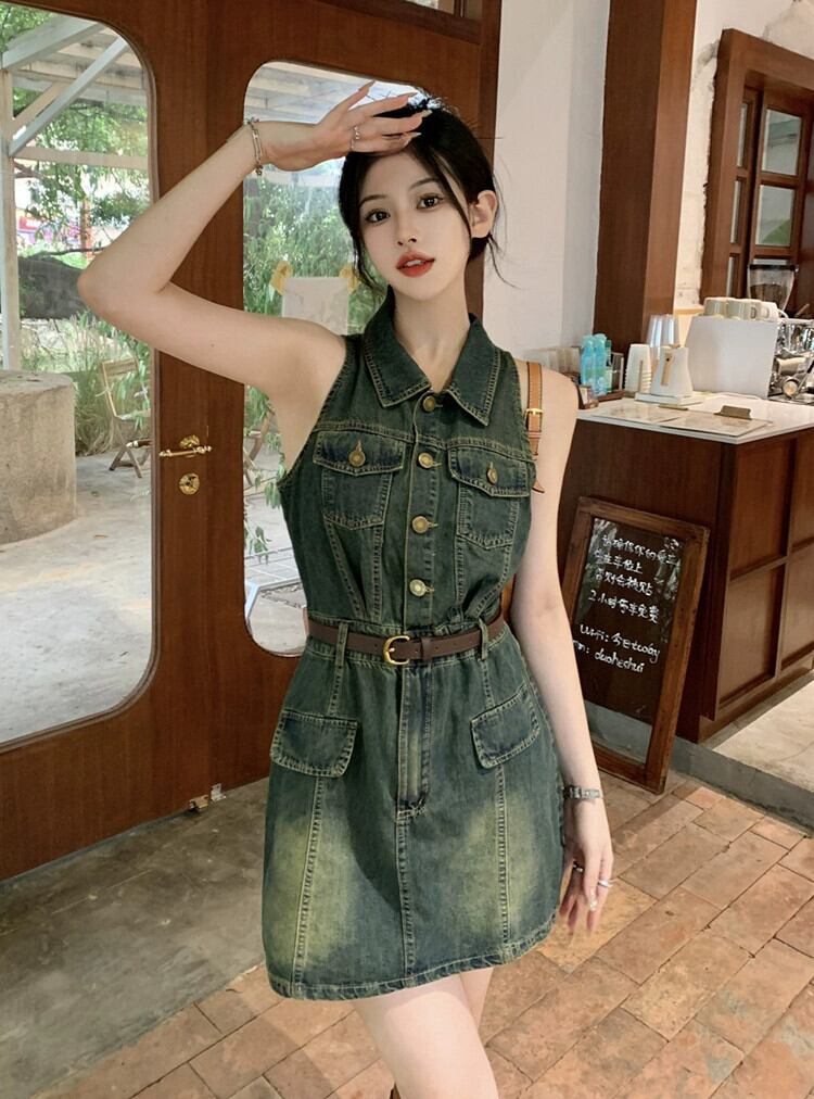 ポロ襟ノースリーブデニムベストドレス女性の夏香港スタイルのレトロなハイウエストスリムヒップショートスカート ハイウェスト サマー 夏物 missk34245146858