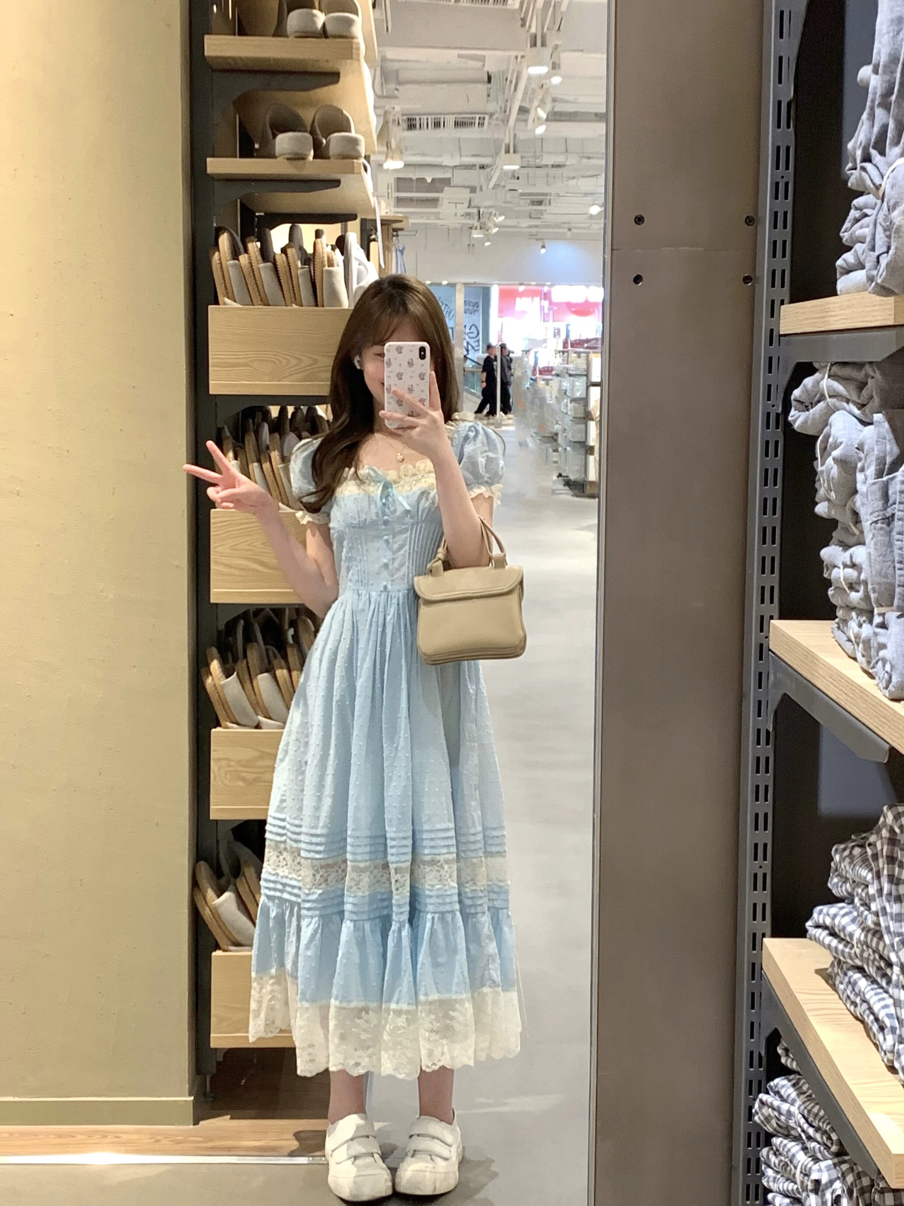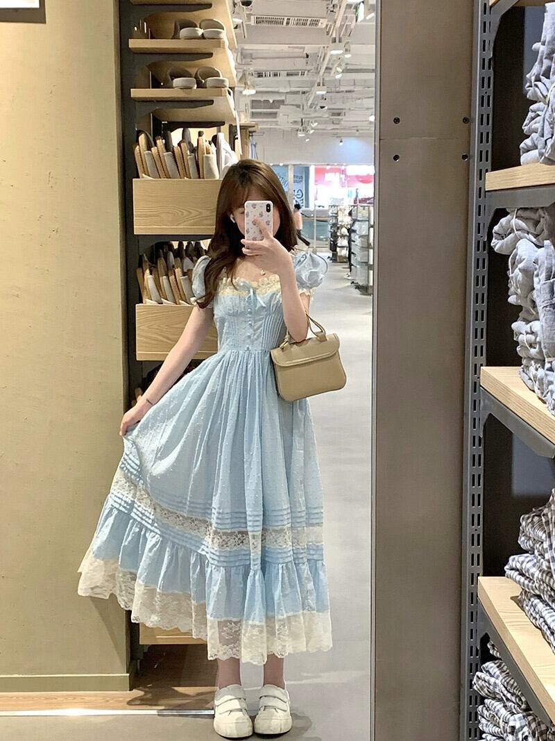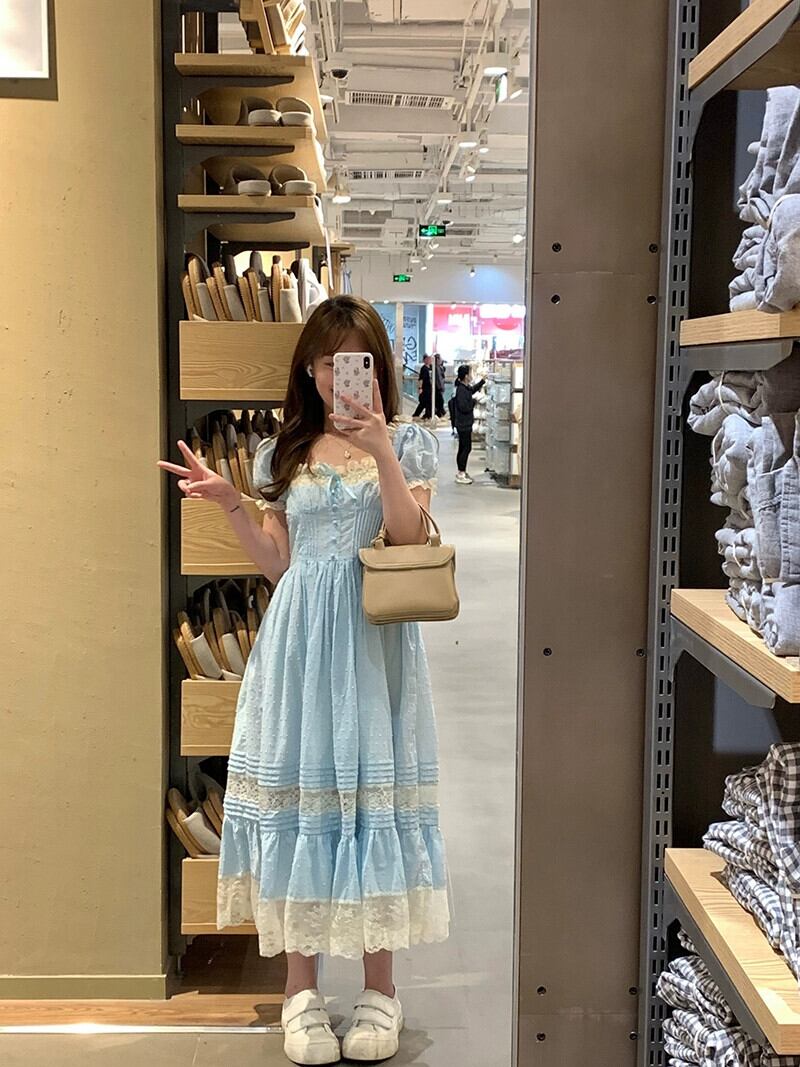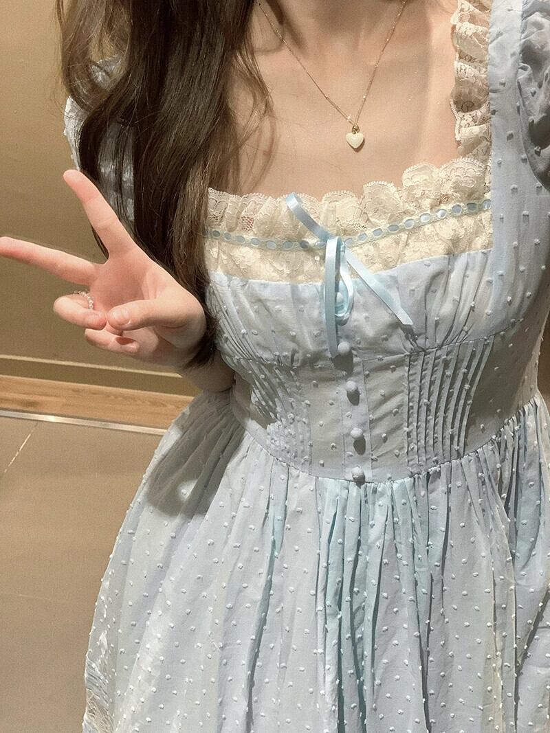 甘いプリンセススタイルのドレスの女性の夏の 2023 新しいレーススプライシングスクエアネックウエストスリムパフスリーブスカート 大人ガーリー スウィート キュート カジュアル サマー 夏物 スクウェア missk70341860987