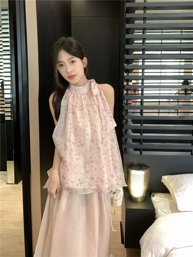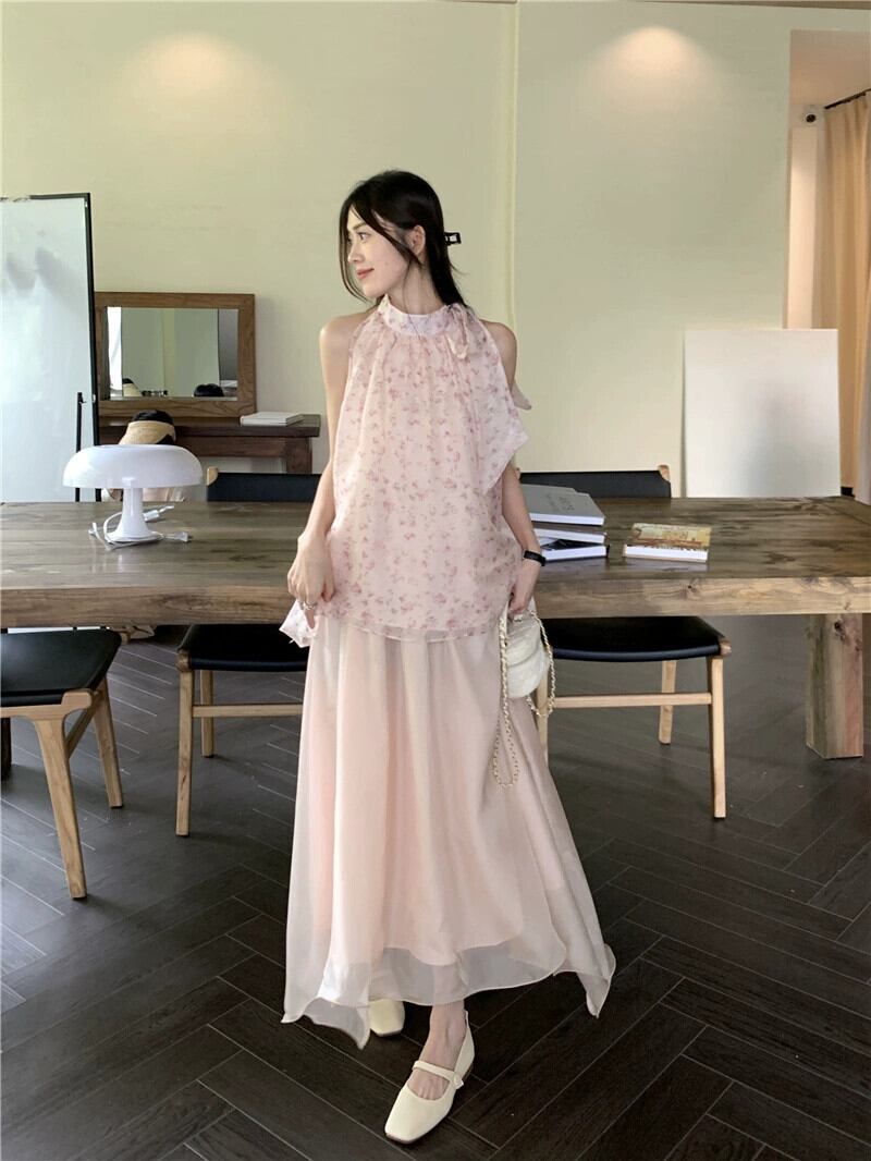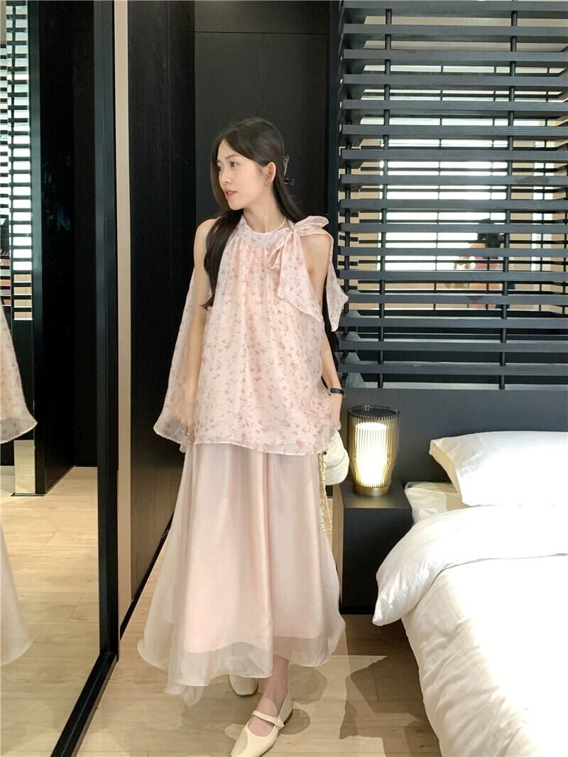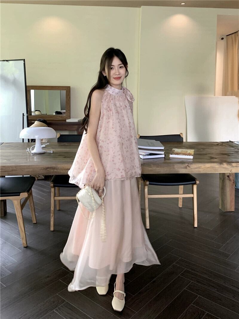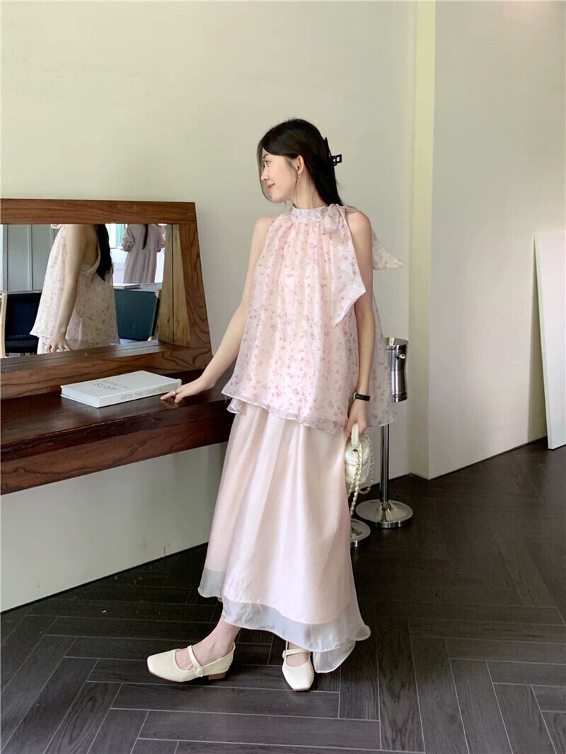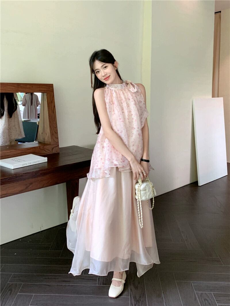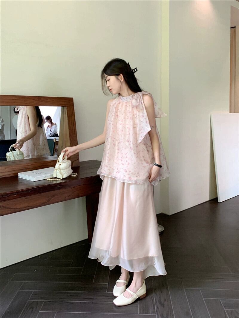 甘い初恋シックな花柄ノースリーブベストトップスーパーフェアリーネットガーゼスカート女性の夏のツーピーススーツトレンディな 大人ガーリー スウィート キュート カジュアル サマー 夏物 missk46911034935