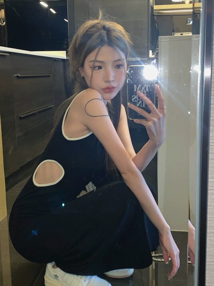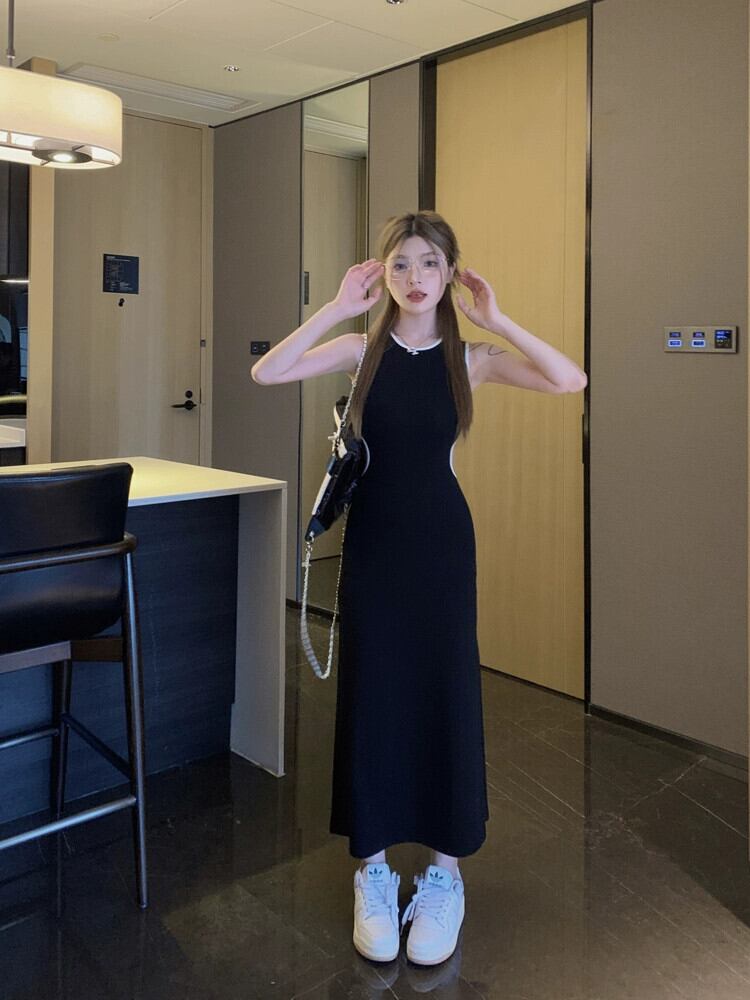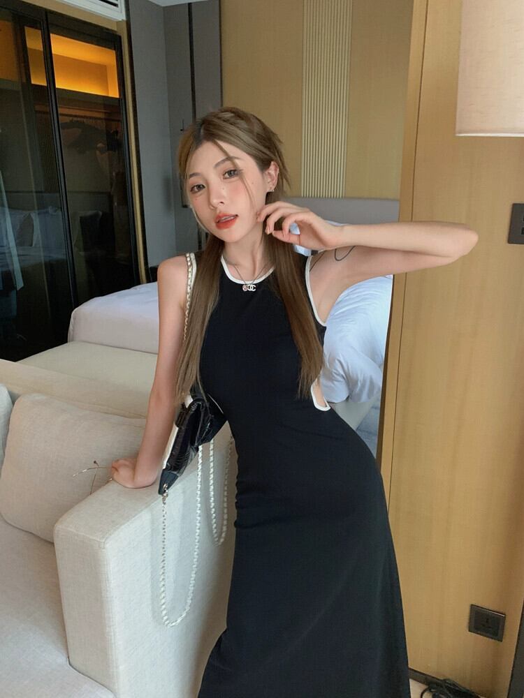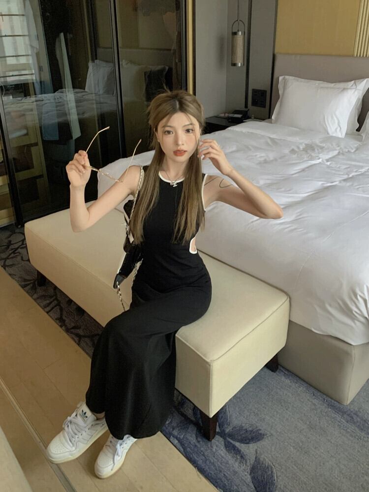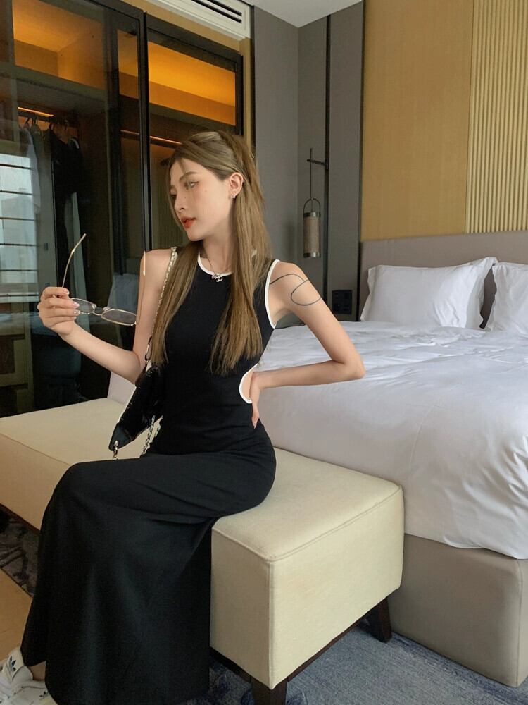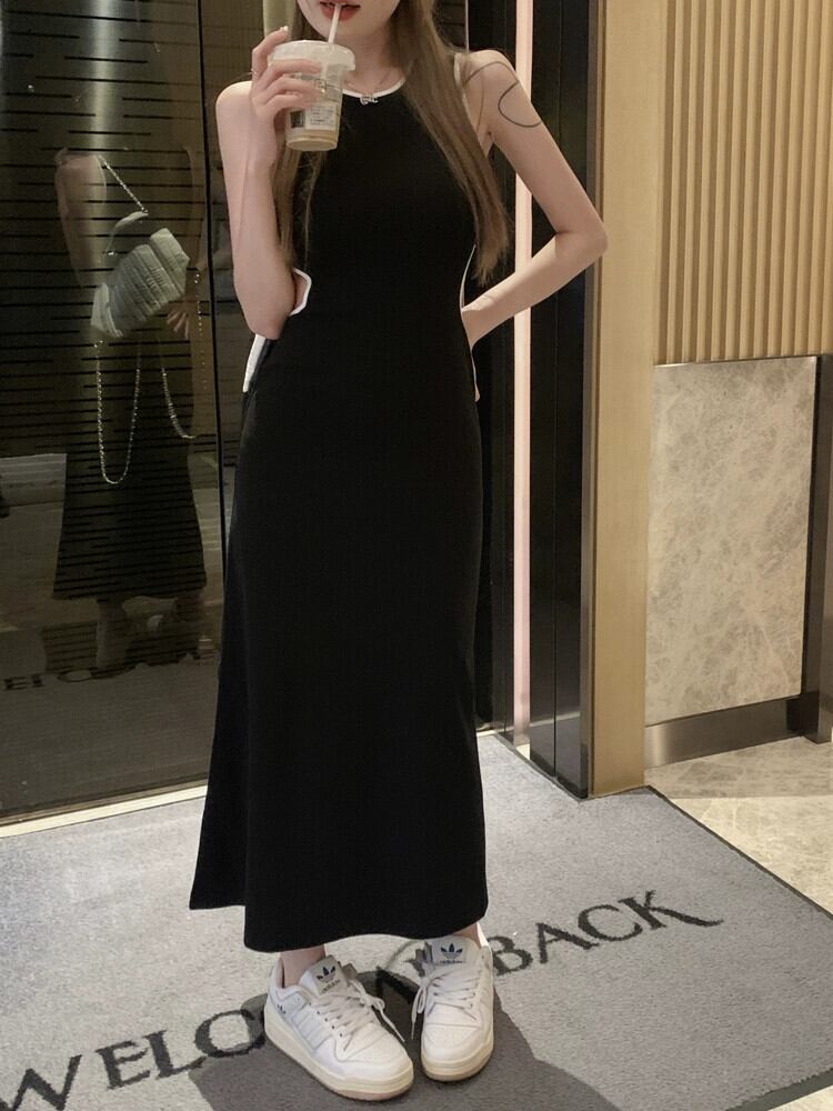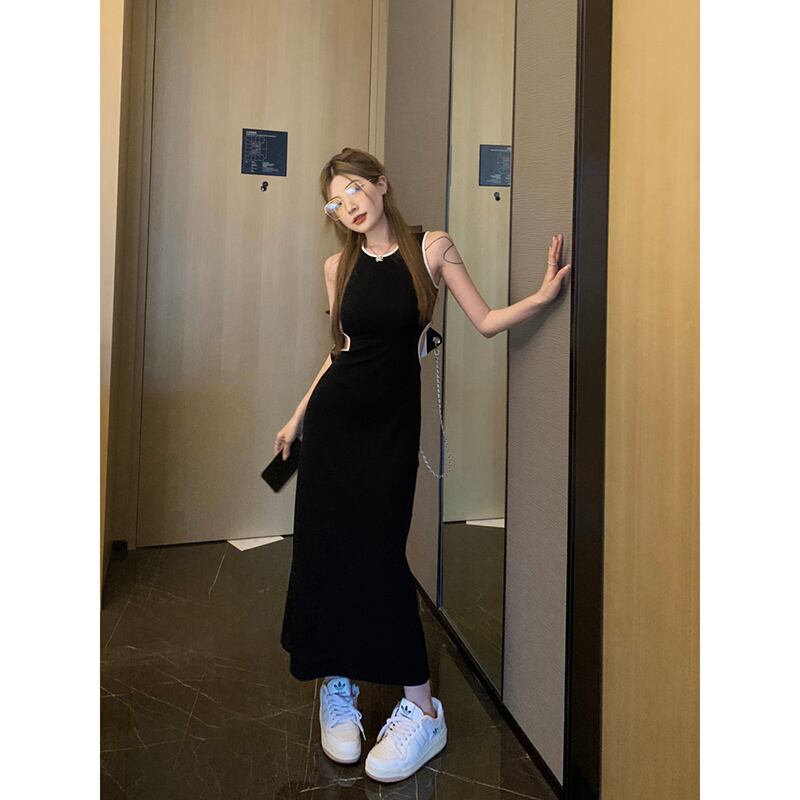 2023 夏の新バージョンのデザインセンスユニークなウエスト痩身黒ラウンドネックベストドレス婦人服 ブラック サマー 夏物 Oネック missk67041880822